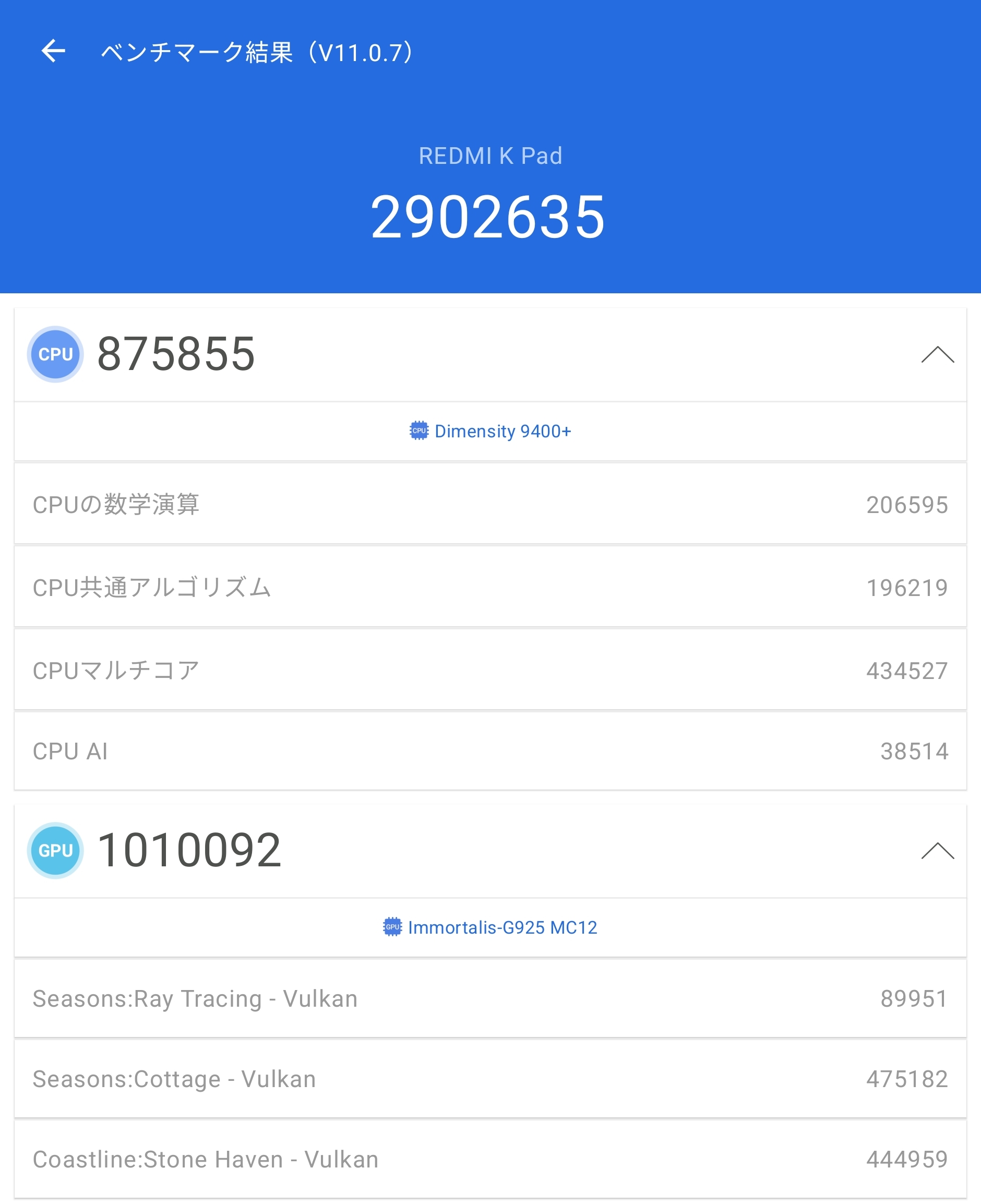 | CPU | MediaTek Dimensity 9400+、オクタコア、最大3.73GHz(1×X925 + 3×X4 + 4×A720) |