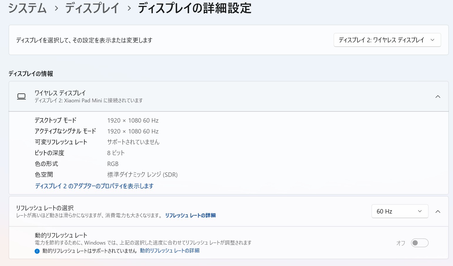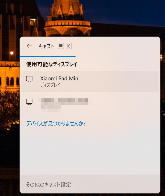 設定方法も非常にシンプル。PC側でWindowsロゴキー+Kを押してキャスト画面を開き、Xiaomi Pad mini側で「ワイヤレスディスプレイ拡張」機能を有効にして接続するだけ。数秒で接続が完了し、PCのサブディスプレイとして認識されます。接続した際には、Xiaomi Pad Miniが1920×1080/60Hzのディスプレイとして認識されました。