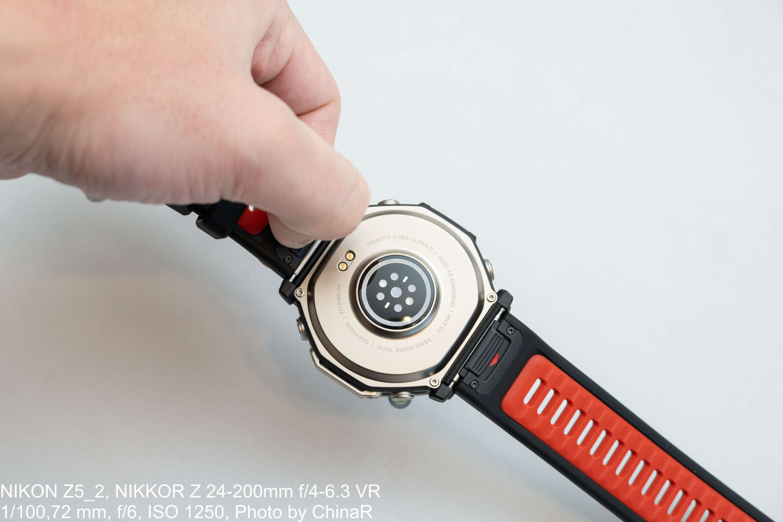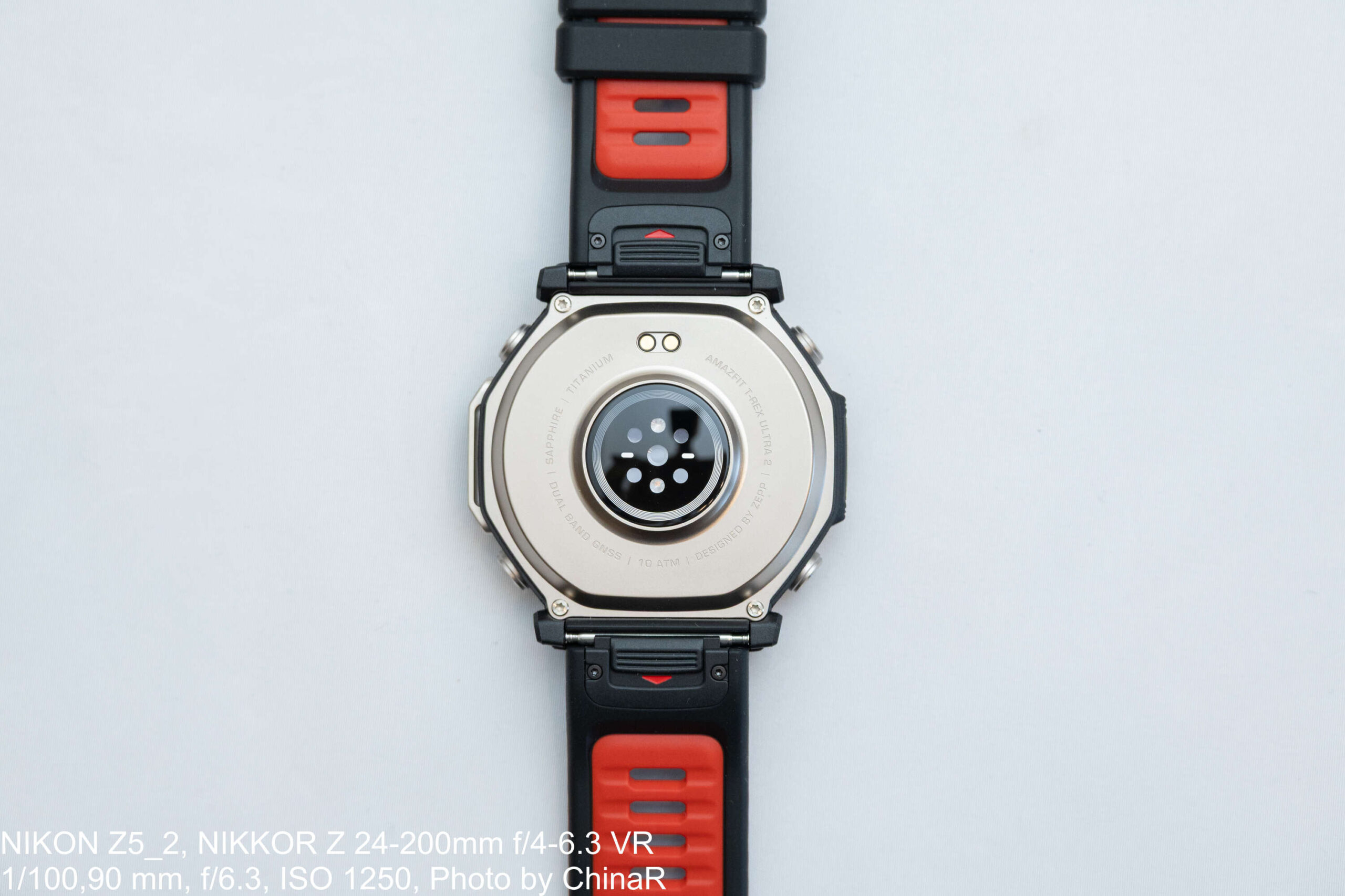 裏面には大型のPPGセンサー(BioTracker 6.0)と充電接点を配置。「TITANIUM ALLOY / 10 ATM / DUAL BAND GPS」の刻印が高級感を演出。ストラップは26mm幅のシリコン素材でクイックリリース機構を搭載しており、工具不要でワンタッチ交換が可能です。シーンに合わせて標準の黒ストラップと予備の黒×赤ツートンストラップを使い分けられます。