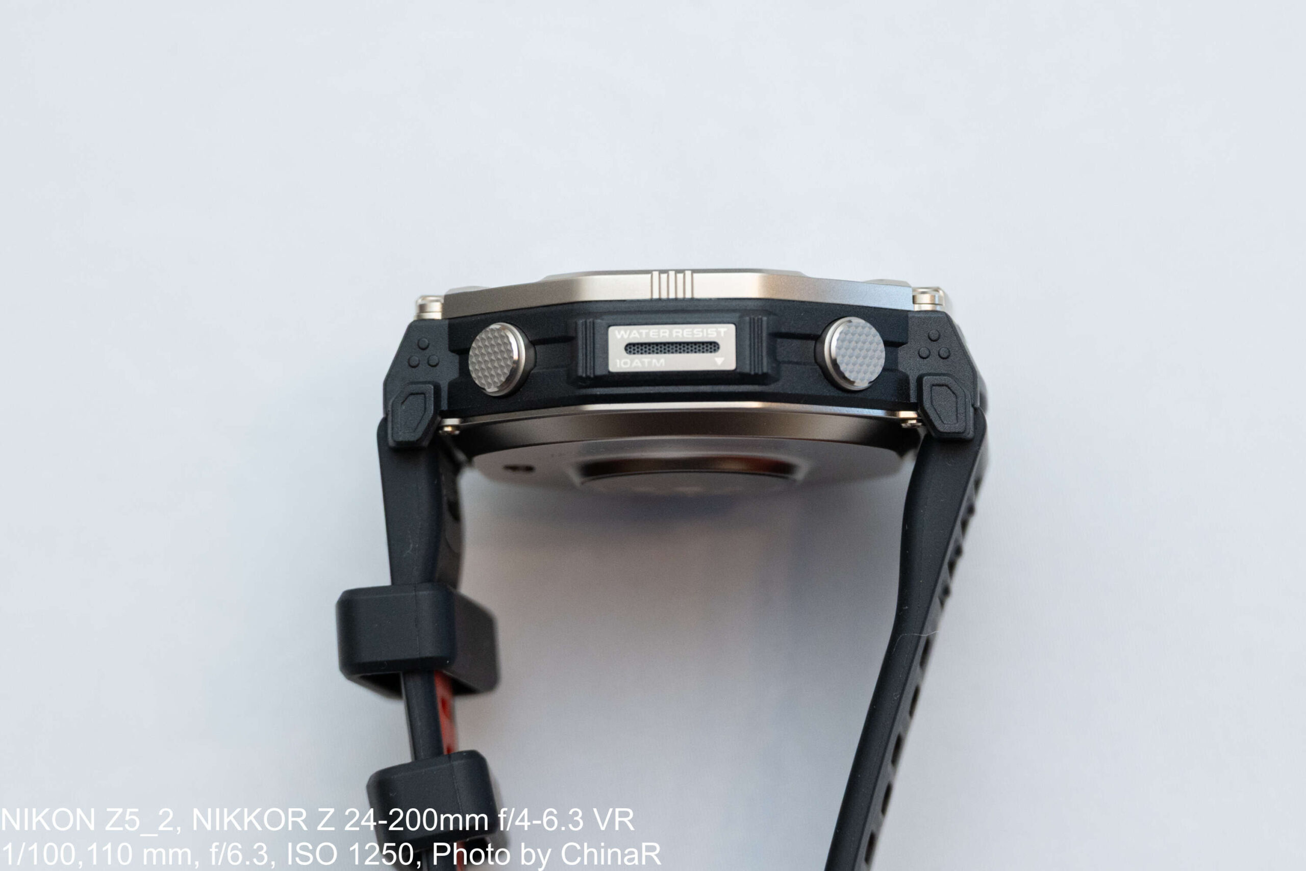 ただ、赤の差し色が派手に見えるようで、実際に装着してみると意外とシュッとしたまとまりのある印象です。ビジネスシーンでは少し迷うところですが、行けるっちゃ行けるデザインに仕上がっているかなと。ベゼルとボタンにはGrade5チタン合金を採用しており、高級感と堅牢性を両立しているのもポイントです。