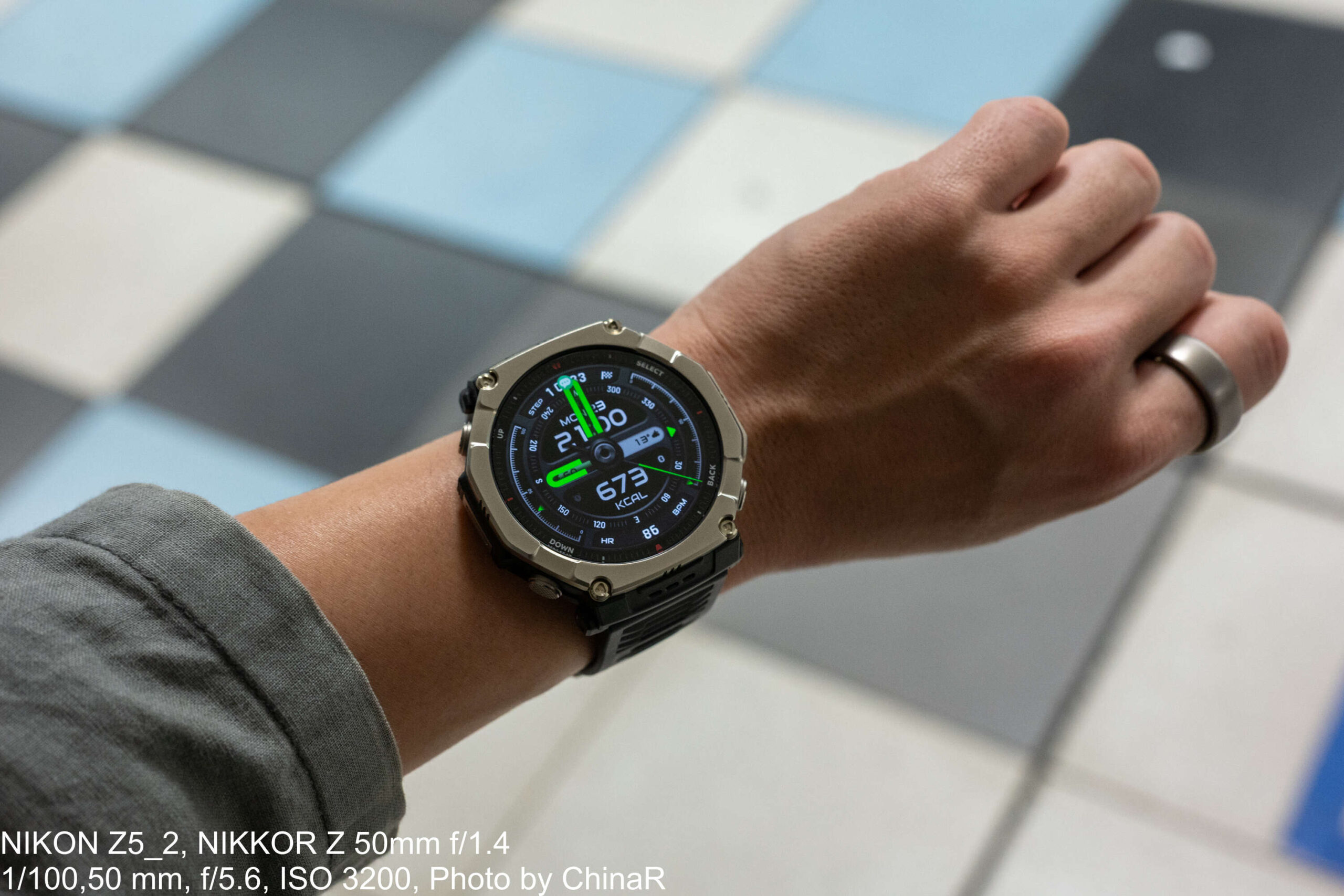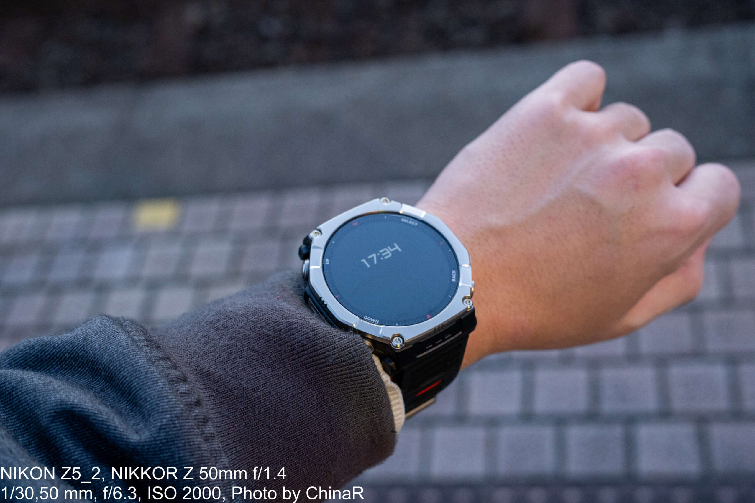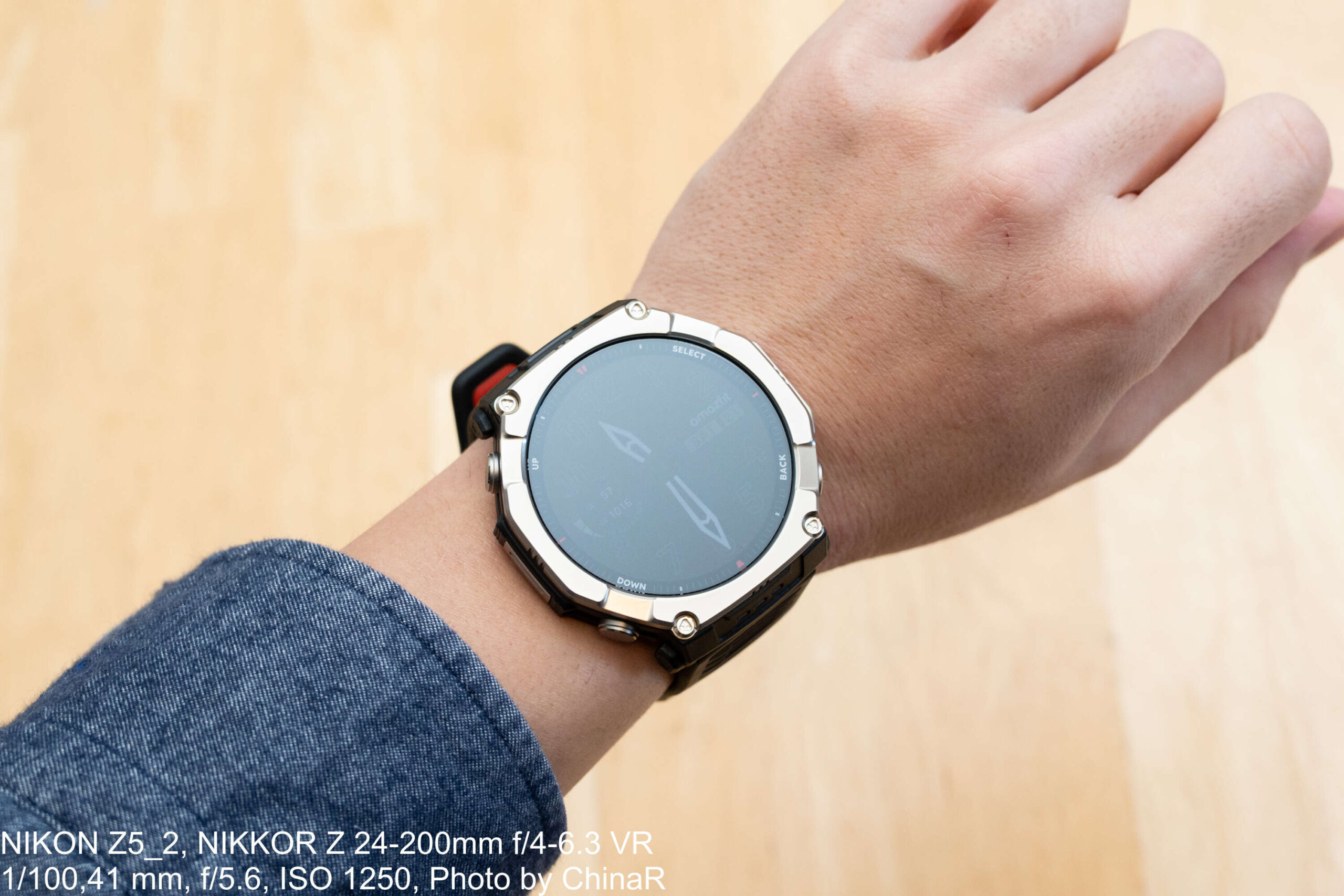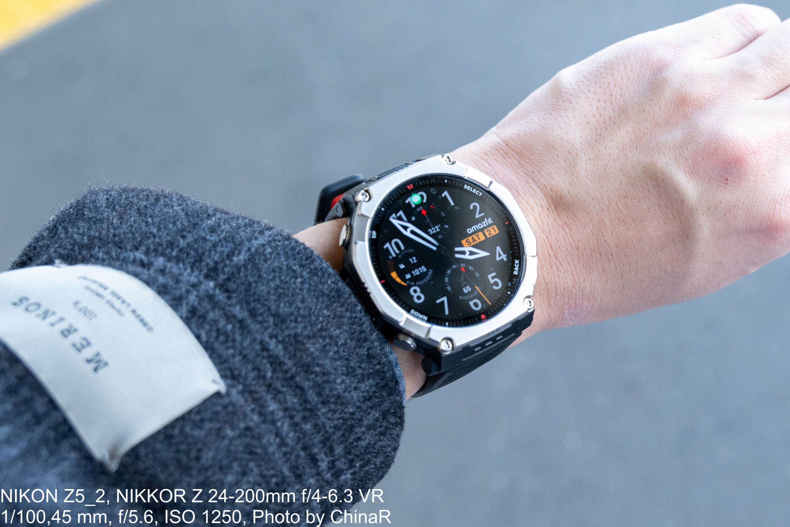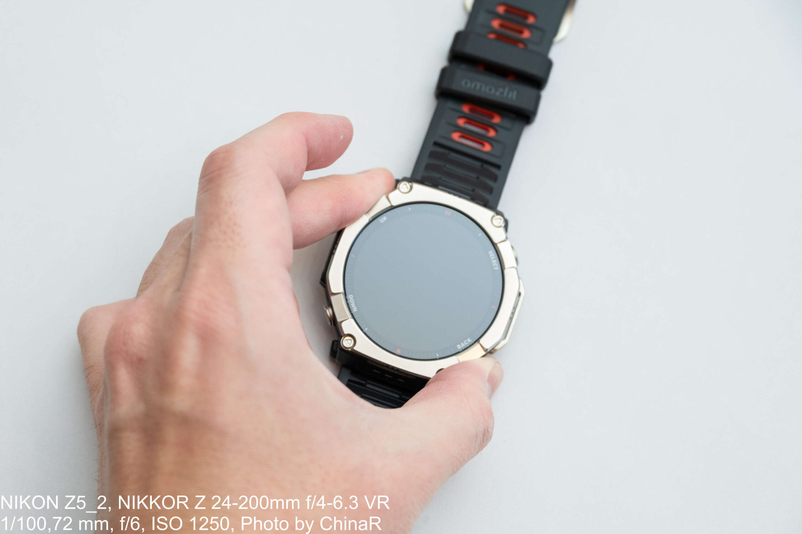 手に取った第一印象は「なかなかゴツい」の一言です。51×51×14.3mmというケースサイズはストラップ込みで89.2gの重量があり、普段使いしているAmazfit Active MAXと比べても明らかに大きいサイズ感。シャツの袖口に引っかかるほどの存在感があり、まさにアウトドア向けの本格的なスマートウォッチという印象を受けました。