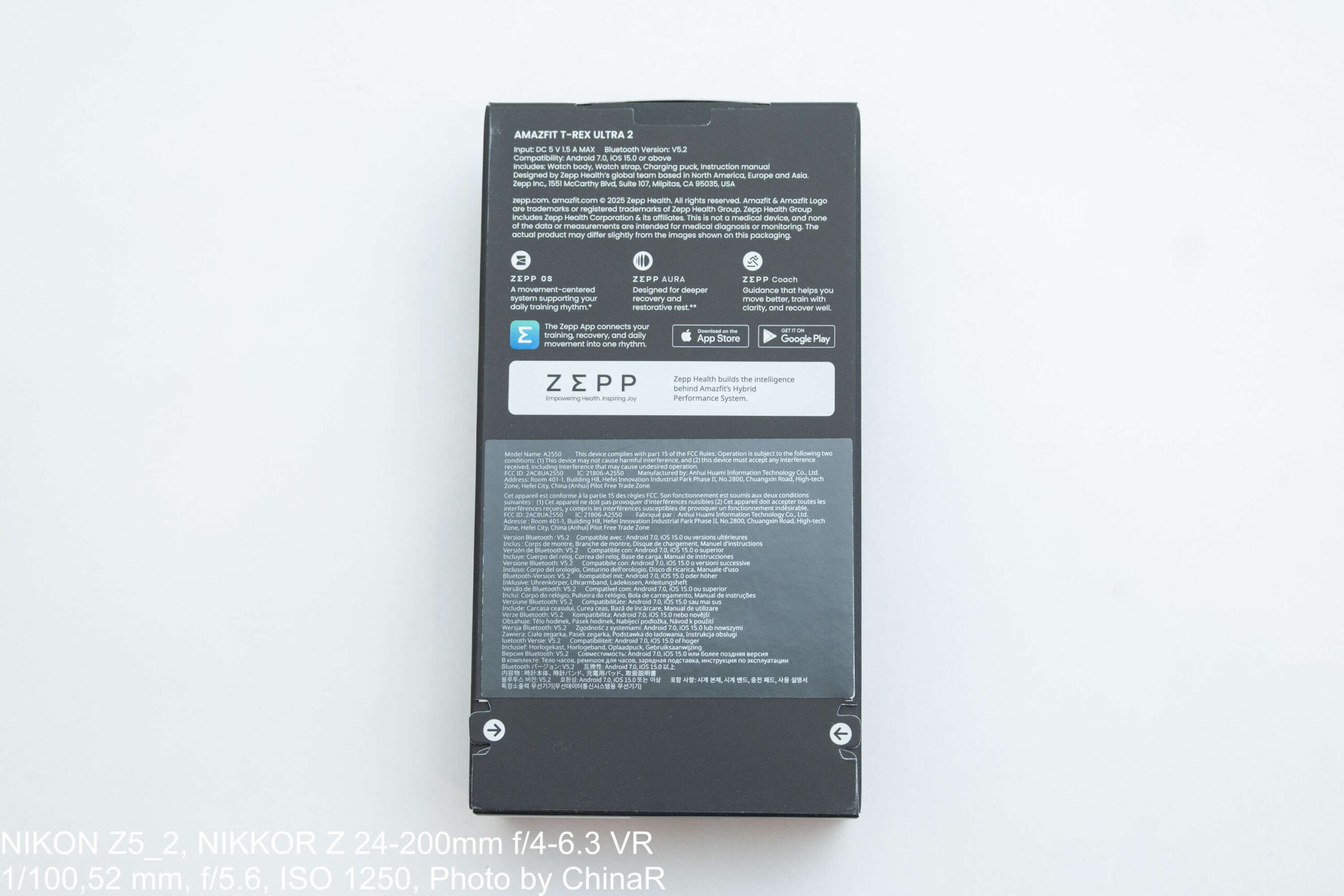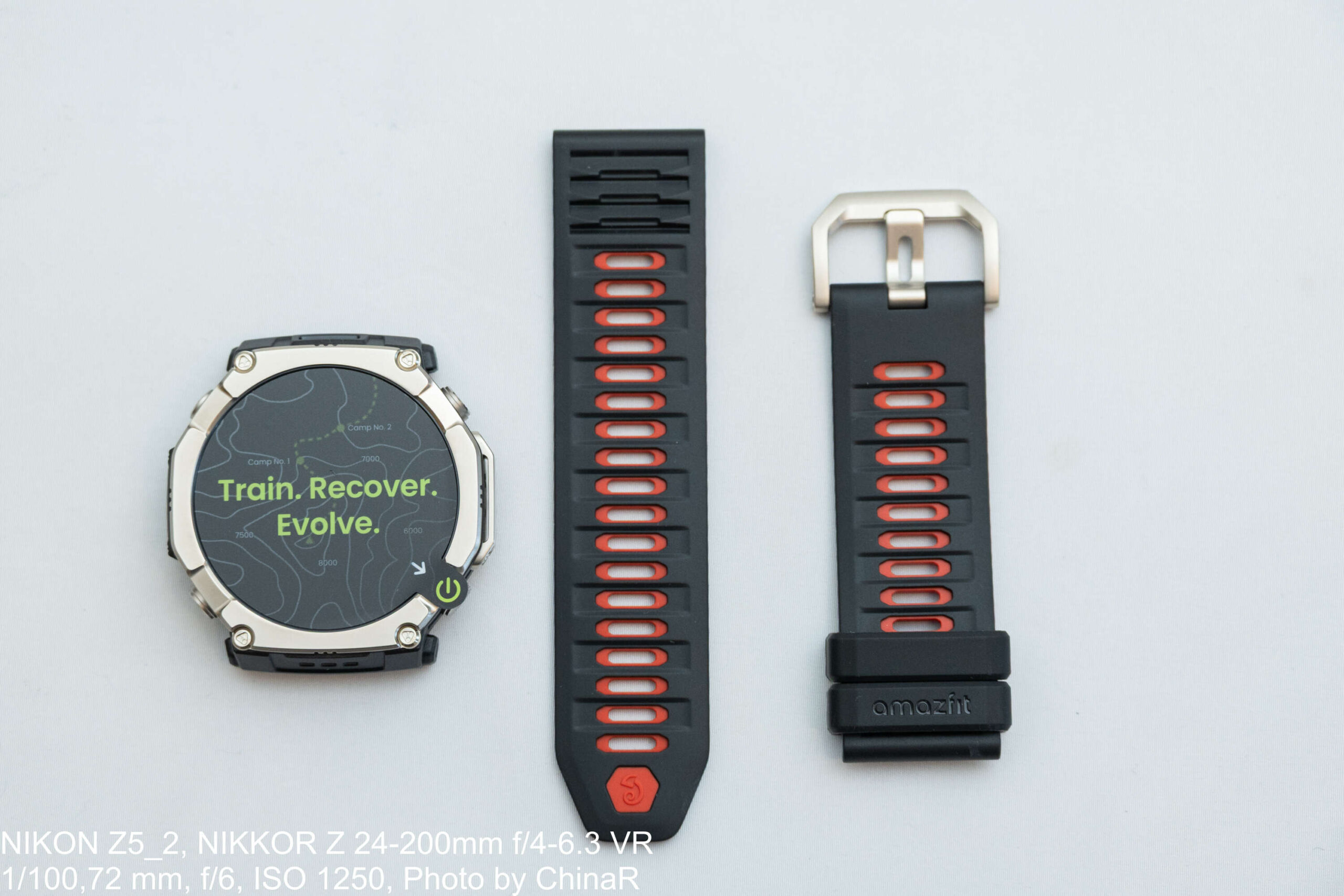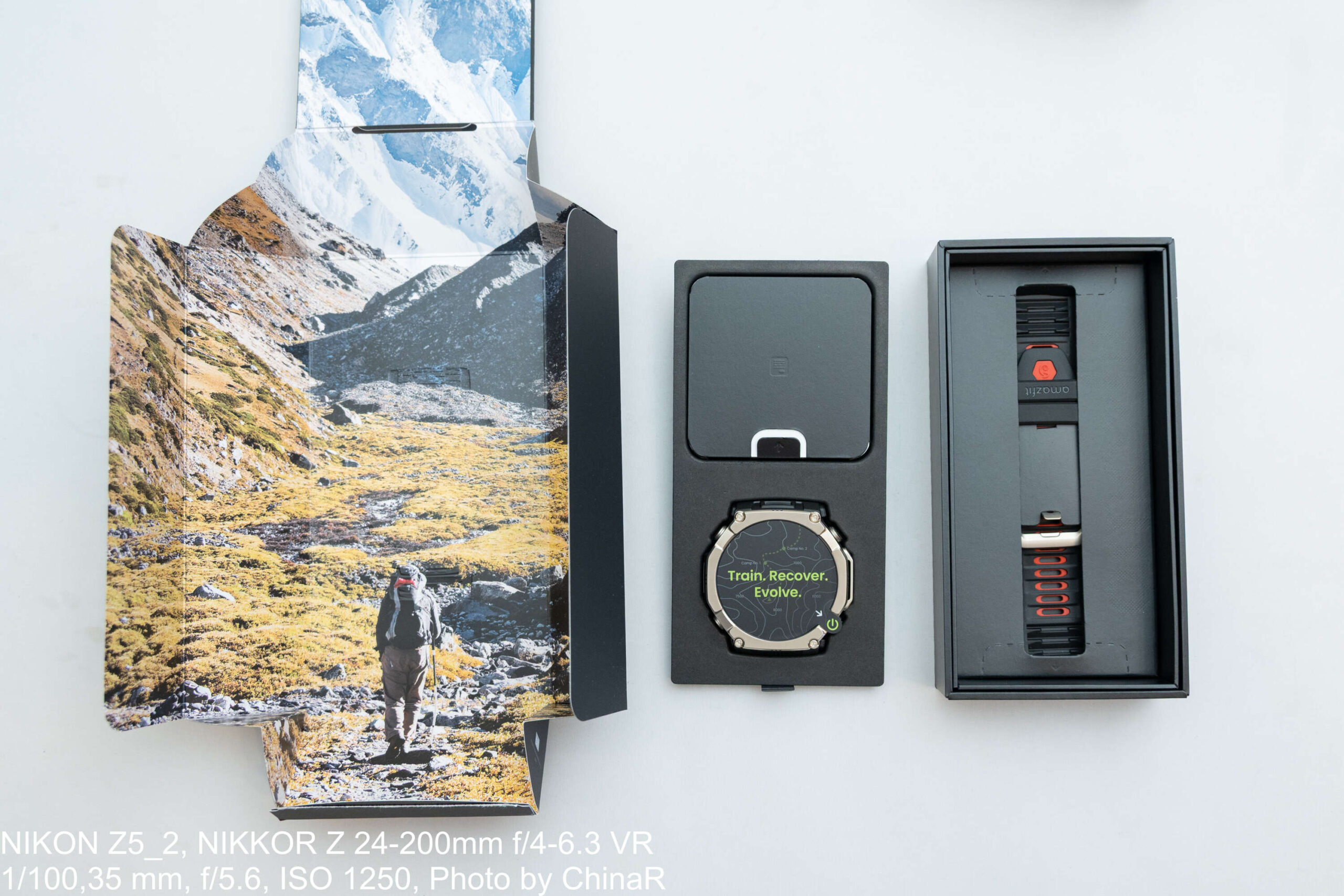 Amazfit T-Rex Ultra 2のパッケージはマットブラック仕上げ。背面にはZepp OS/Zepp Aura/Zepp Coachのアイコンとともに10ATM防水・EN13319認証の記載が確認できます。開封すると、登山風景が描かれたカードとともに、ディスプレイに「Train. Recover. Evolve.」のメッセージが表示された時計本体が登場。予備の黒×赤ツートンストラップも同梱されていました。