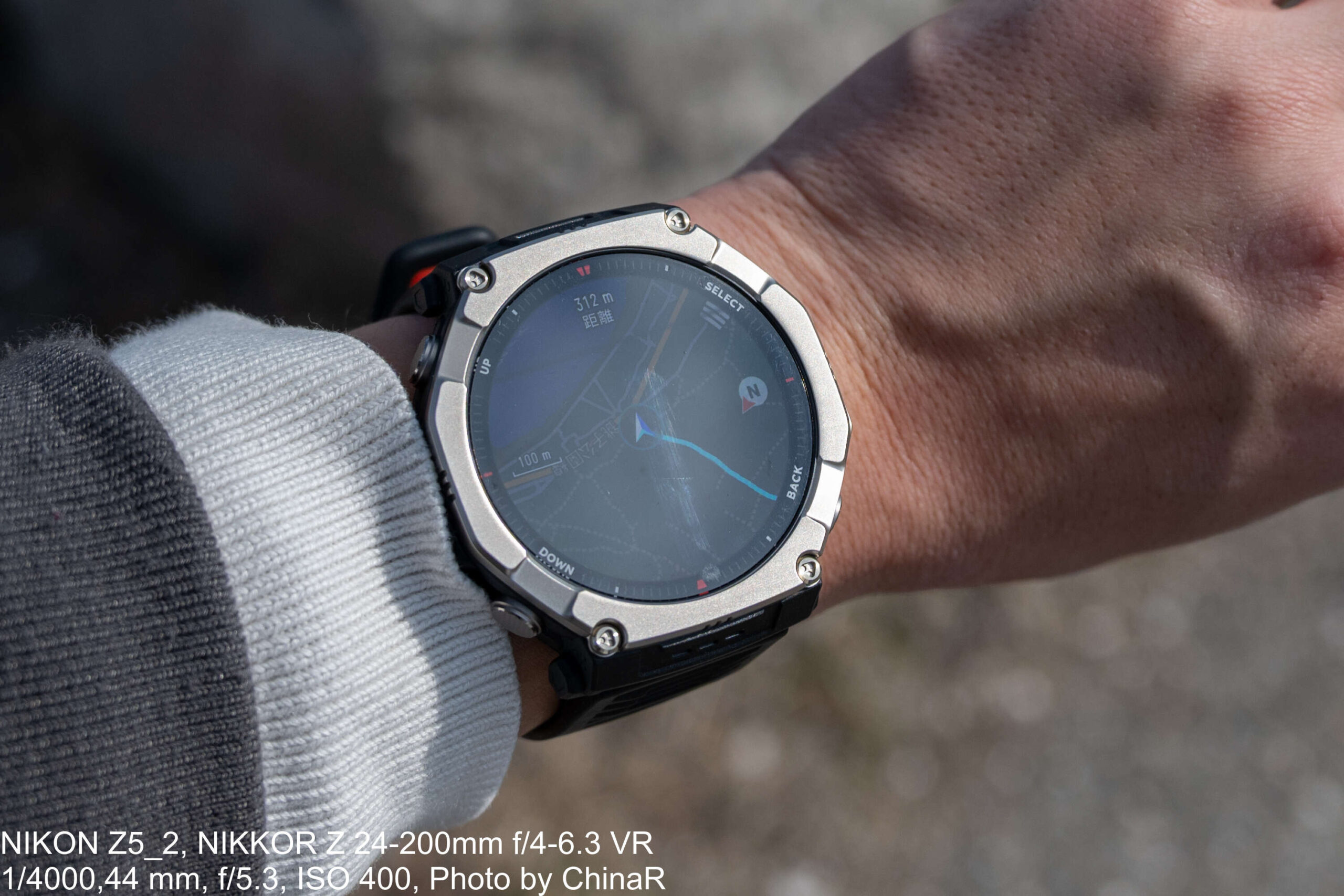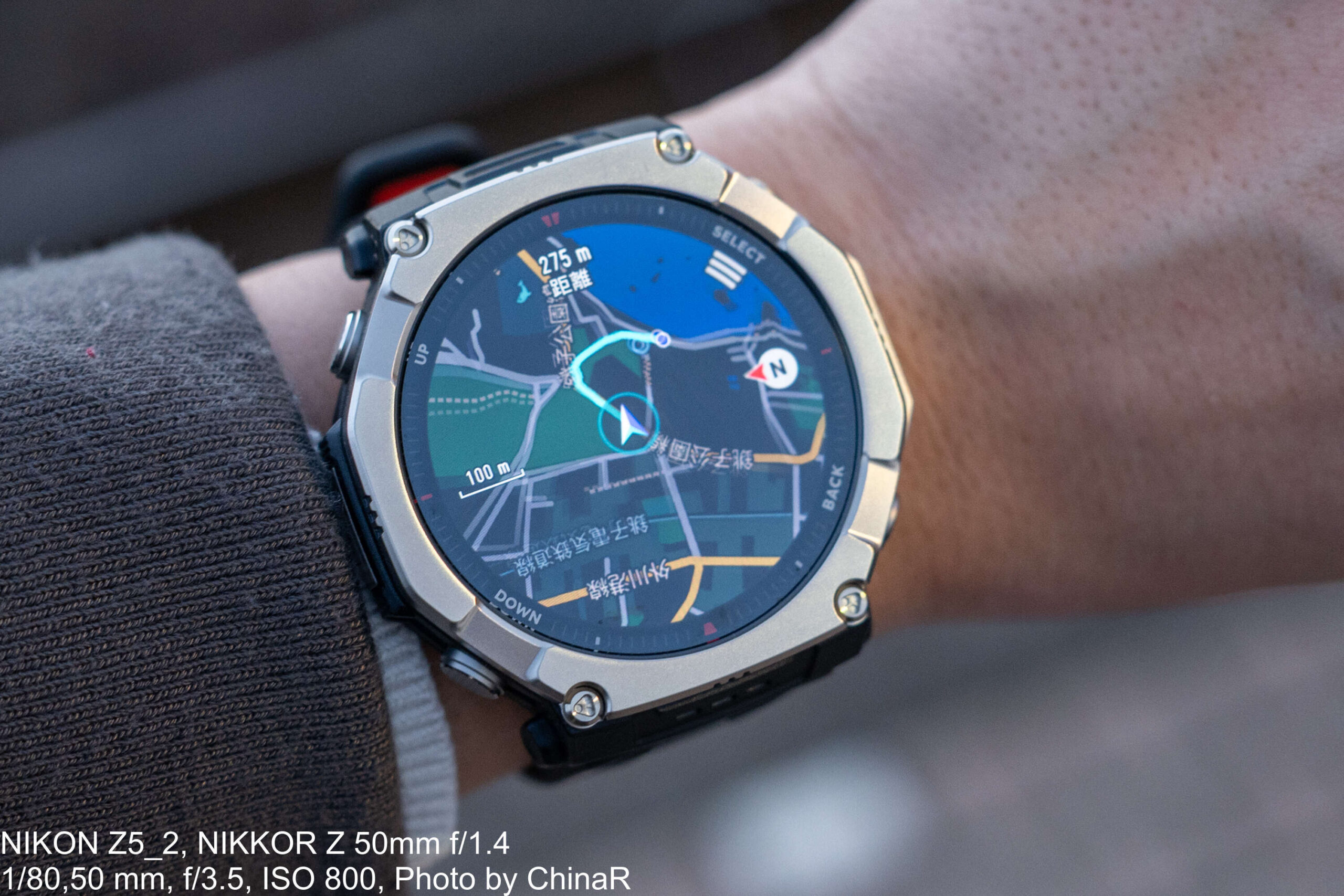 実際に銚子で使用した際には、駅から海までのルートを手元の地図で確認しながら移動できました。カラフルな地図表示は1.5インチのAMOLEDディスプレイでも十分に視認でき、275mや100mといった距離とともにルート案内を表示してくれます。正直なところ、日常使いではスマートフォンの地図アプリで足りてしまいますが、山登りのようにスマートフォンを取り出しにくいシーンでは手元で地図を確認できる安心感は大きいかなと。