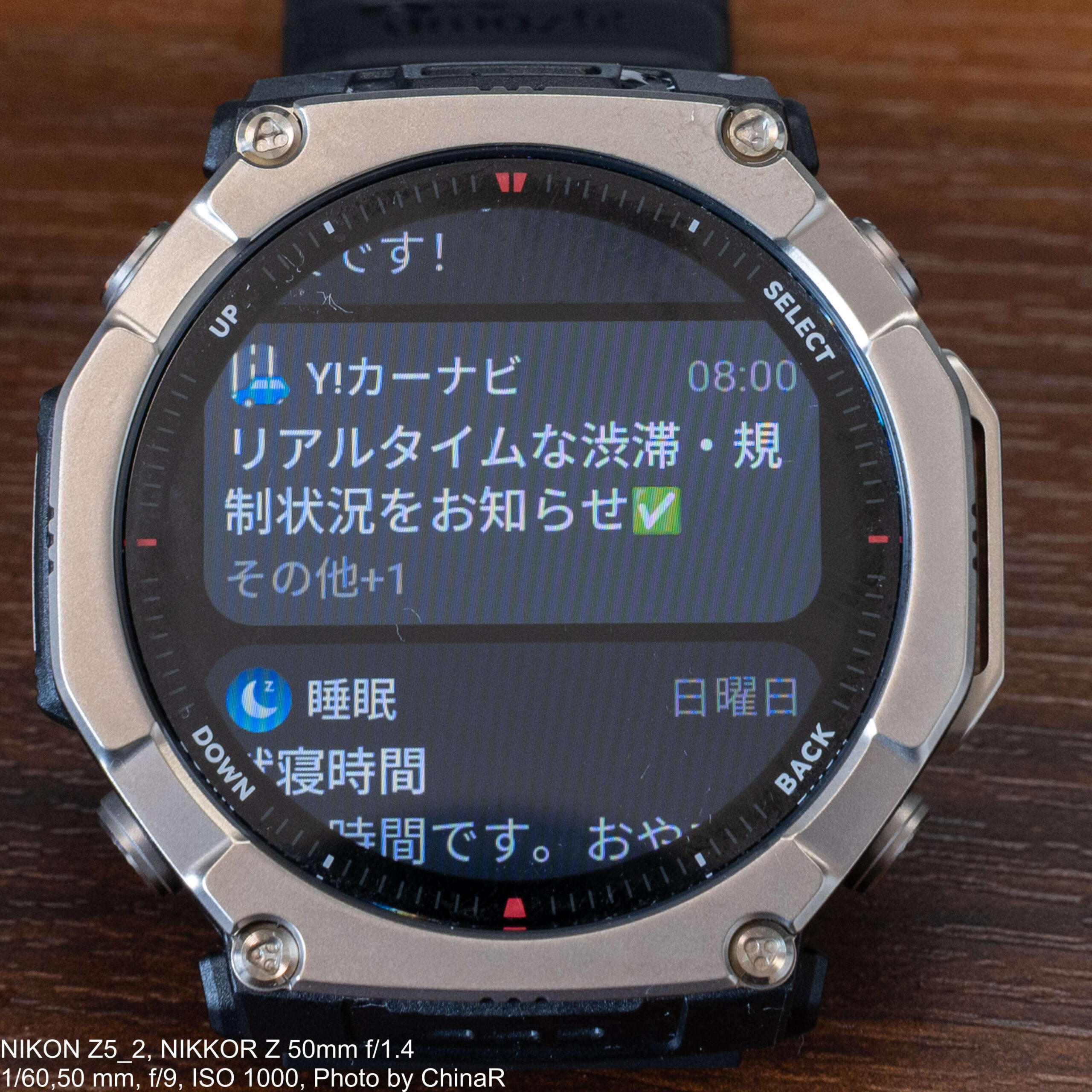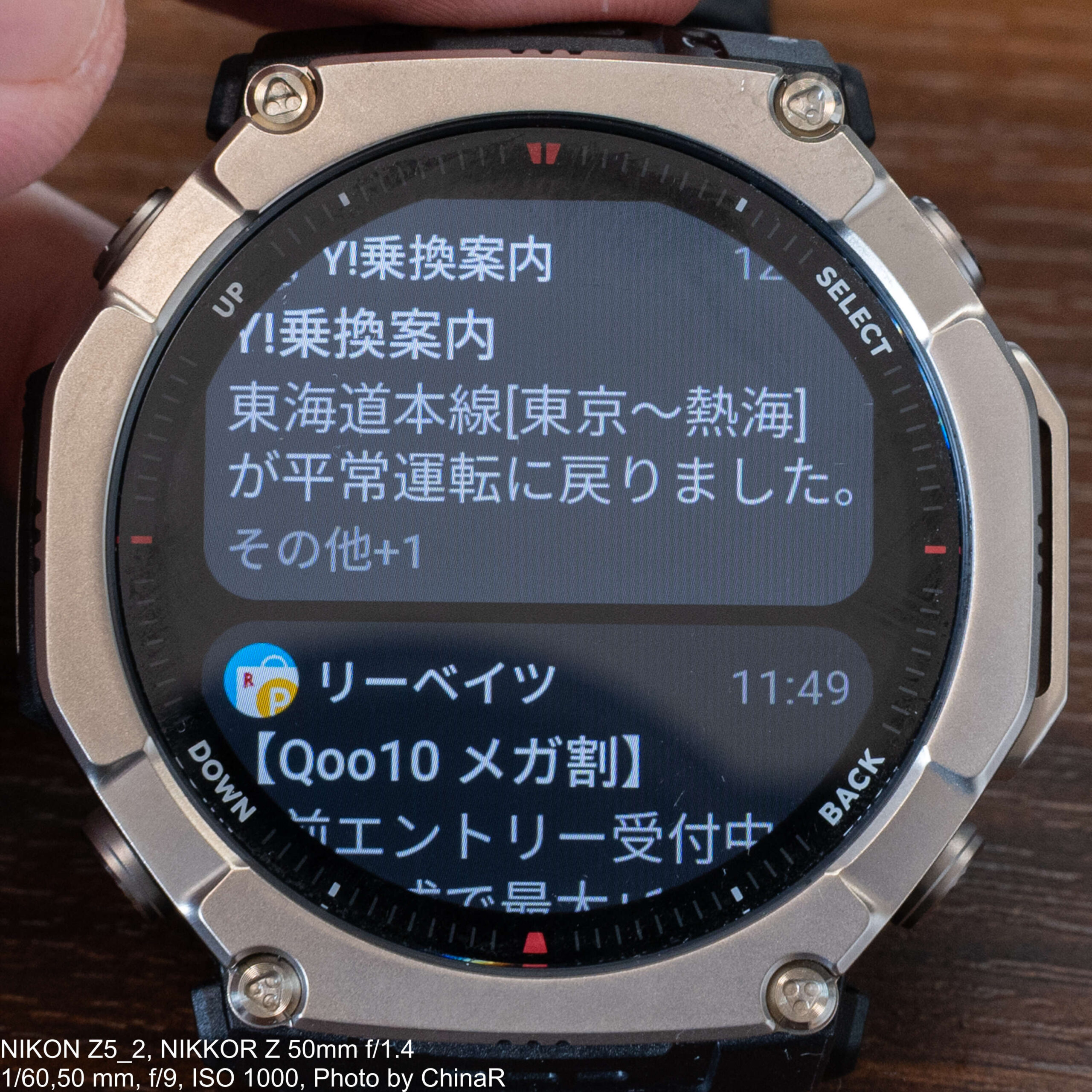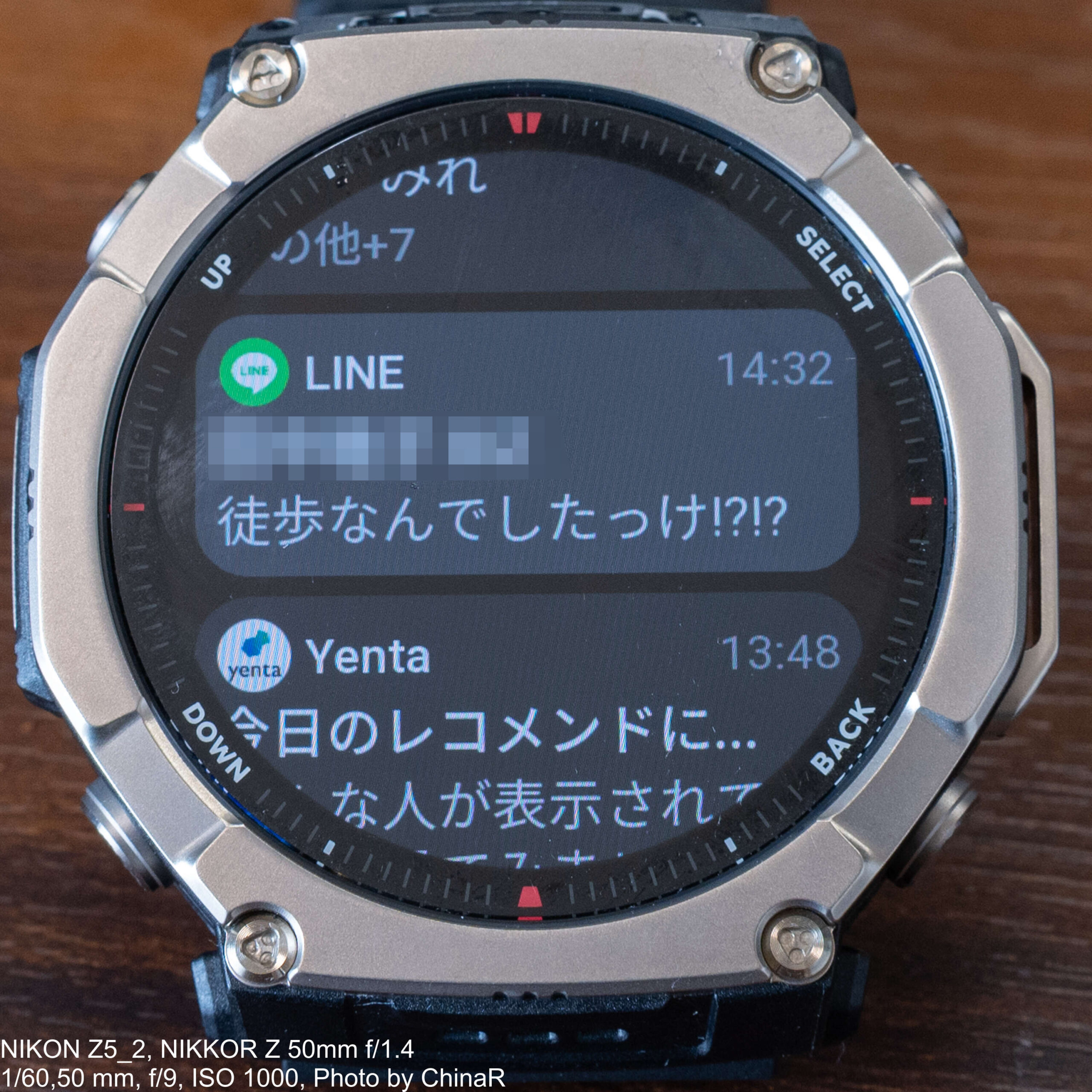 通知機能についてはLINEやChrome、Y!乗換案内などの各種アプリ通知がリアルタイムで手元に届きます。3,000nitの高輝度ディスプレイのおかげで、直射日光下でも通知内容の確認が快適に行えました。
