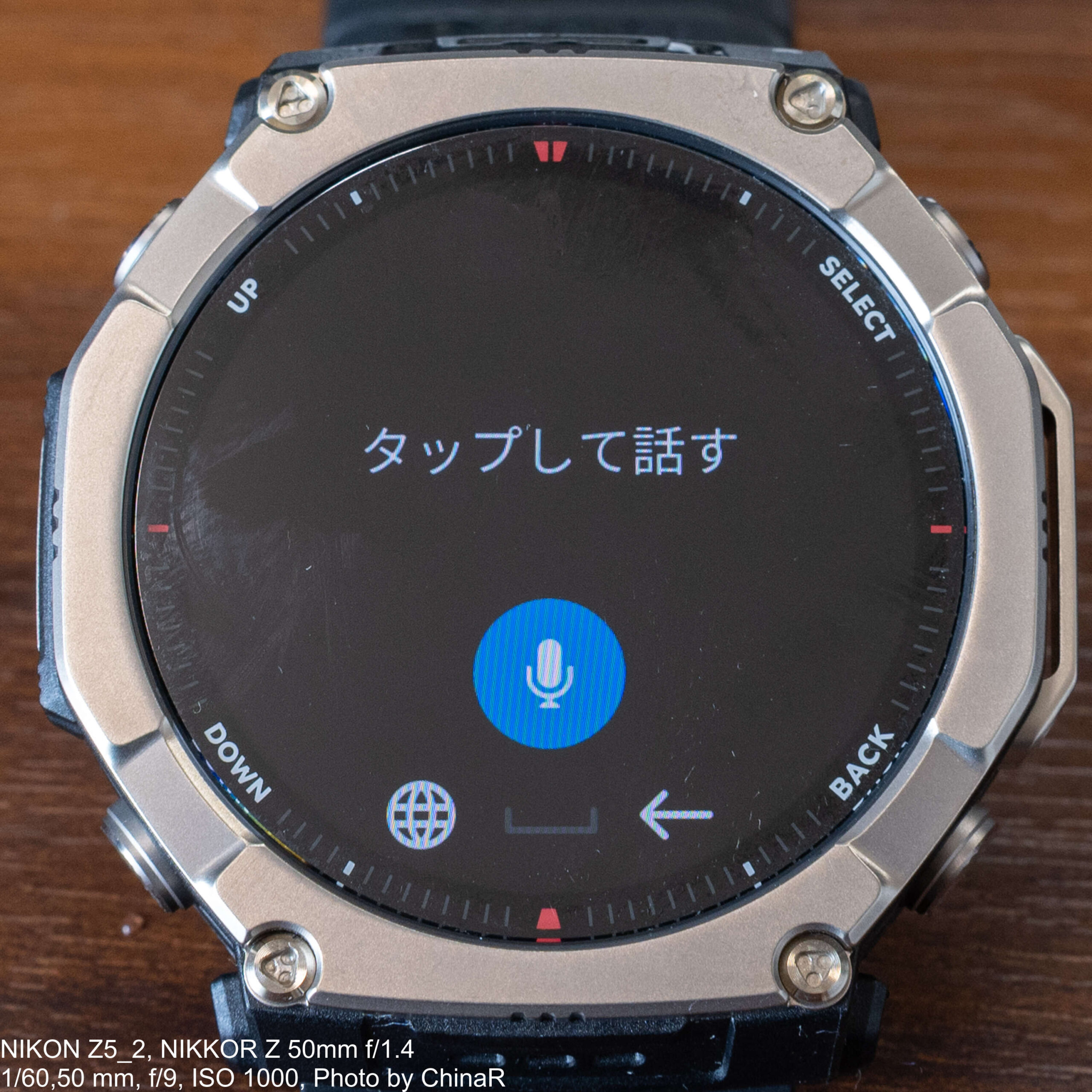 特に秀逸なのが音声入力による返信機能です。「タップして話す」をタップして話しかけると、音声認識が日本語テキストを自動入力してくれます。上の写真では「イエス徒歩でございます。」としっかり漢字変換まで対応して入力しているのが確認できます。認識結果を確認してからチェックマークで送信できるため、誤変換があってもやり直しが可能。1.5インチの小さな画面ではキーボード入力は現実的ではないため、この音声入力が最も実用的な返信手段という印象でした。