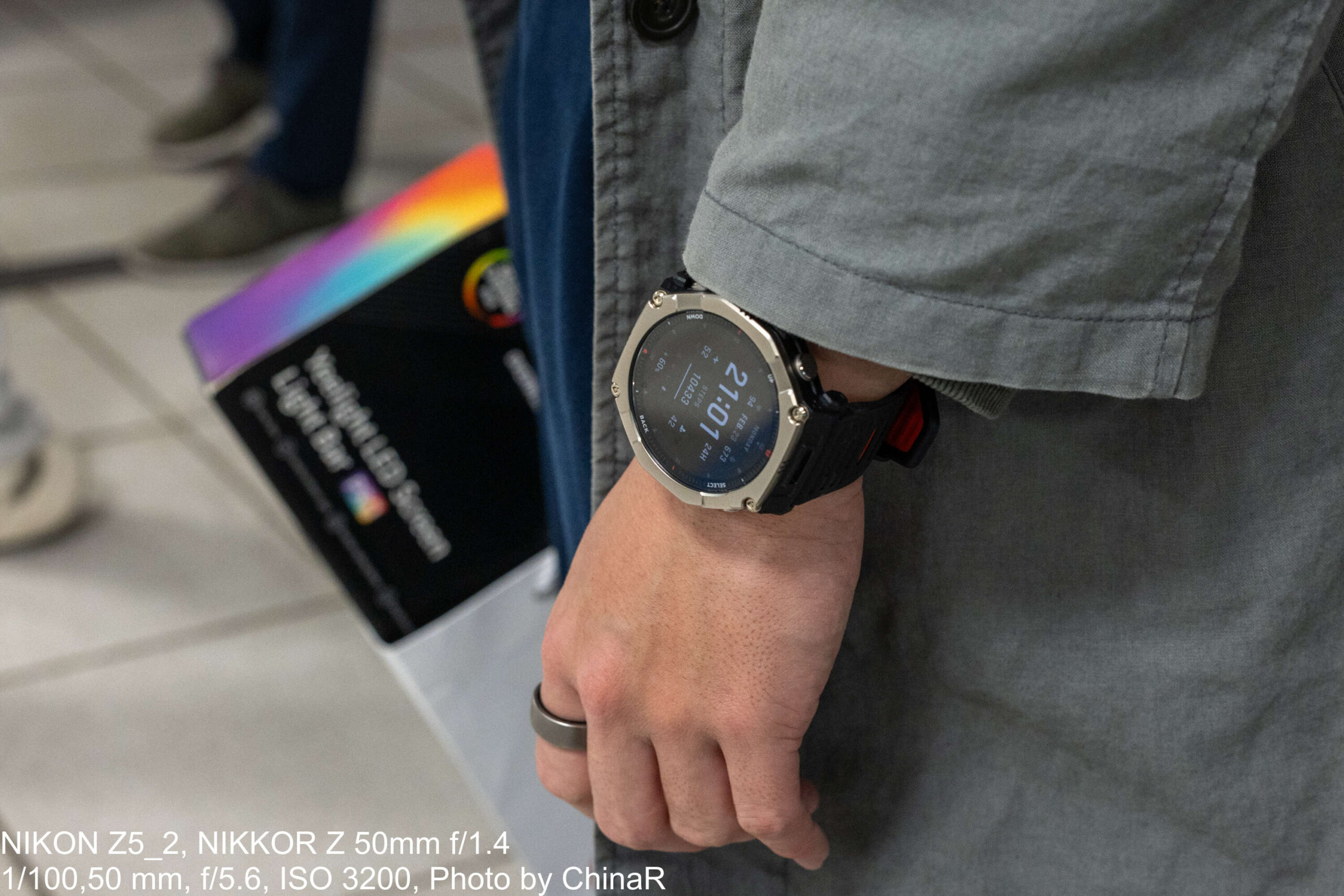 駅ホームでの撮影では、AMOLEDの鮮やかな発色がよくわかります。デジタル文字盤では日付、時刻(秒単位)、歩数10459歩、心拍数、バッテリー60%まで一画面に集約しており、視認性の高さは夜間でも健在です。
