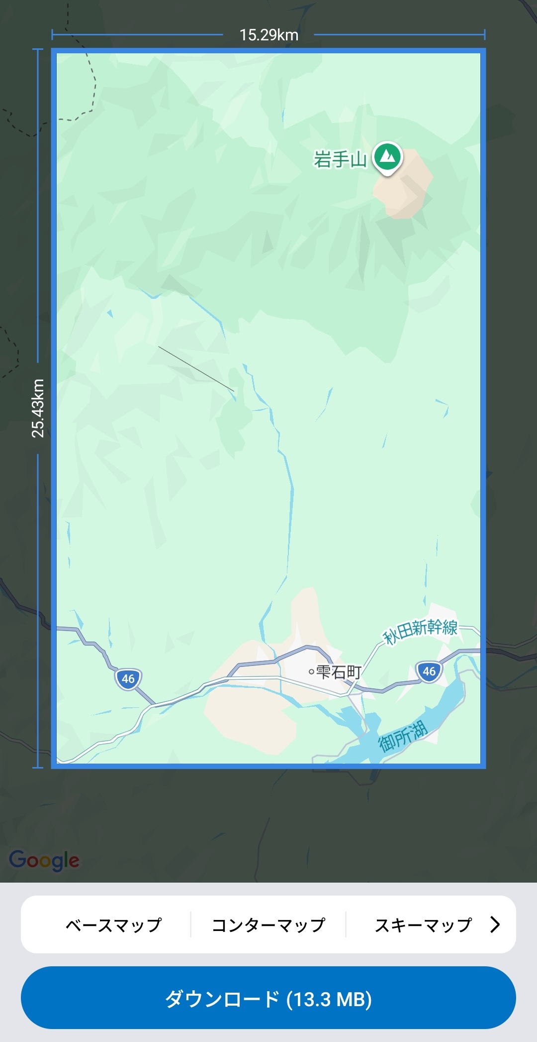 Zeppアプリからは追加エリアのオフラインマップをダウンロードすることも可能です。たとえば岩手山エリアであれば15.29km×25.43kmの範囲が13.3MBのサイズでダウンロードでき、ベースマップ・コンターマップ(等高線)・スキーマップの3種類を切り替えて使用できます。