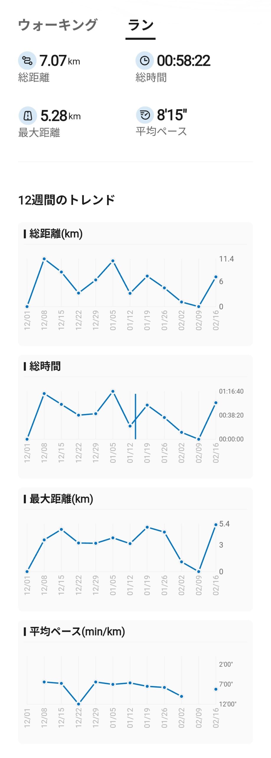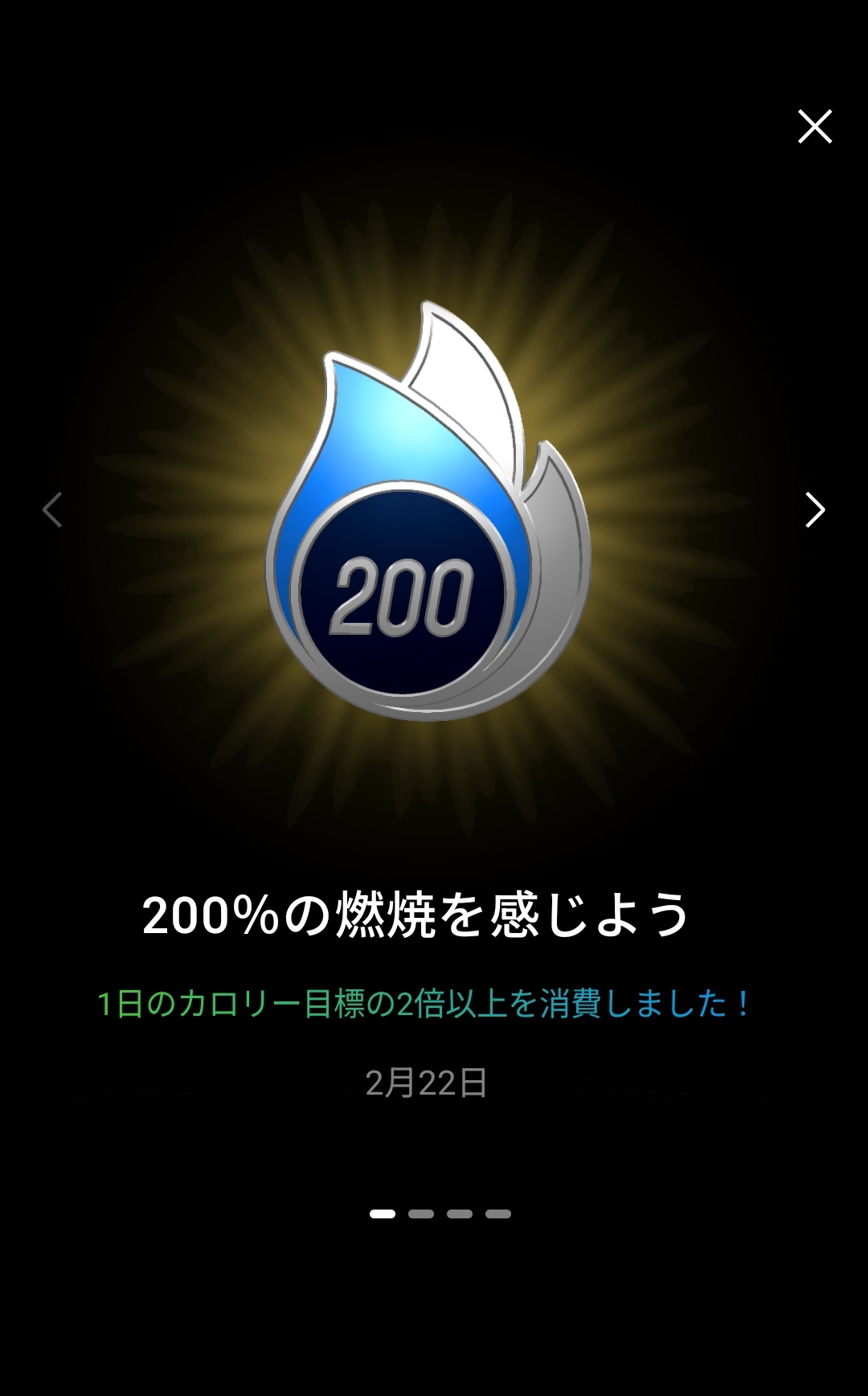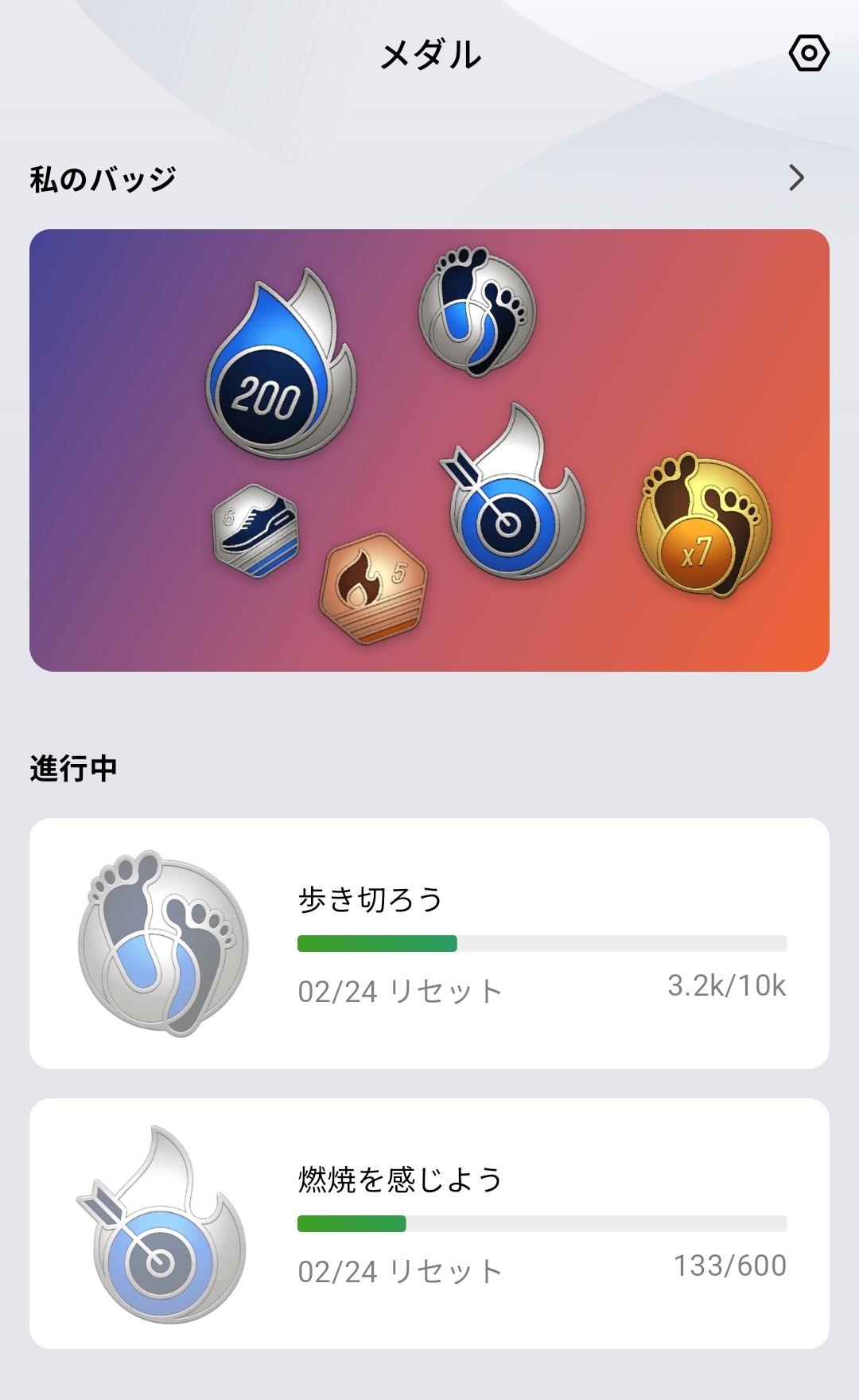 12週間のトレンドもグラフで確認できるのが嬉しいところ。ウォーキングの総距離推移やランニングのペース推移を長期的に追うことで、自分のフィットネスレベルがどう変化しているのかを客観的に把握できます。バッジシステムも搭載しており、「200%の燃焼を感じよう」(1日のカロリー目標2倍以上消費)といった目標達成でバッジを獲得できるのも、継続のモチベーションになります。