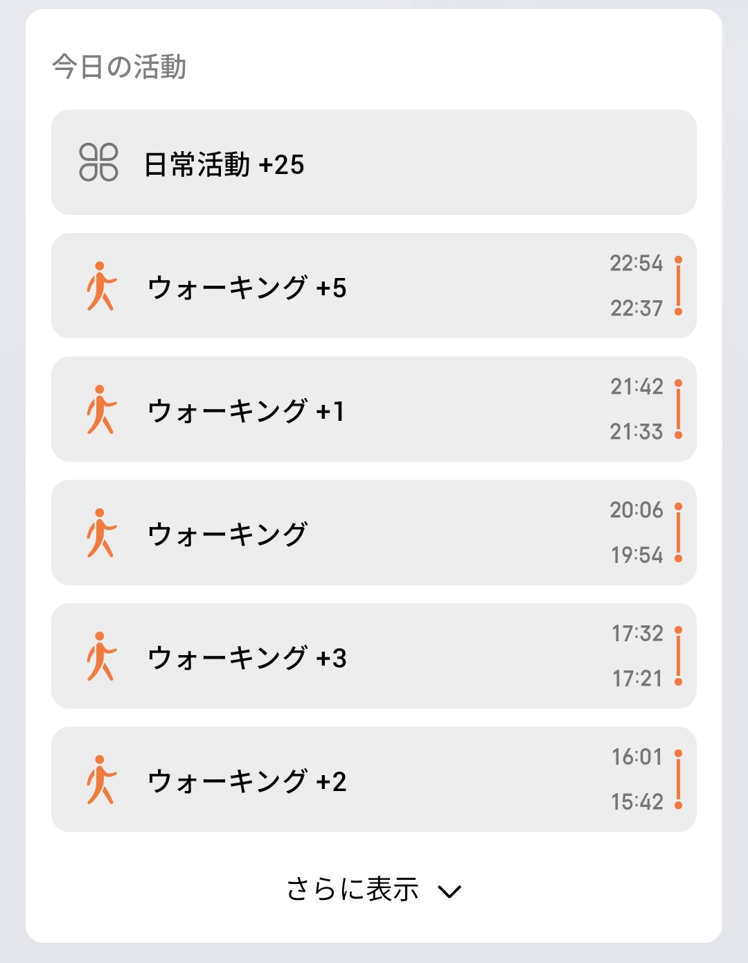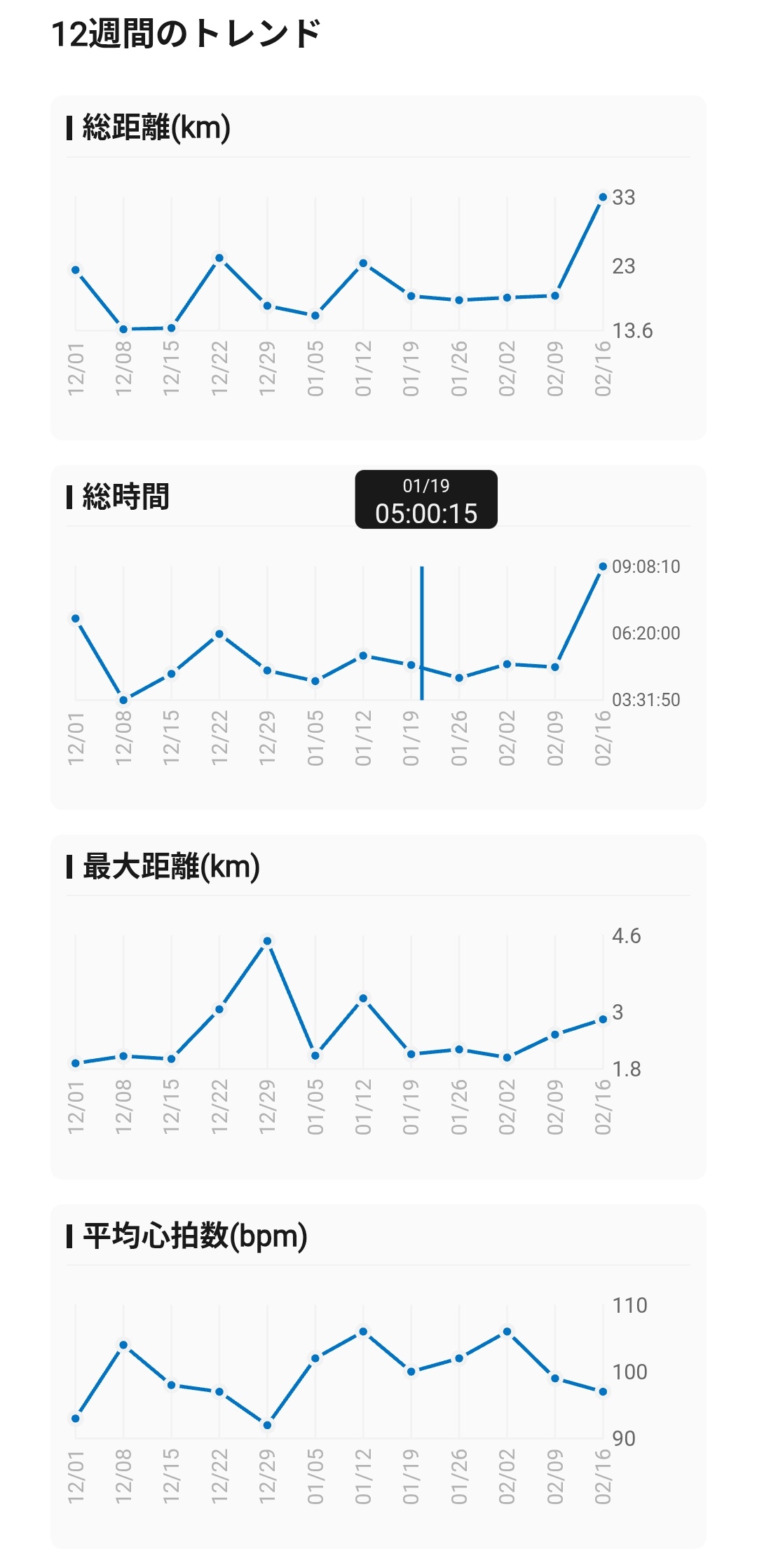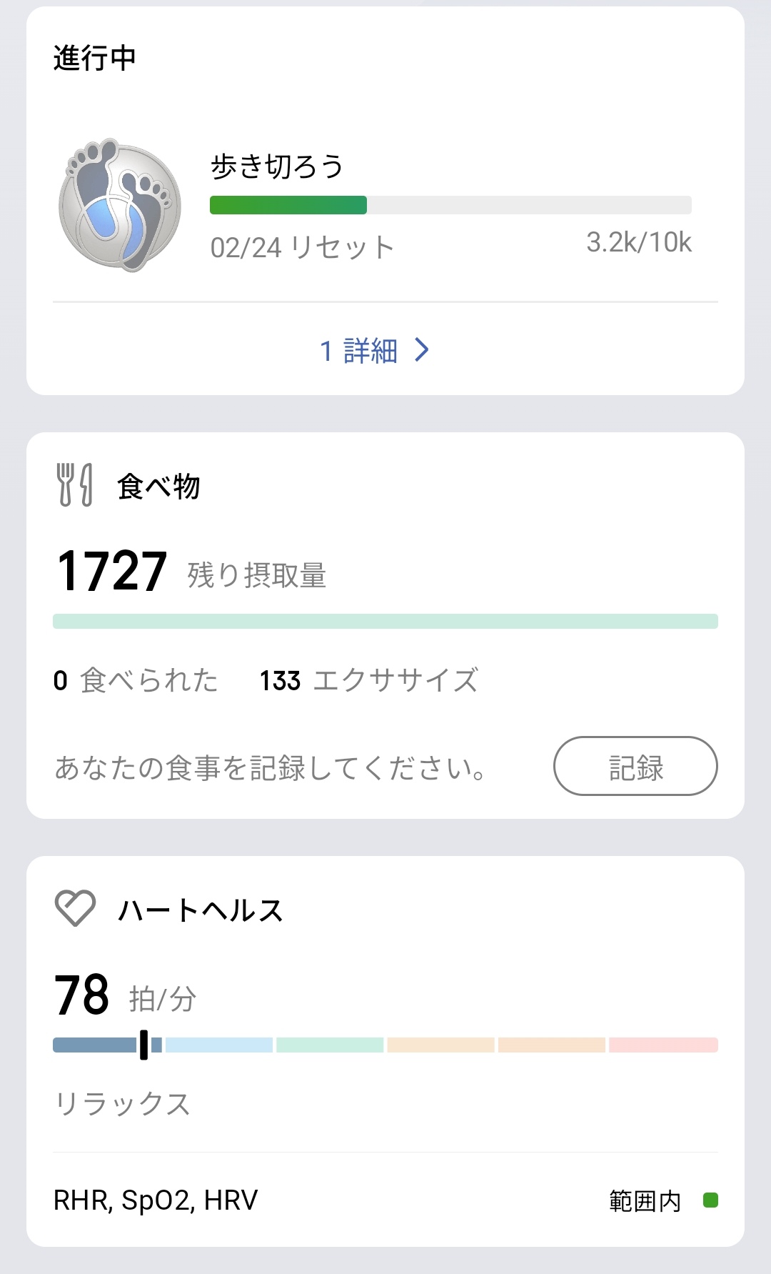 12週間のトレンドもグラフで確認できるのが嬉しいところ。ウォーキングの総距離推移やランニングのペース推移を長期的に追うことで、自分のフィットネスレベルがどう変化しているのかを客観的に把握できます。バッジシステムも搭載しており、「200%の燃焼を感じよう」(1日のカロリー目標2倍以上消費)といった目標達成でバッジを獲得できるのも、継続のモチベーションになります。