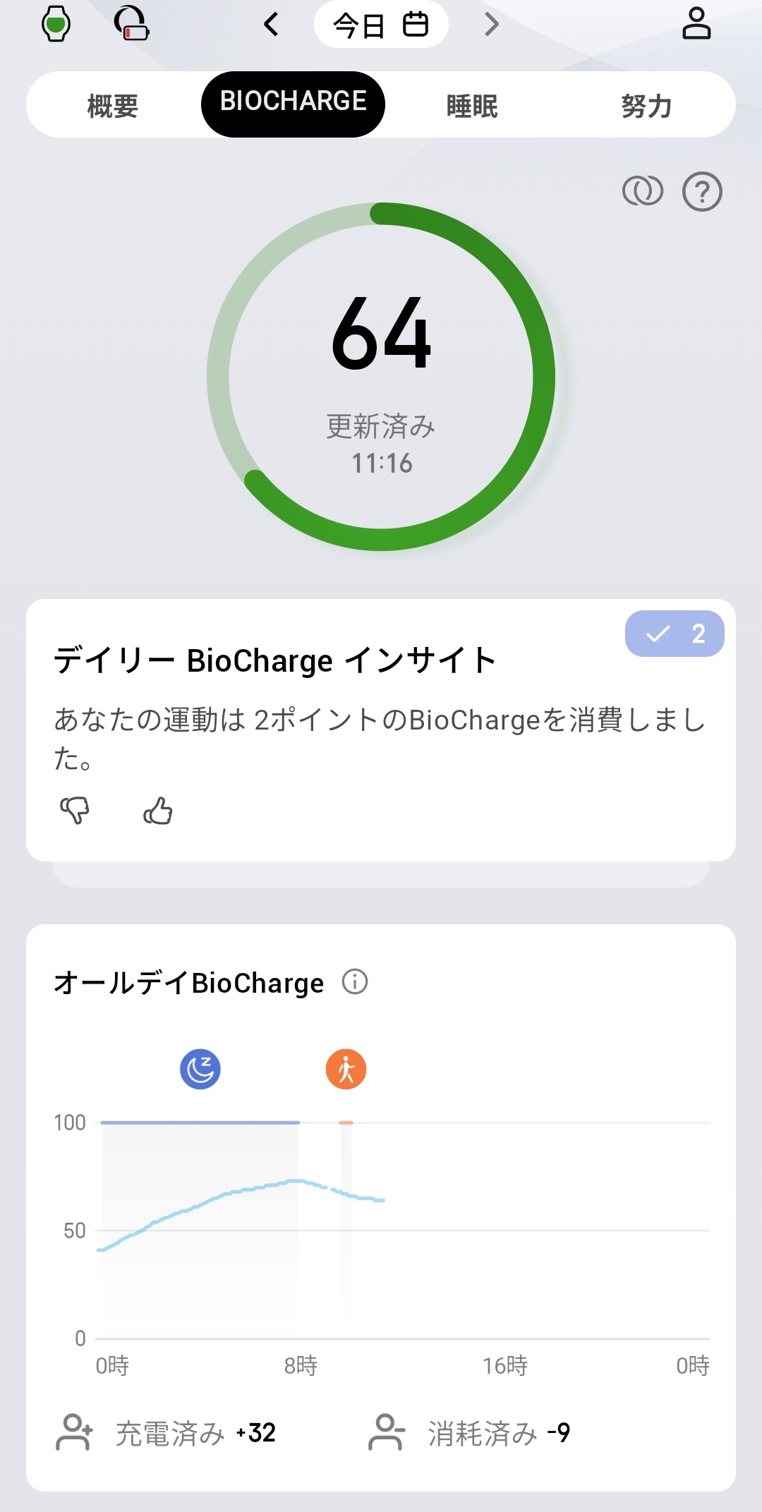 Zeppアプリ上ではBioChargeのデイリーインサイトとして「運動で2ポイント消費」といった具体的なフィードバックを確認できます。オールデイBioChargeグラフでは充電量(+32)と消耗量(-9)を時系列で可視化しており、睡眠による回復と日中の活動による消耗のバランスを直感的に把握できるのが便利です。