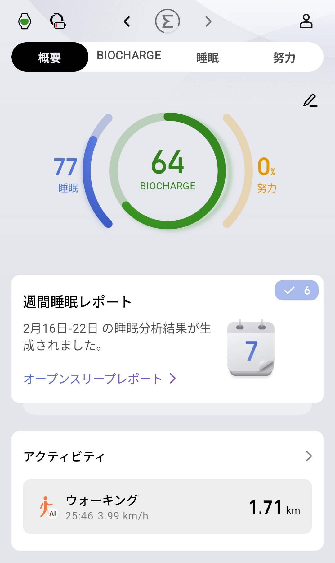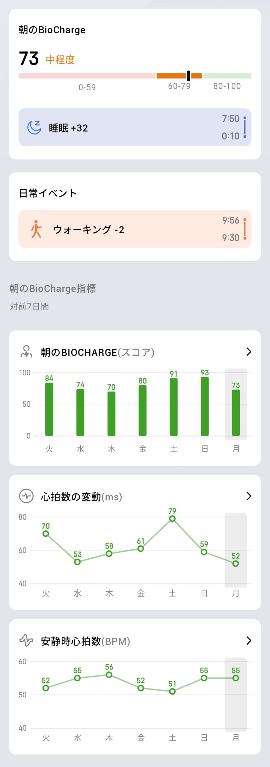 過去7日間のトレンドも確認でき、数値が日によって変化していく様子が把握できます。朝のBioChargeスコアの推移を見ることで、疲労の蓄積具合や回復状態を客観的に把握できるわけです。体調管理のペースメーカーとして活用できる実用的な機能に仕上がっています。