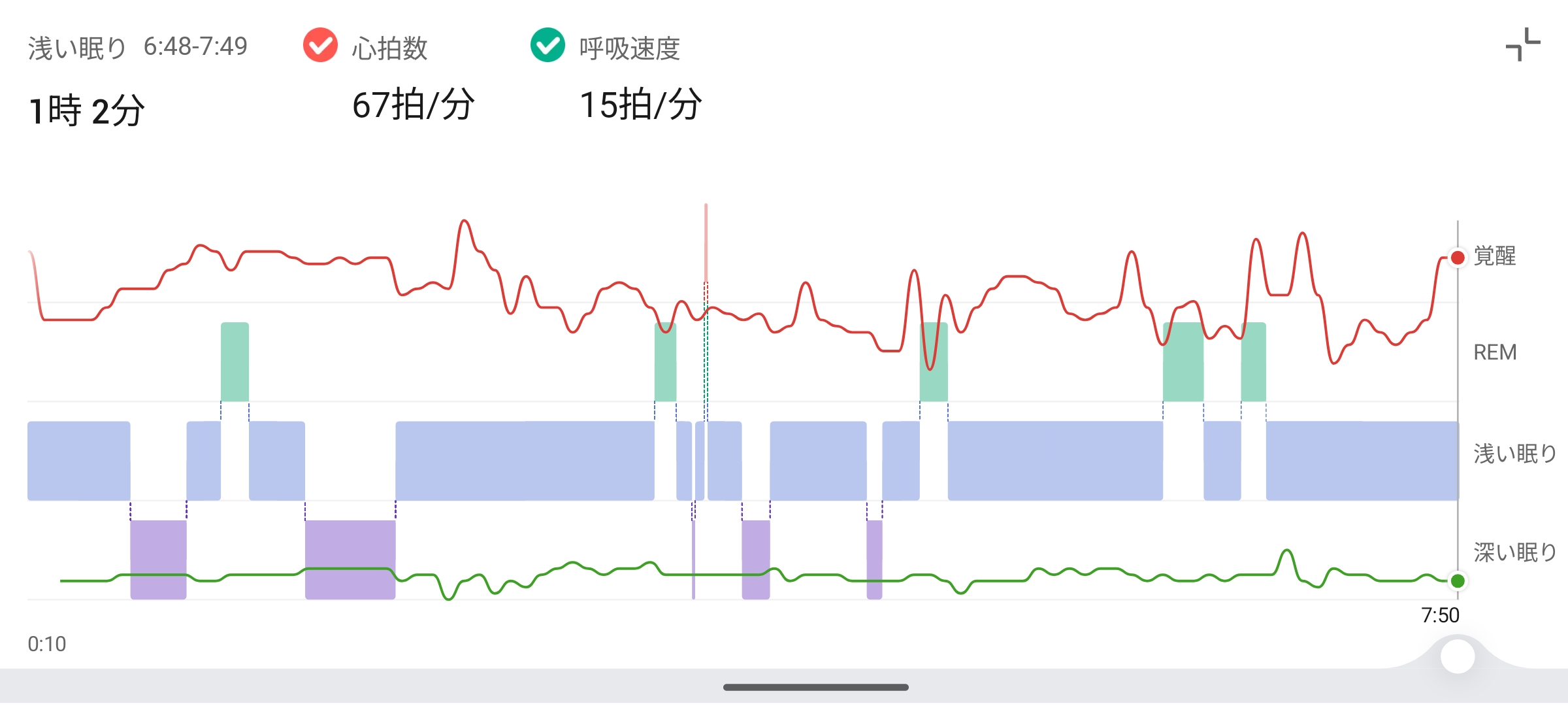 睡眠グラフの詳細画面では、REM・浅い眠り・深い眠りを色分けしたグラフの上に、心拍数(赤線)と呼吸速度(緑線)を重ねて表示。どのタイミングでどんな睡眠状態だったのか、その時の心拍数や呼吸はどうだったのかが時系列で確認できるわけです。