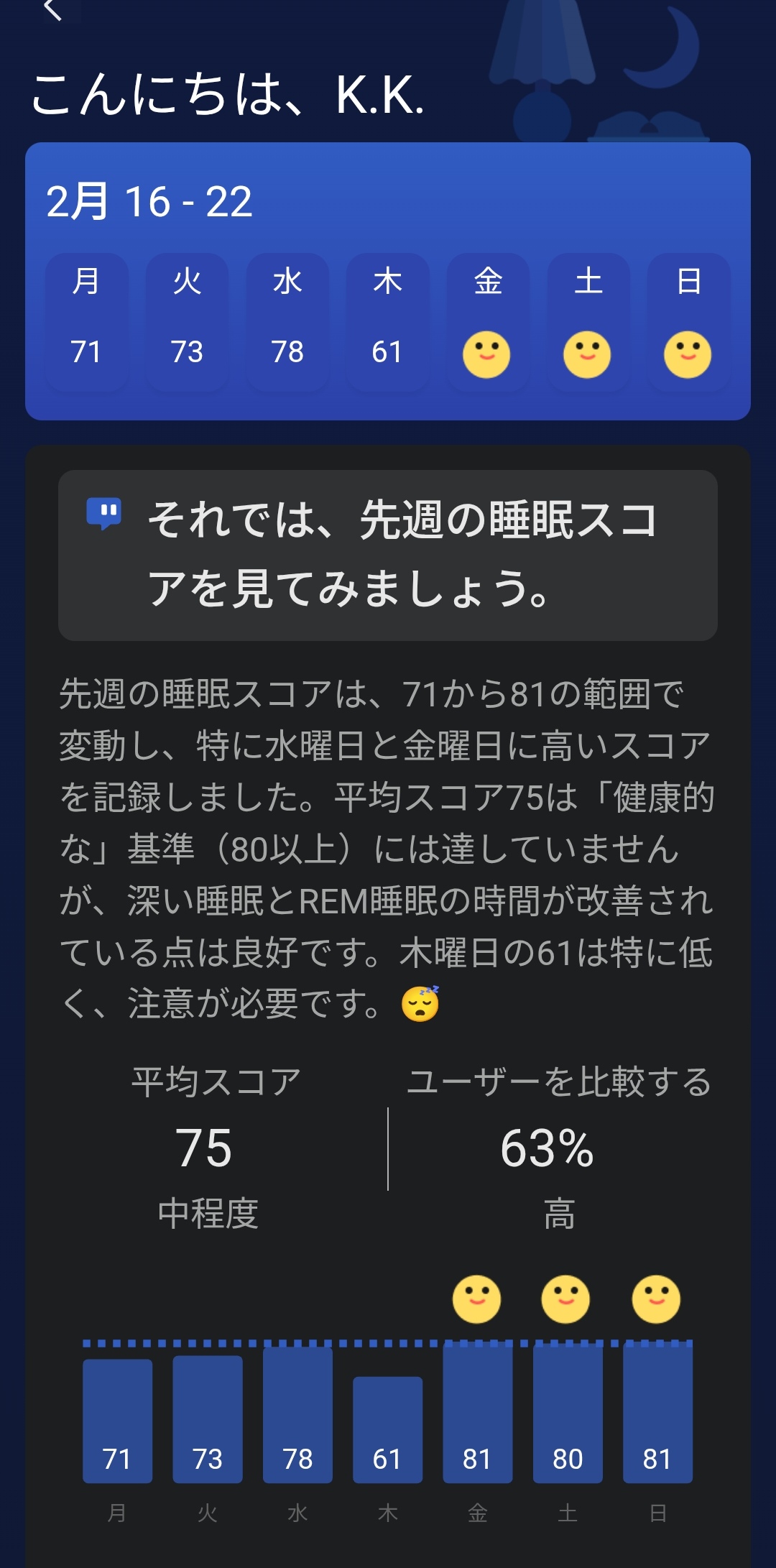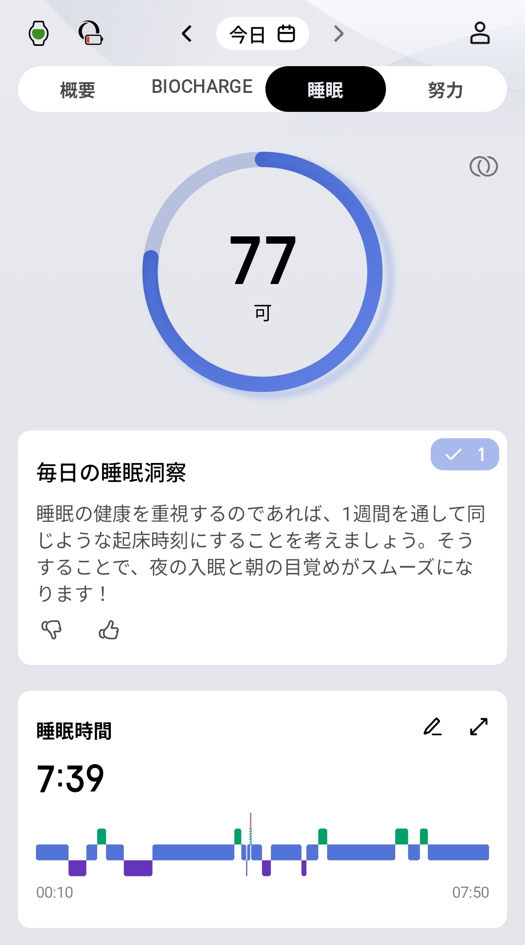 睡眠分析機能も非常に充実しているのもポイント。睡眠スコアで毎日の睡眠の質を評価してくれるほか、「1週間を通じて同じ起床時刻に」といった具体的なアドバイスも出してくれます。