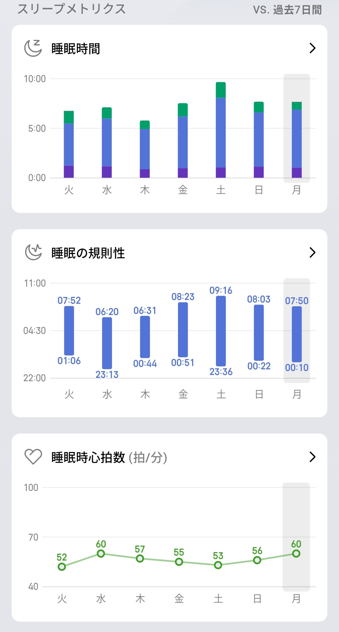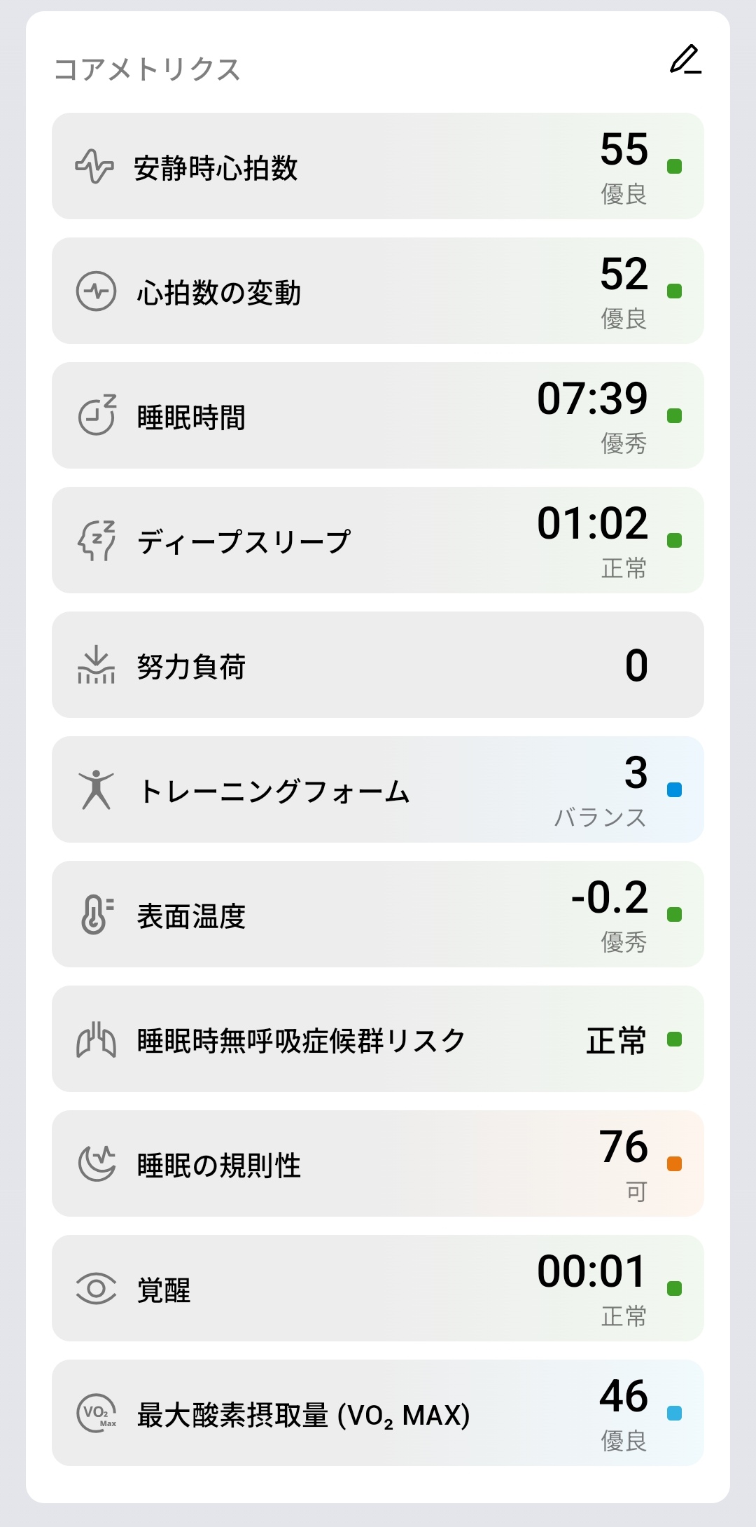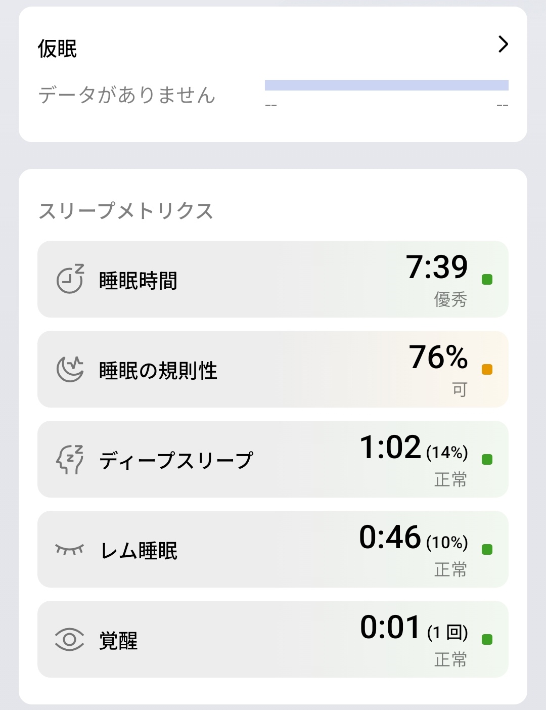 スリープメトリクスでは、睡眠時間7:39(優秀)、睡眠の規則性76%(可)、ディープスリープ1:02(14%)、レム睡眠0:46(10%)、覚醒0:01(1回)と各項目のスコアリングを確認できます。それぞれ「優秀」「正常」「可」といった評価が付くため、どの指標を改善すべきかがひと目でわかるのが便利です。