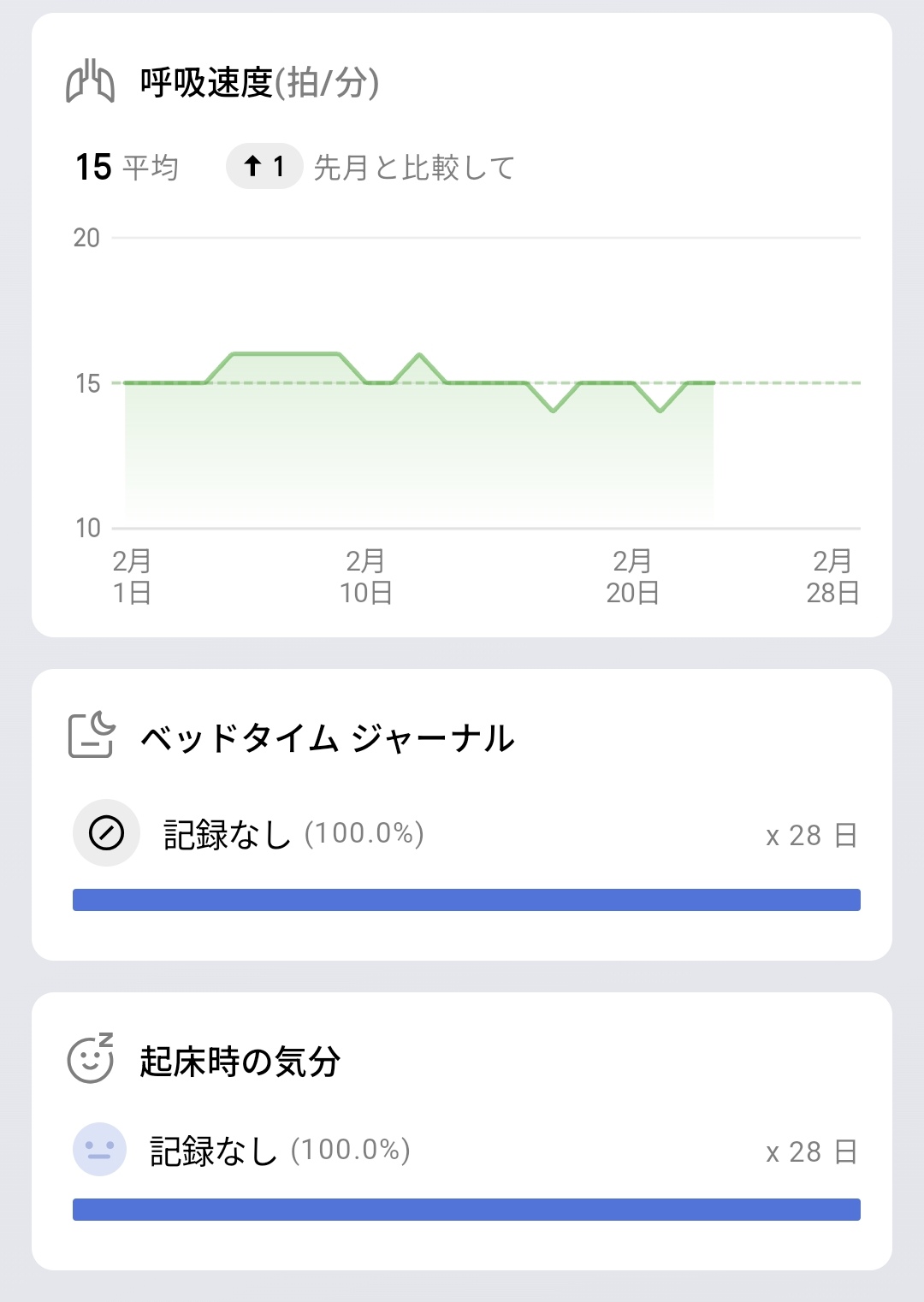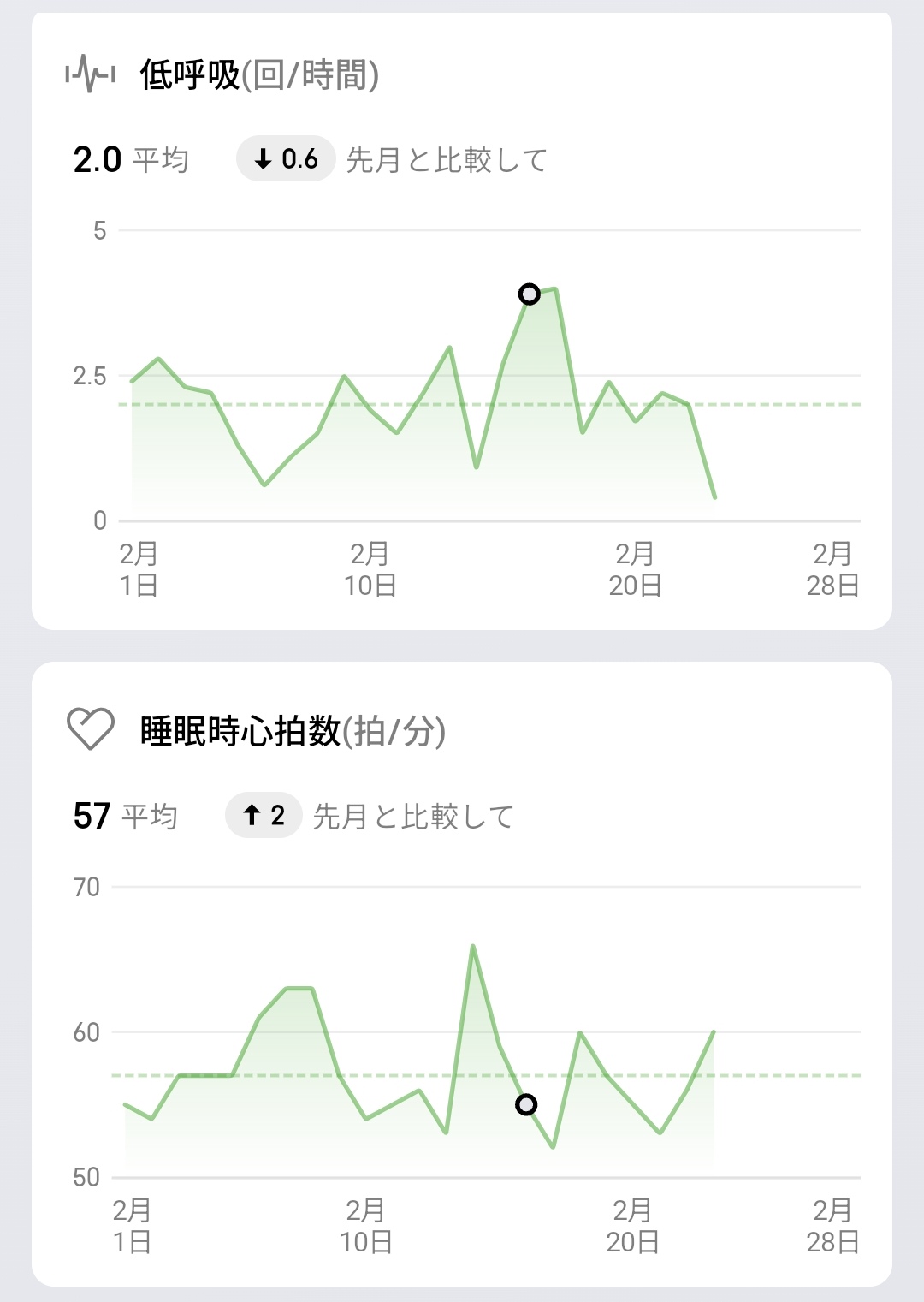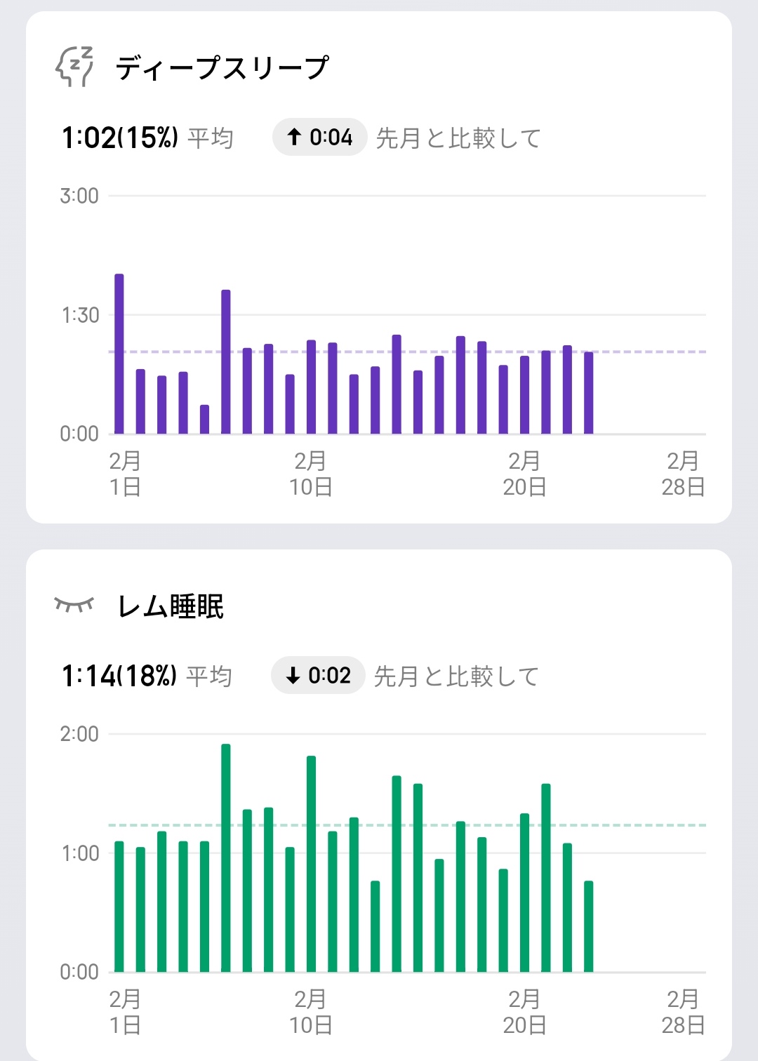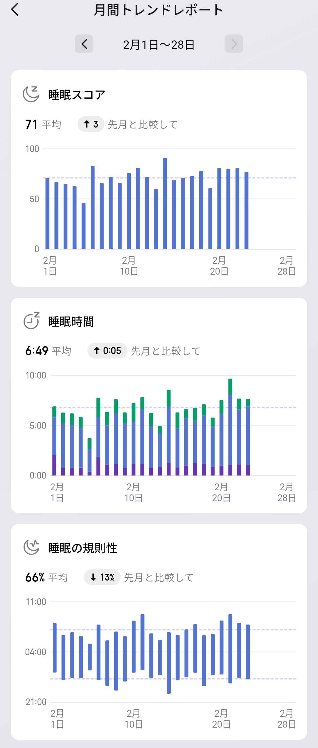 月間トレンドレポートでは先月との比較データを確認でき、睡眠スコア平均71(先月比+3)、睡眠時間平均6:49(先月比+0:05)といった形で改善傾向なのか悪化傾向なのかが一目瞭然。睡眠の状態は1日ごとの結果で一喜一憂するよりも、月単位での傾向を把握することが重要なので、こうした長期データが簡単に見れるのは非常に実用的です。