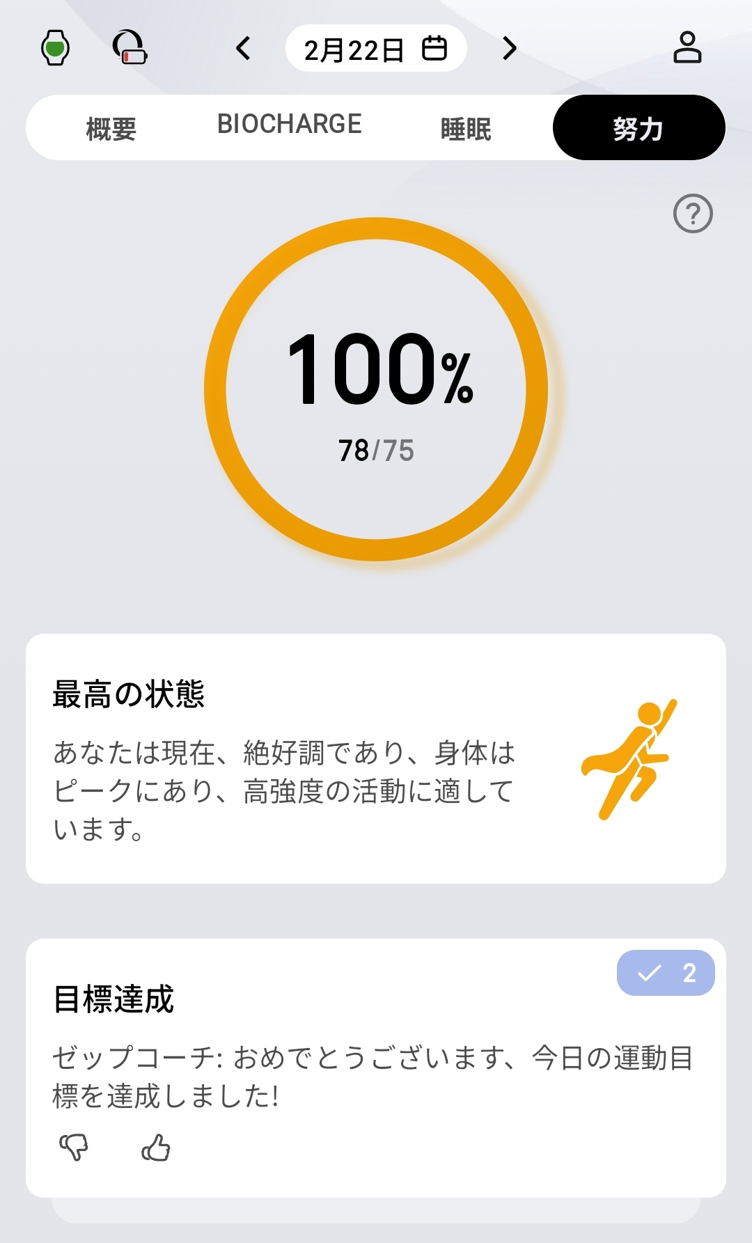 Zeppアプリの努力タブでは、その日の身体の状態に対してどれだけトレーニングを実施しているかを分析してくれます。100%になれば目標達成で、「最高の状態。絶好調で高強度活動に適しています」といった具体的なフィードバックが得られるのが便利です。
