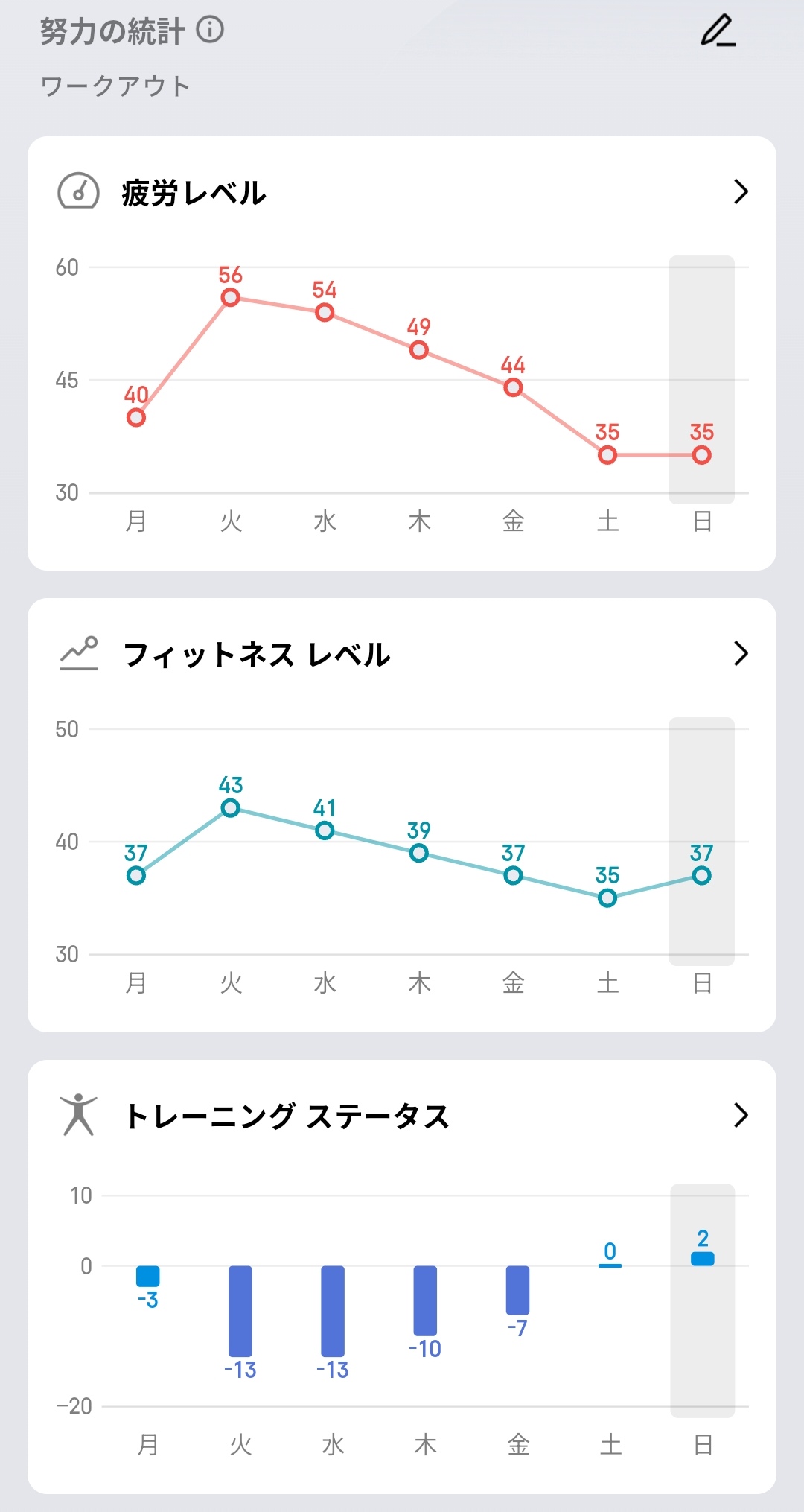 努力の統計画面では、疲労レベルとフィットネスレベルの週間推移をグラフで確認できます。疲労レベルは月曜40から土曜35へ、フィットネスレベルは月曜37から日曜37へと推移しており、オーバートレーニングの防止にも活用できるわけです。