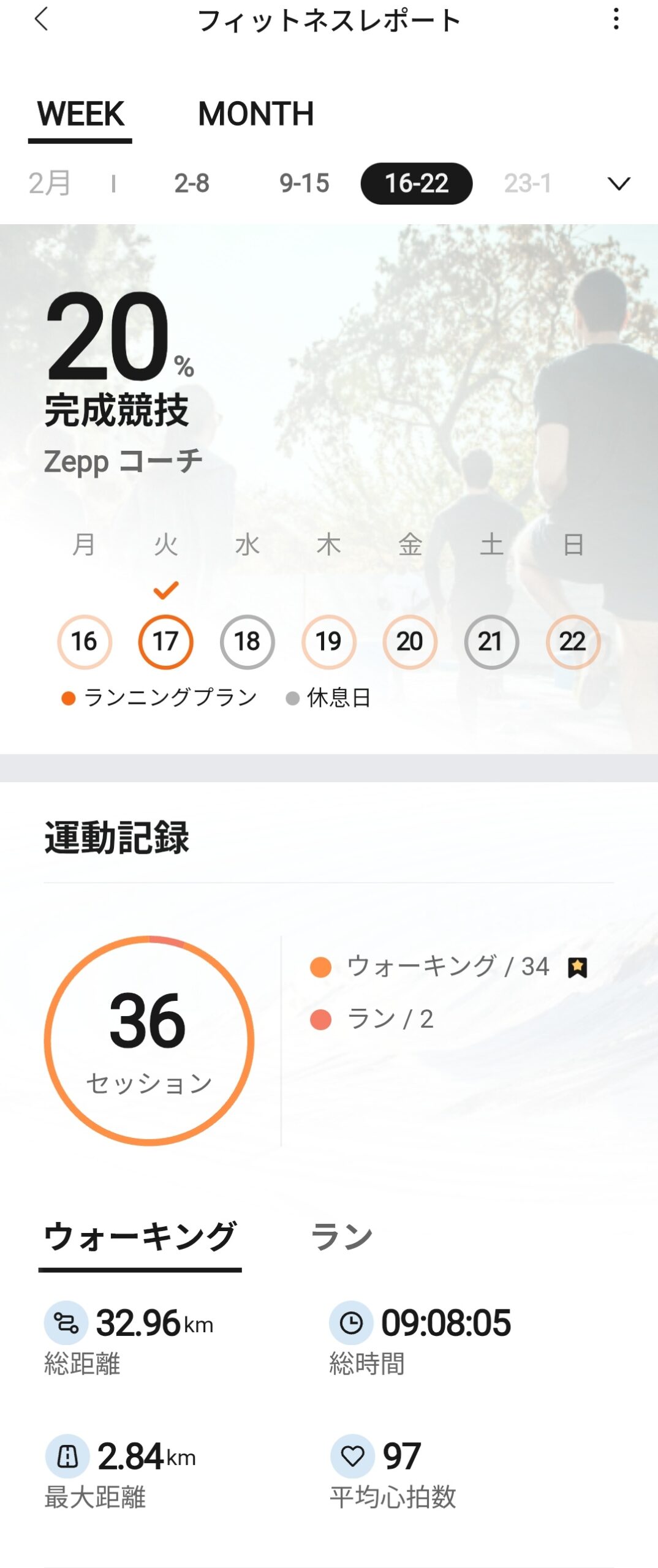 週間レポートでは、ランニング距離7.0km、徒歩距離32.9km、継続時間10.1時間といった運動サマリーに加え、VO2最大値46(優良)やワークアウト負荷260(中程度)、完全回復時間0h(完全回復)といった高度な指標も確認可能。単なる距離や時間だけでなく、身体への負荷と回復状態まで把握できるのが本格的です。