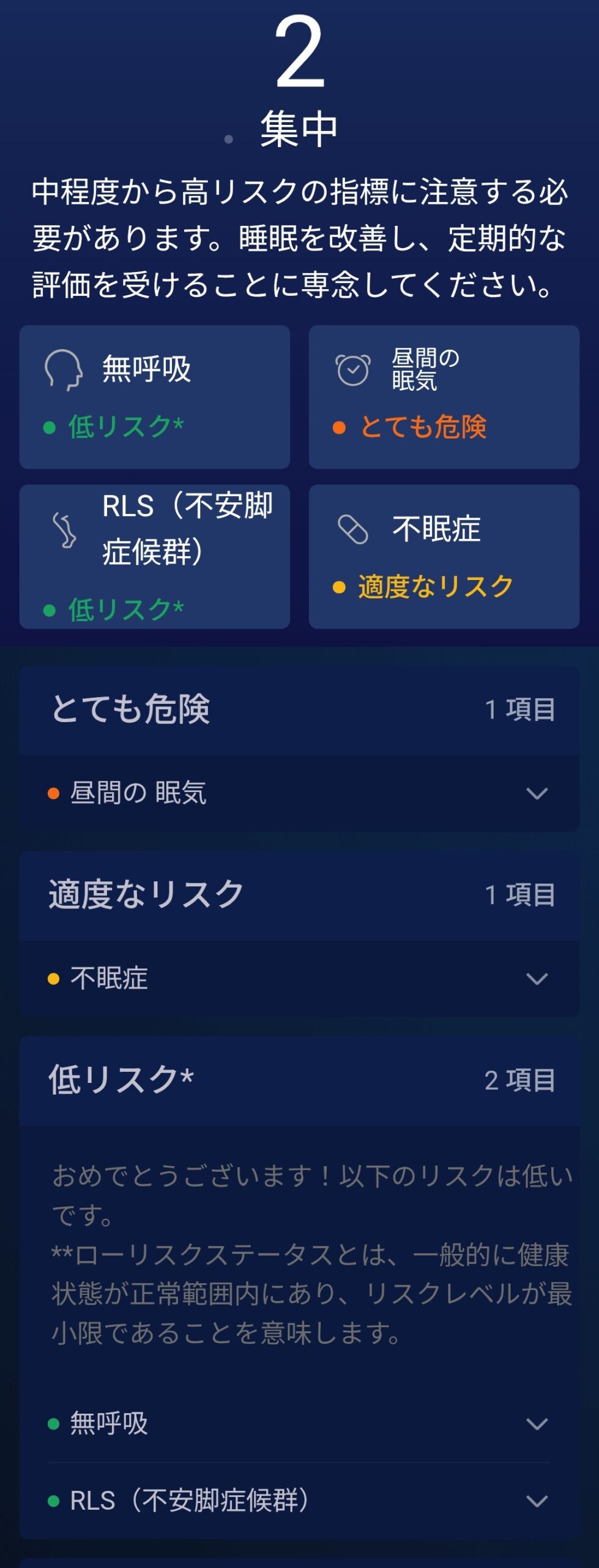 Zepp Aura(プレミアム)と連携すると、さらに踏み込んだ睡眠健康評価が得られます。無呼吸リスク、昼間の眠気、不眠症リスクなど4項目で評価し、リスクの高さに応じてアラートを出してくれるのもポイントです。