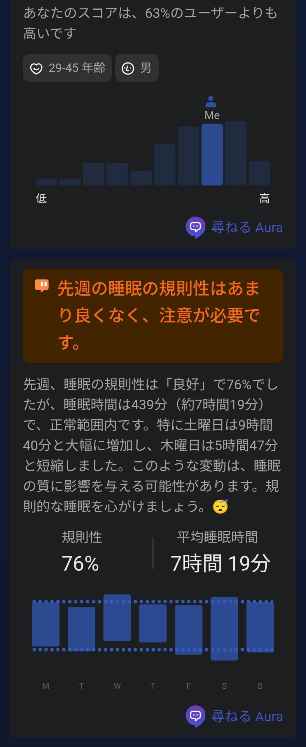 週間レポートではAIが睡眠データを分析し、「先週の睡眠の規則性はあまり良くなく、注意が必要です」といった具体的なアドバイスをくれます。同年代との比較データも確認でき、自分の睡眠が同世代の中でどのレベルにあるのかも把握可能。「尋ねる Aura」機能ではAIチャットで睡眠に関する質問もできるため、改善に向けた具体的なアクションを相談できるのも嬉しいところです。