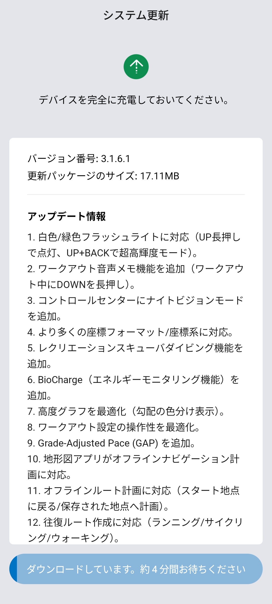 初回セットアップ時にはファームウェアのアップデートも配信。アップデート内容は12項目に及ぶもので、ダウンロードから再起動完了まで5〜6分かかる印象でした。初回セットアップ時にはある程度の時間を見込んでおくとよいかと。Amazfitはスマートウォッチのファームウェアについて定期的にアップデートを実施しており、長期間利用するうえでも安心できるのもポイントです。