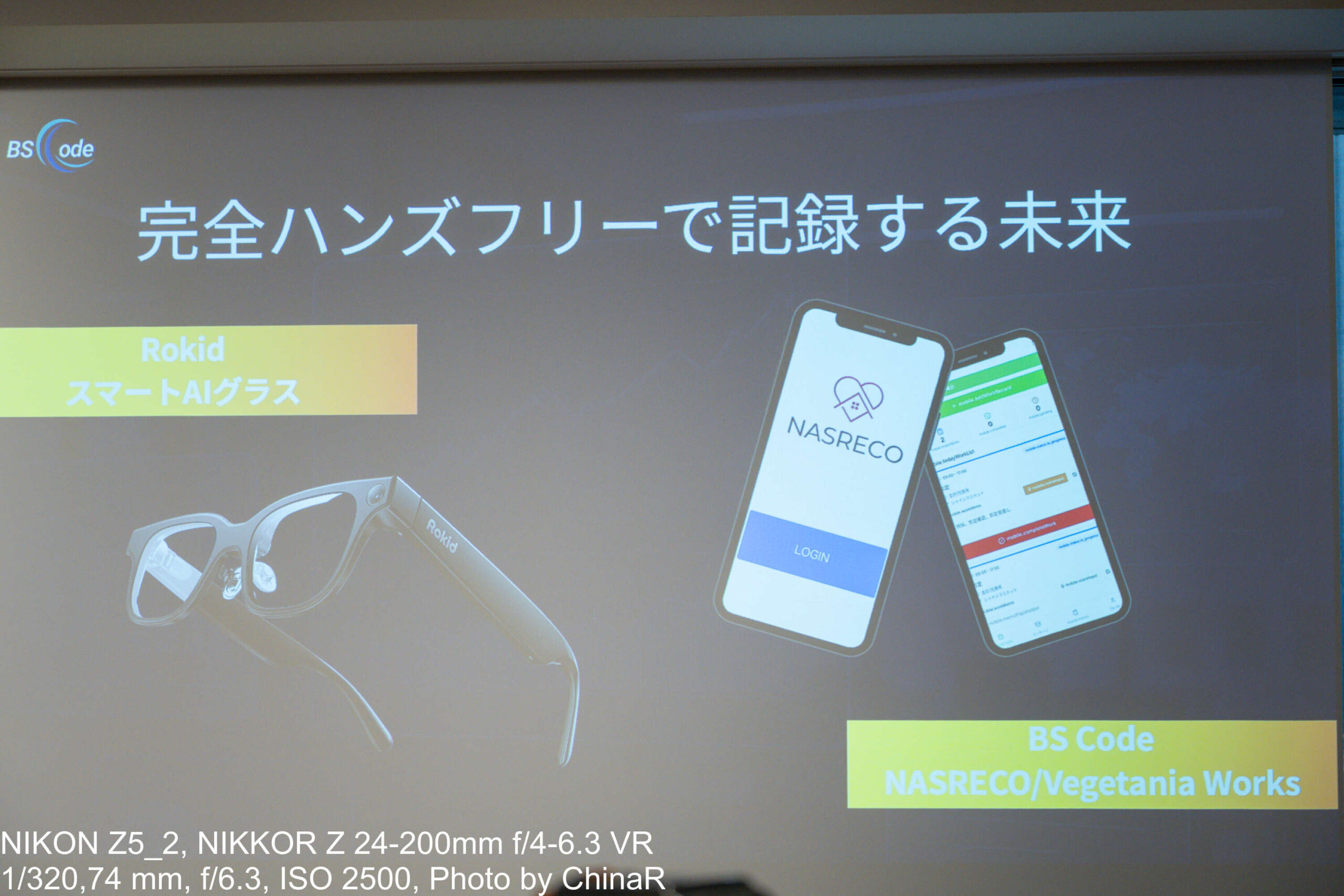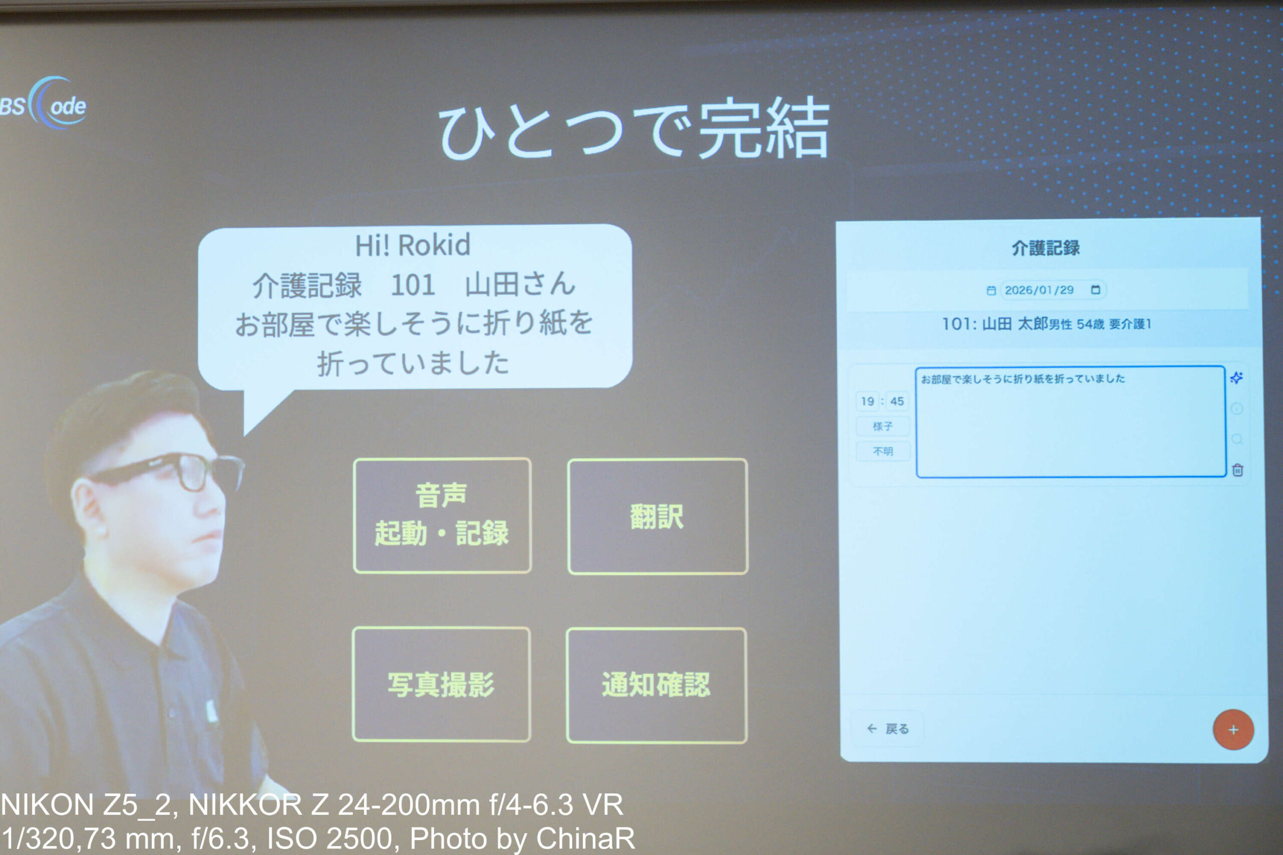 発表会では、RokidスマートAIグラスと連携した介護記録アプリNASRECOについて紹介。グラスを装着した状態で「ハイロキッド、介護記録101 山田さん、お部屋で楽しそうに折り紙を折っていました」と話しかけると、アプリ側にその内容が即時記録・タイムスタンプとともに蓄積されるようになっています。介護保険監査に対応した法定書式の記録自動生成、外国人スタッフが母国語で話すと日本語で記録されるリアルタイム翻訳記録、体温・血圧などのバイタル記録の音声入力、食事記録、ナースコール通知対応まで、現場業務に必要な機能が一本のグラスで完結する設計となっています。