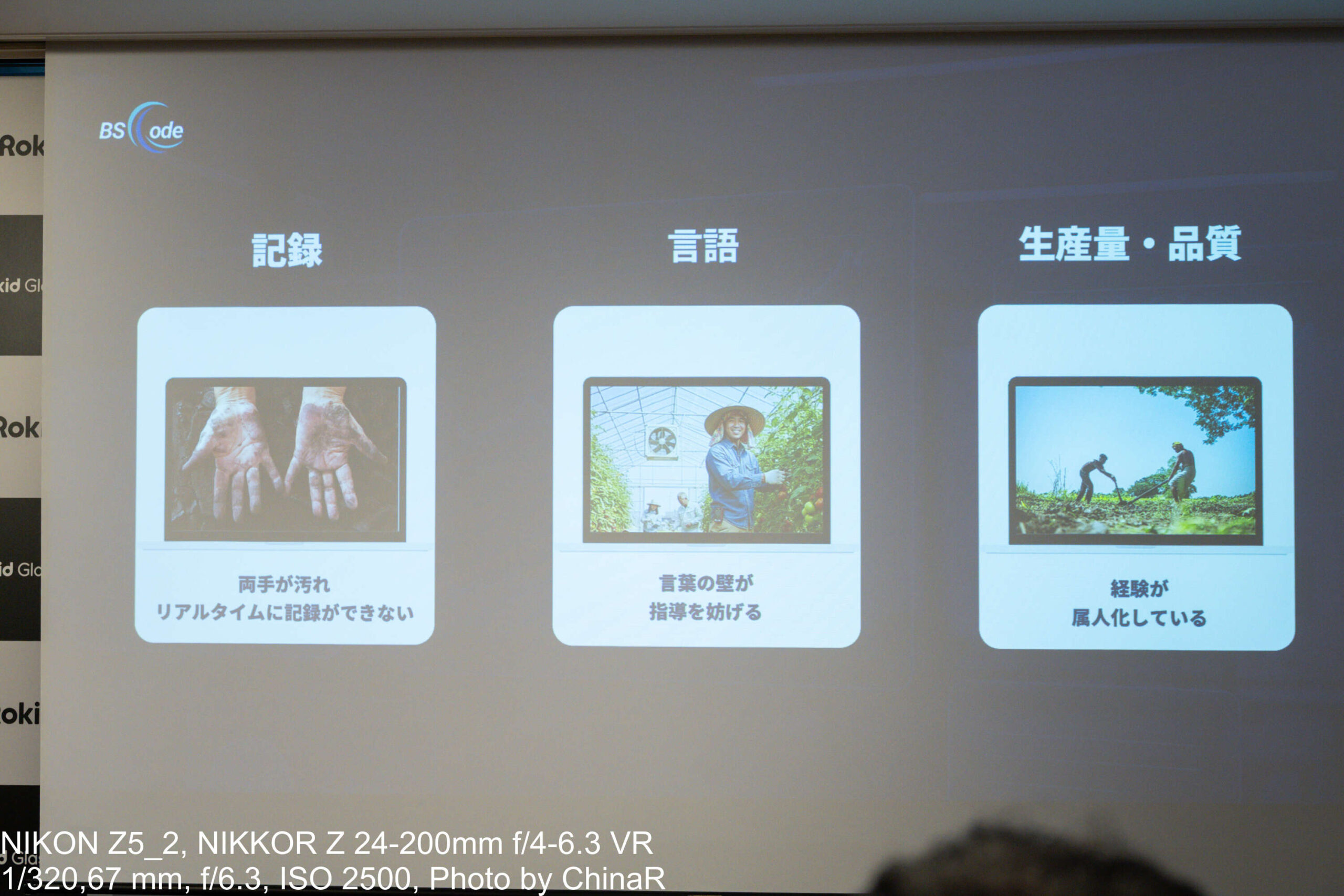農業分野の課題も深刻。農業従事者は2000年の約240万人から2023年には116万人へと半減し、平均年齢は68.7歳。一方で農産物の輸出額は2025年度に1.7兆円と過去最高を記録しており、人手が減る中で重要性はむしろ高まっているという状況とのこと。BS Codeはこの農業分野でもRokidスマートAIグラスを活用して生産性向上につなげる取り組みを実施中。