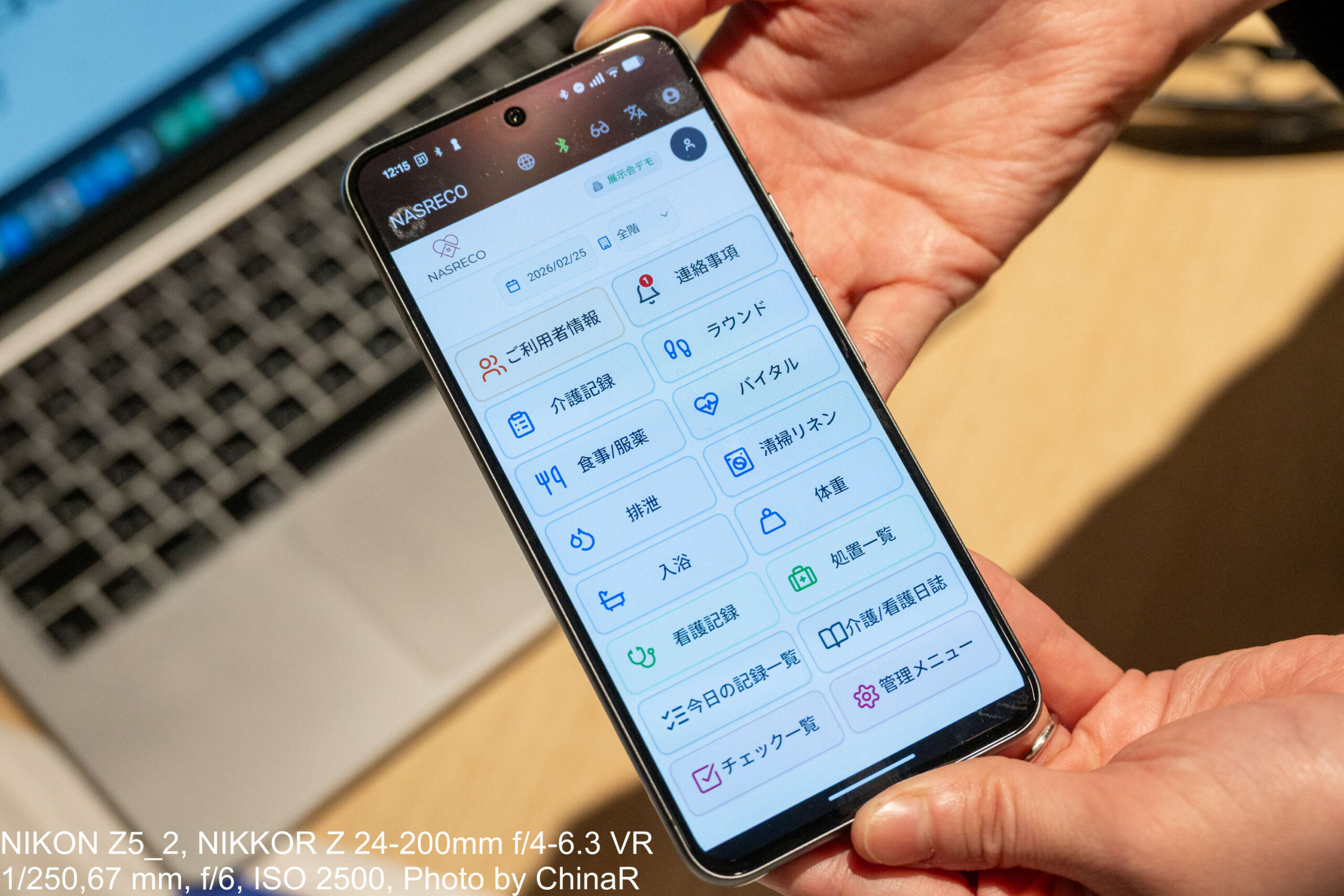 介護記録アプリNASRECOでは、ご利用者情報・介護記録・食事/服薬・バイタル・入浴・看護記録など、実際の現場で必要な項目が整然と並ぶUIが確認できました。発表会後のディスカッションでBS Codeの担当者は、今後の目標として「喋らなくても見るだけで記録が完成する状態」を目指していることを語っており、画像認識とAIによる完全自動記録というロードマップを描いていることも明かしていました。