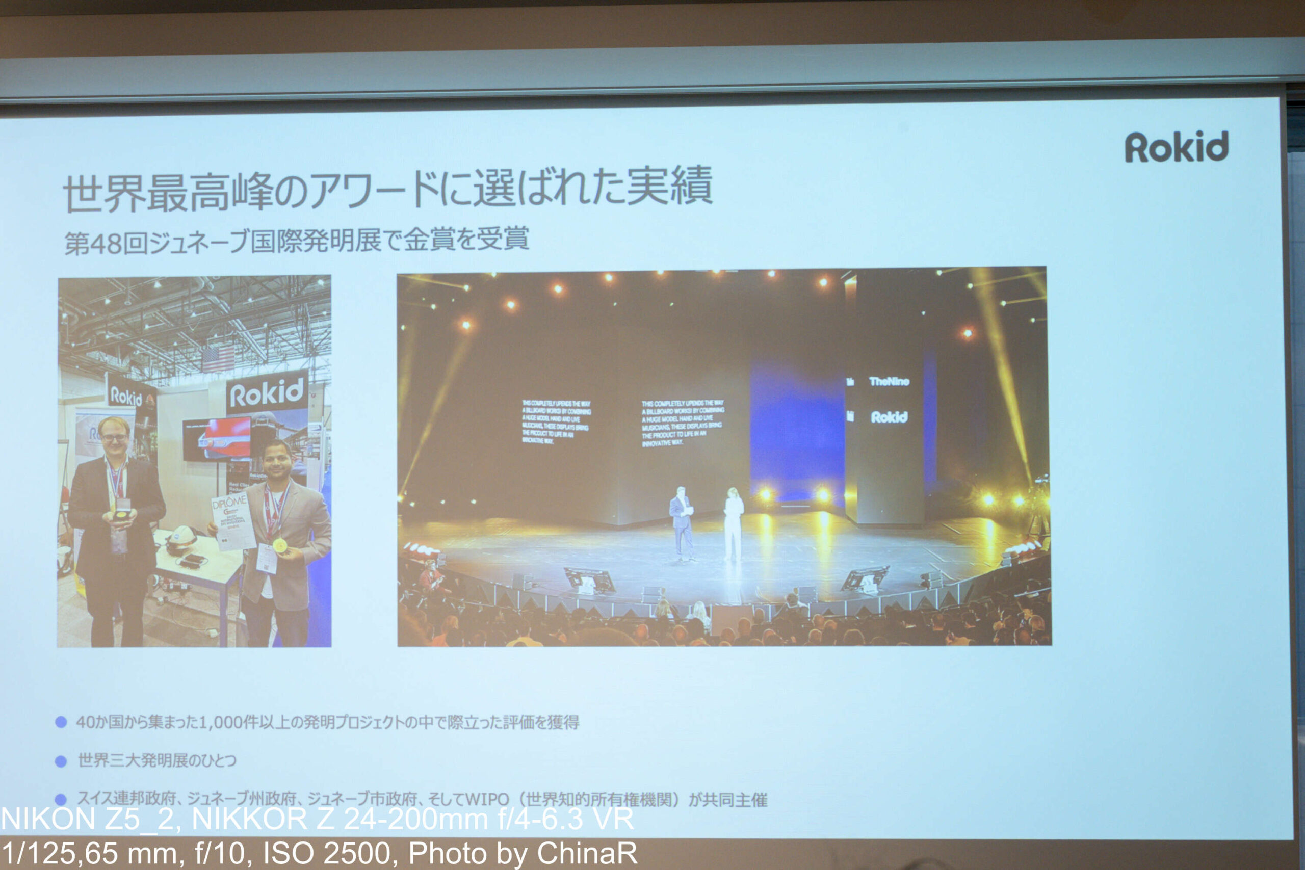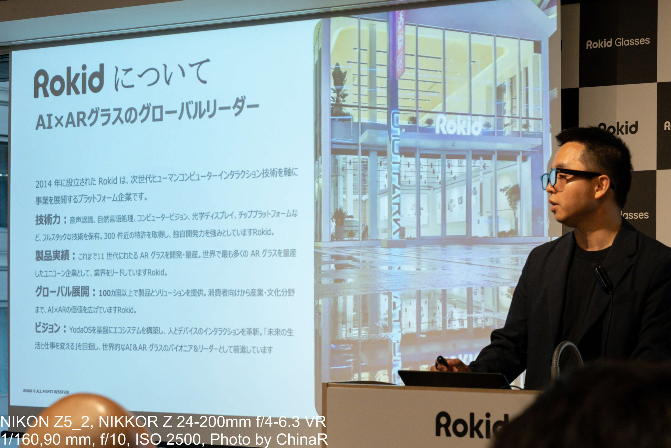 発表会の冒頭、Rokid,Inc. グローバルGMのZoro氏が登壇し、Rokidのブランド背景を紹介。Rokidは設立から約10年以上の歴史を持つAR/AIウェアラブル専門企業で、ARグラスの量産を11世代にわたって継続してきた業界の先駆者なんだとか。その歩みはARグラス産業の歴史そのものとも言えるもの。これまで多くのARグラスを展開してきましたが、105g→59g→49gと世代を重ねるたびに軽量化を実現してきた技術開発の軌跡を示してその技術力をアピールしていました。