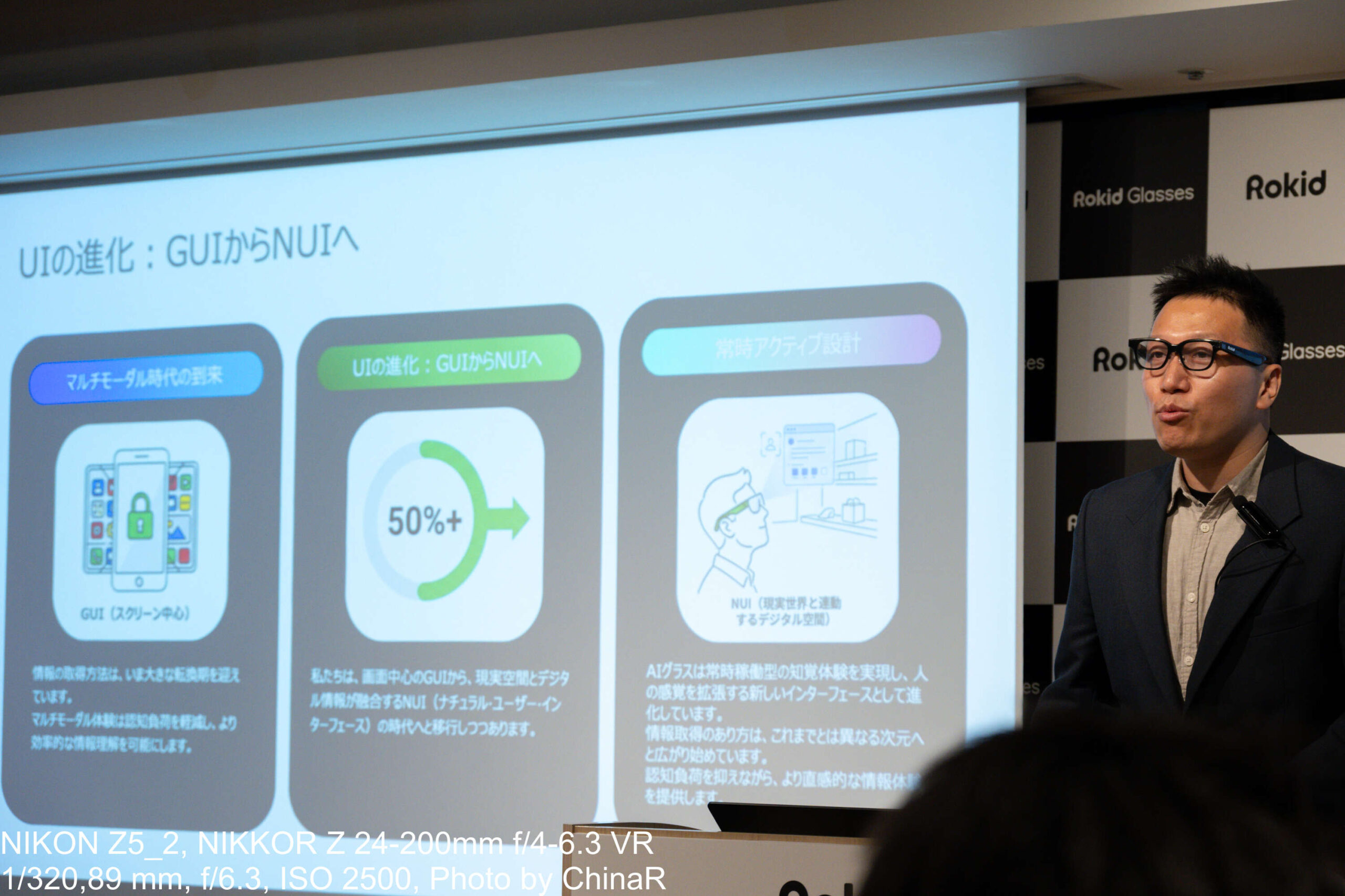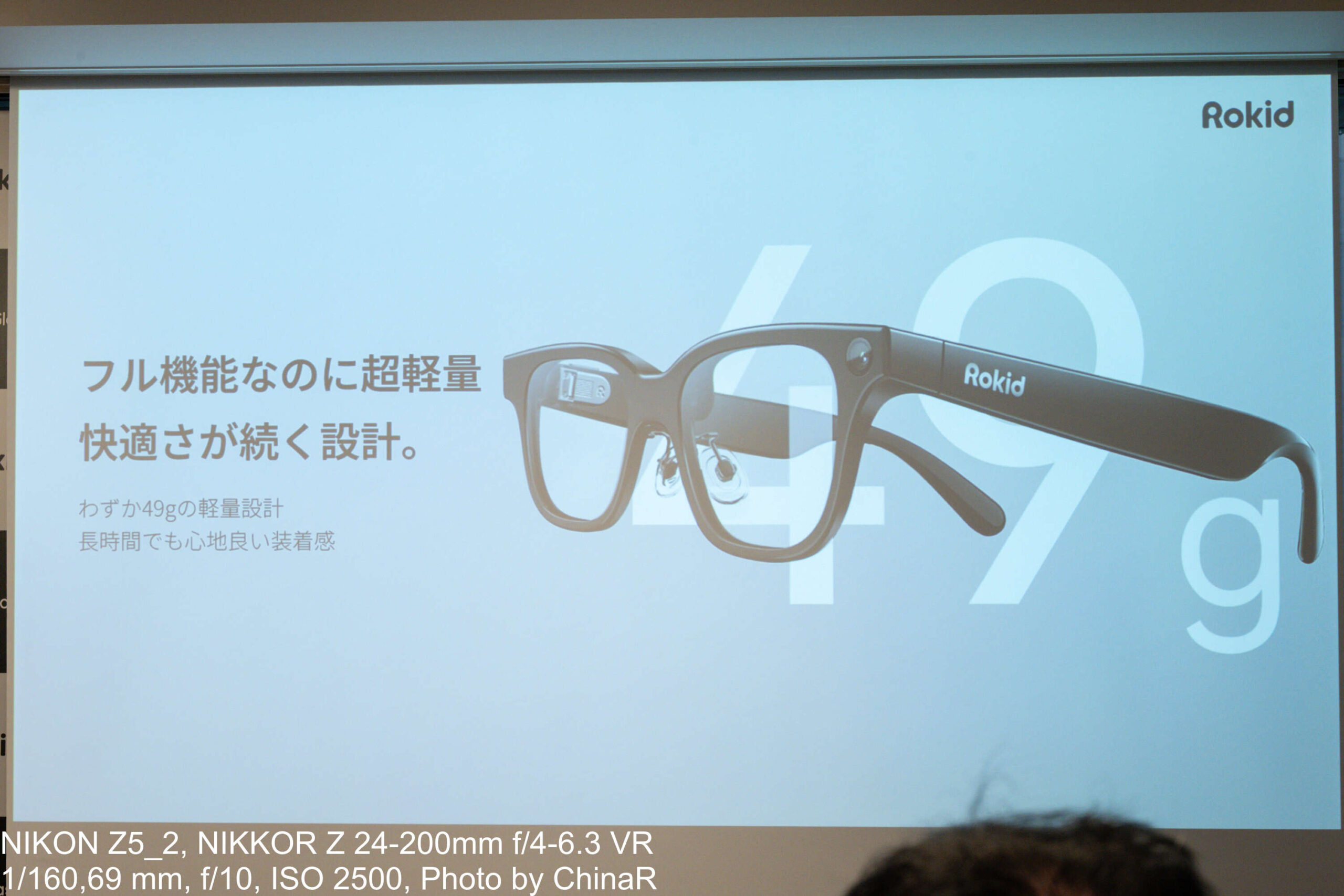 発表後のフリーディスカッションでは、Rokid Inc.担当者が自身の使用実態を率直に話してくれました。処方メガネが20gほどであるのに対して本製品は49gでどうしても重さは気になるため、最初の30日間は毎日着けていたが機能を把握した今はフォーマルなシーンや特定の場面に絞って使っているとのこと。スマートフォンを完全に置き換えるデバイスではなく、シーン別に使い分けるスマートツールという使い方をしているとのことです。