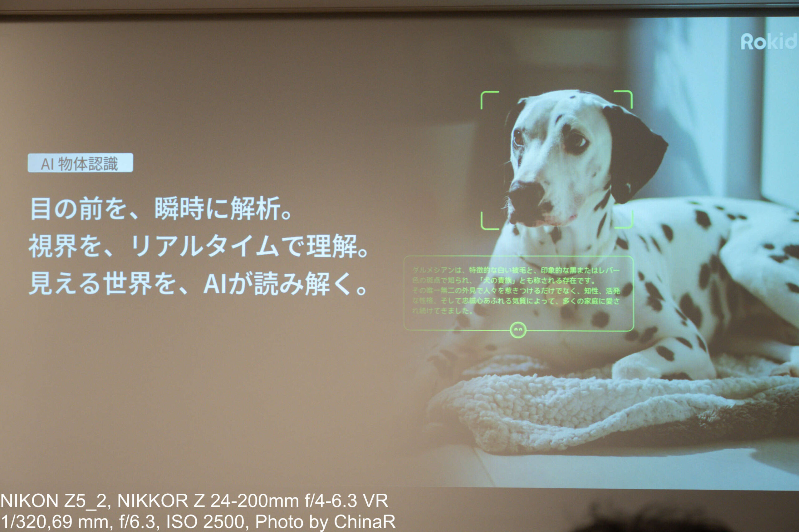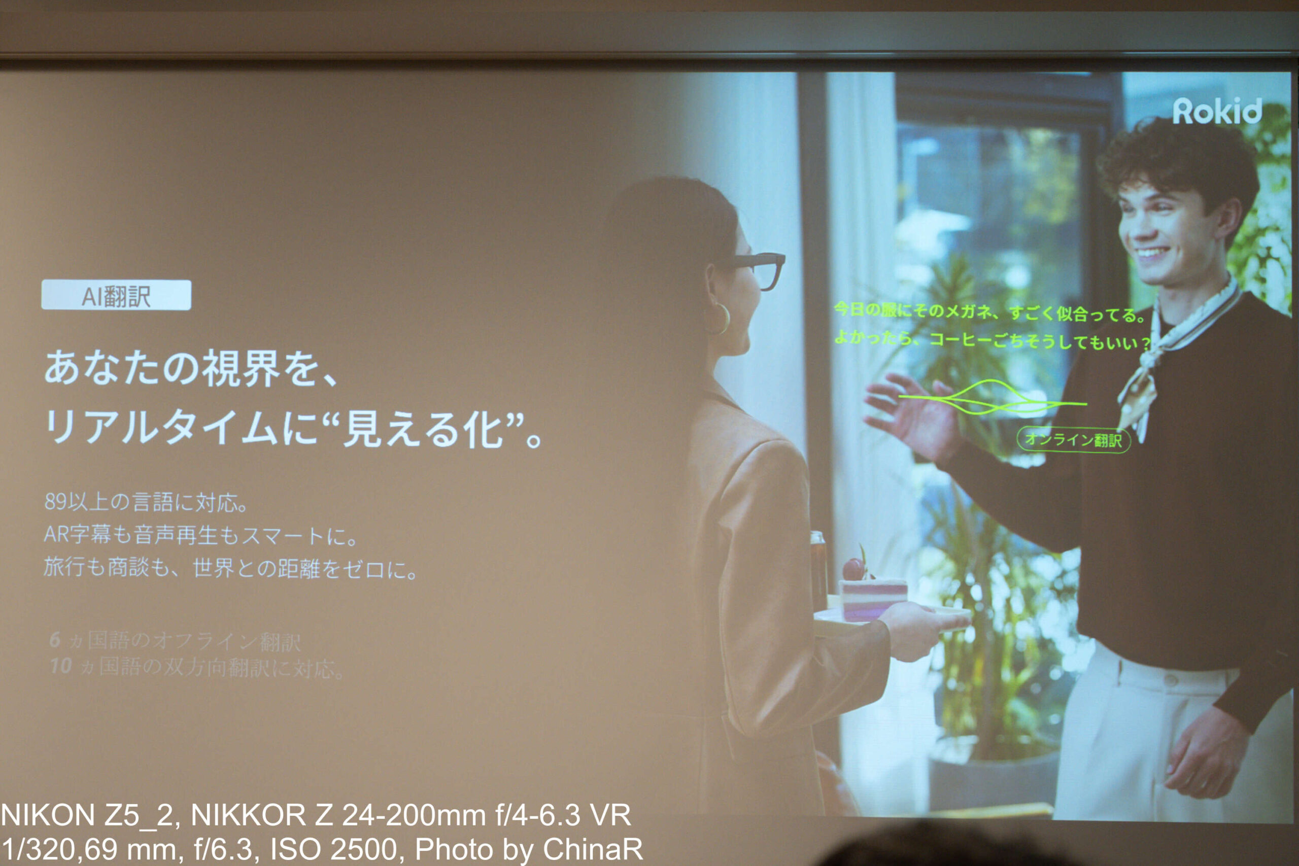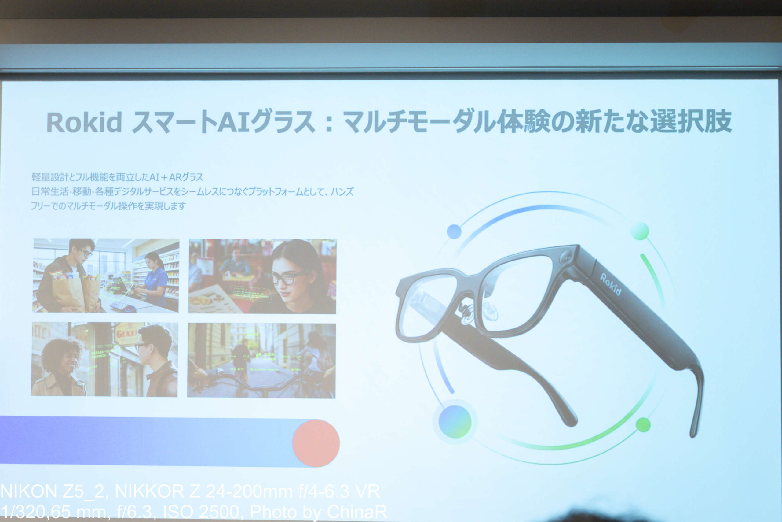 フューチャーモデル曲亮社長のプレゼンでは、主要AI機能として5つの特徴を紹介。ちなみに曲亮社長は実際にRokidスマートAIグラスを着用した状態でプレゼン全体を行っていましたが、装着者に見えている画面は外からは見えづらく自然な印象そのままに話しているようにしか見えませんでした。