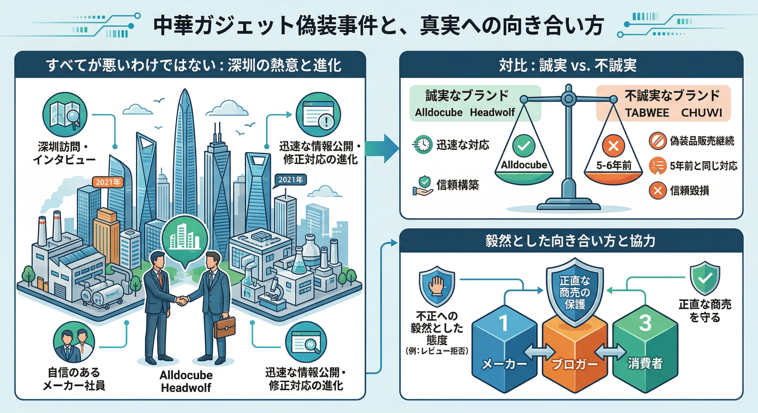 今回の記事で取り上げた3つの問題に関して、セキュリティ面に関しては百歩譲ってメーカーの故意ではないにせよ、残りの2つについては消費者を裏切る偽装行為であったことは間違いありません。ただ、すべての中華ブランドが偽装を行っているわけではないというのは心に留めておきたいところ。私は多くのメーカーの社員と中国・深圳を訪問してインタビューを実施してきましたが、どのメーカーの担当者も製品に対して自身を持っていました。