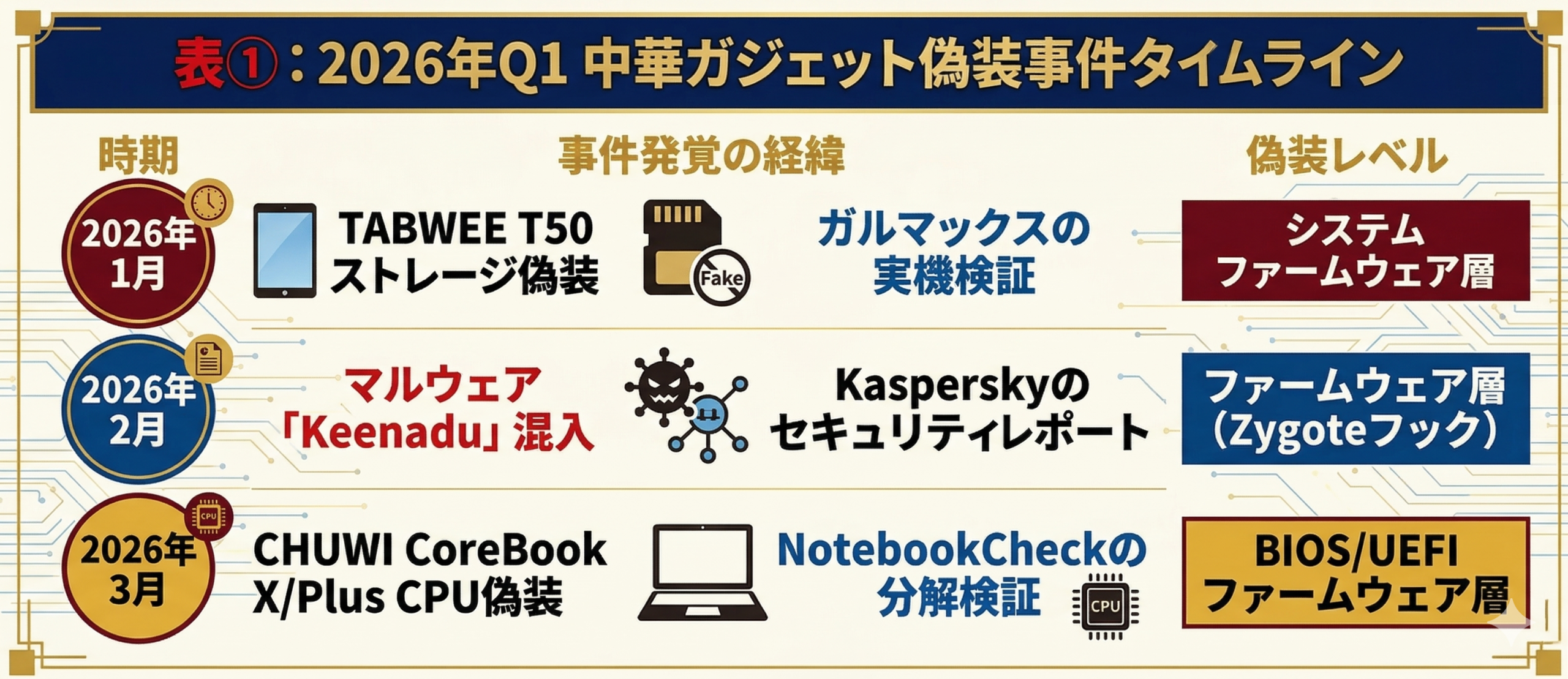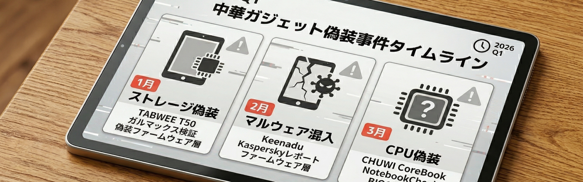 2021年と2026年を比較すると変化は明らか。2021年のCHUWI HiPad Proは「使えば気づく」レベルの虚偽でした。しかし2026年の3事件はいずれもファームウェア最下層に手を加えています。CHUWIではBIOSレベルでCPU識別情報を改ざん、TABWEEではシステム層の容量表示を偽装、Keenaduは正規署名付きファームウェアに混入というワンランク上の領域になっており、もはや従来の検出手法が通用しない世界です。