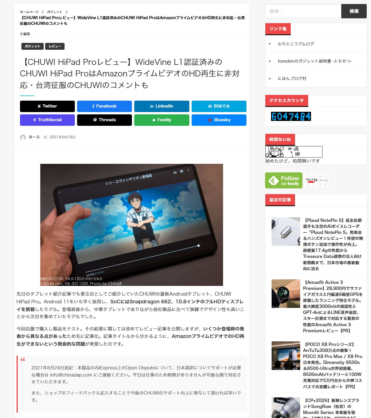 振り返りたいのが、2021年8月に当サイトが報じたCHUWI HiPad Proの件です。販売ページで「AmazonプライムビデオのフルHD再生対応」と謳いながら実際は非対応だったというもの。解像度も2,560×1,600から1,920×1,200にすり替え、画面に文字のにじみが発生するという三重苦な製品でした。