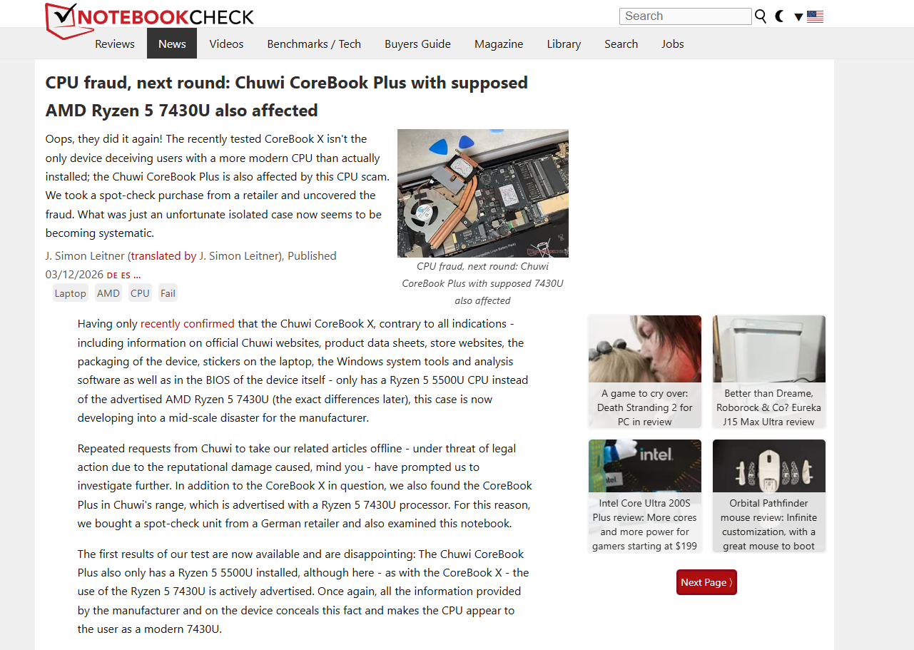 - CPU fraud, next round: Chuwi CoreBook Plus also affected – NotebookCheck