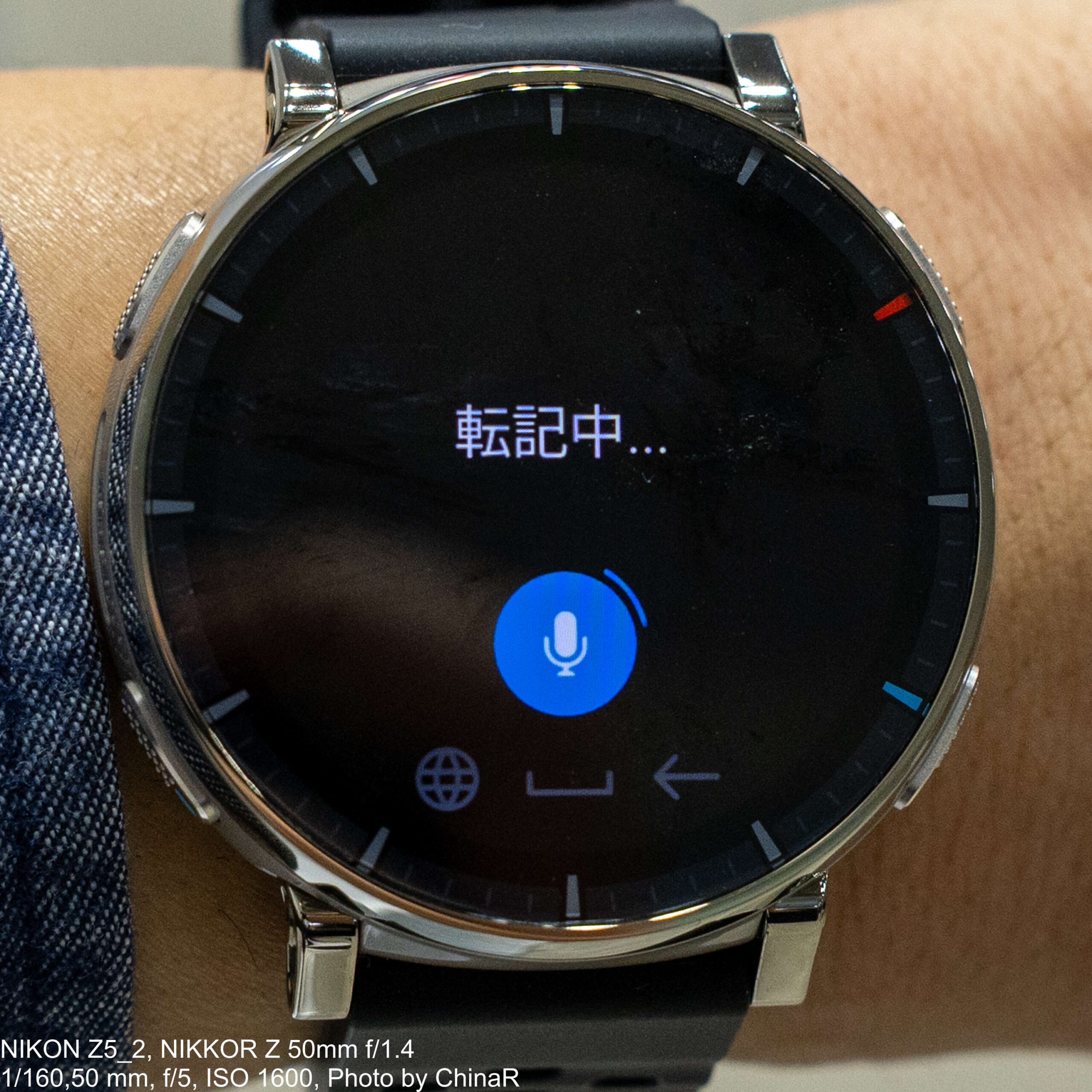 もう一つの方法が音声入力です。マイクアイコンをタップすると「タップして話す」の画面が表示され、日本語で話しかけると「転記中…」を経てテキストに自動変換されます。漢字変換にも対応しており、定型文では伝えきれない自由な文面を作成したいときに重宝。AI生成の3候補から選ぶか、音声で自由に入力するかを場面に応じて使い分けられるのはZepp Flowならではの強みです。