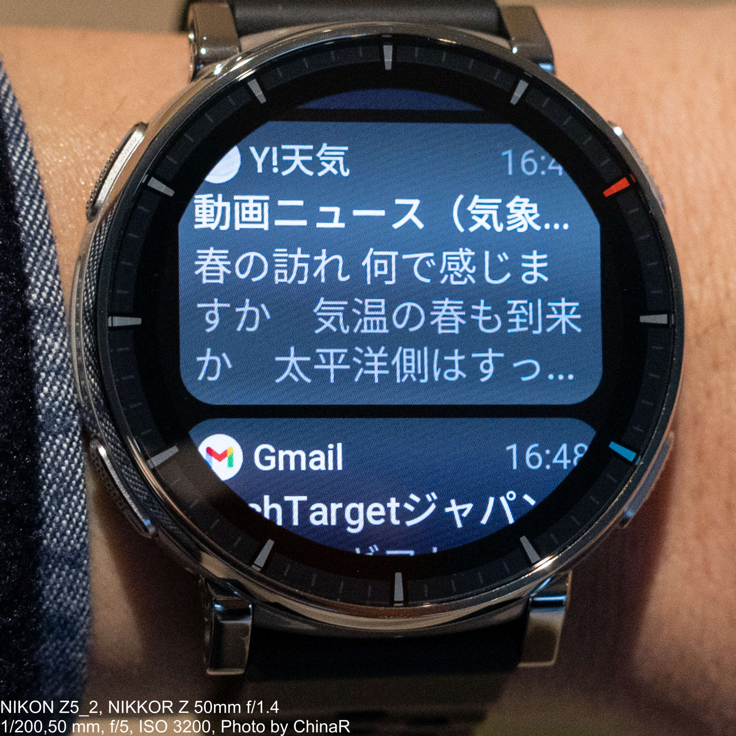 通知機能の完成度は高く、LINE、Gmail、Y!天気など各アプリのアイコン付きで日本語の通知がしっかり表示されます。写真ではY!天気の動画ニュースやGmailの通知を各アプリのアイコンつきで確認が可能。1.32インチ466×466のAMOLEDは文字量が多い通知でも十分に読み取れる視認性です。