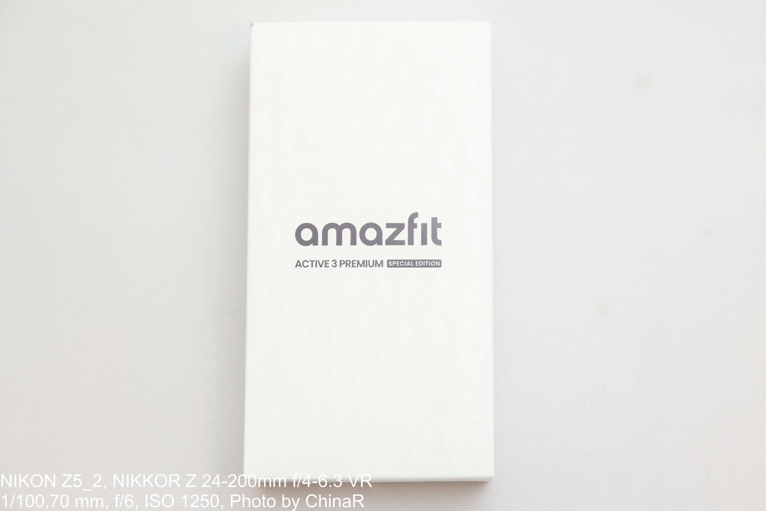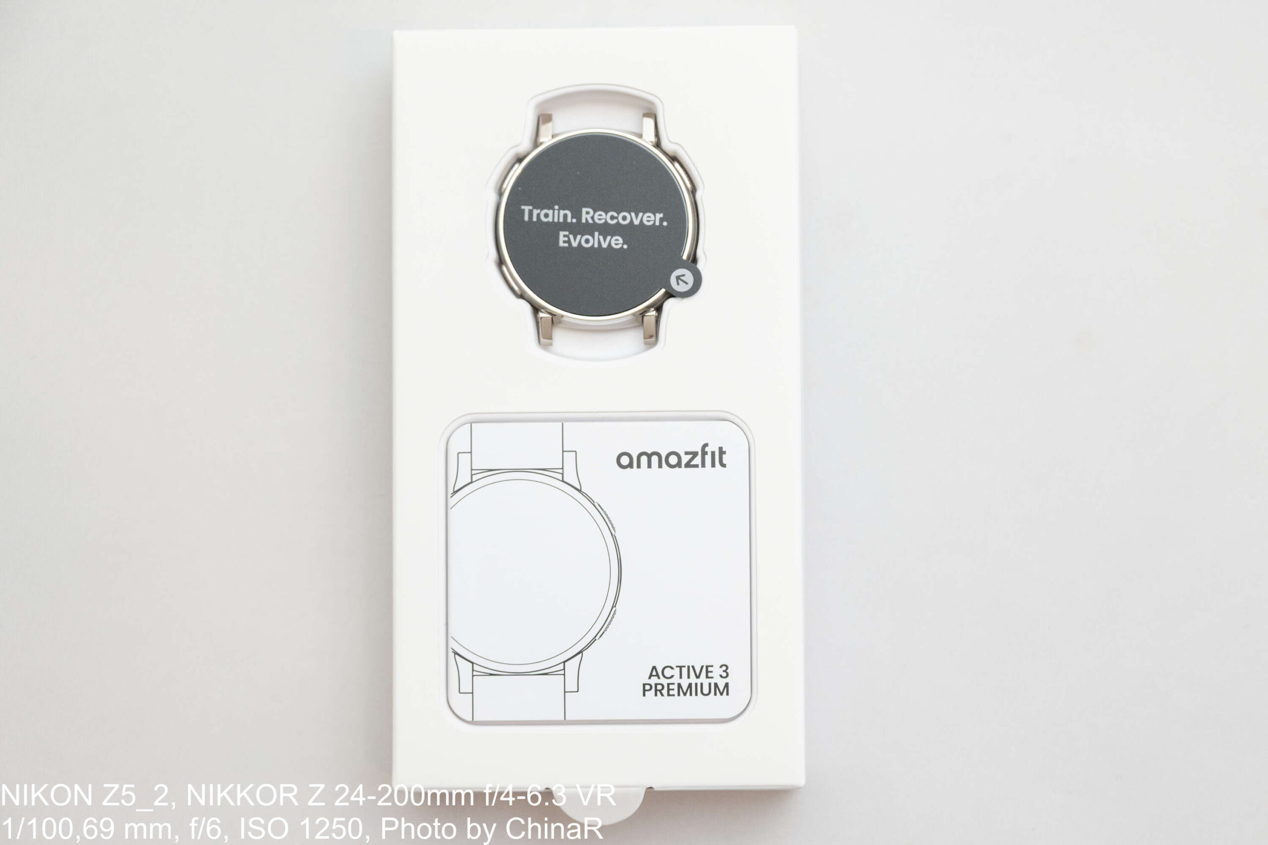 パッケージはマットホワイトの箱に「amazfit ACTIVE 3 PREMIUM SPECIAL EDITION」の文字のみというミニマルなデザインで、28,900円のランニングウォッチとは思えないプレミアム感を演出しています。箱を開けると「Train. Recover. Evolve.」のメッセージが印刷された本体がお目見え。同梱物はウォッチ本体(ストラップ装着済み)、マグネット式充電ケーブル、取扱説明書の3点という必要最低限の構成です。