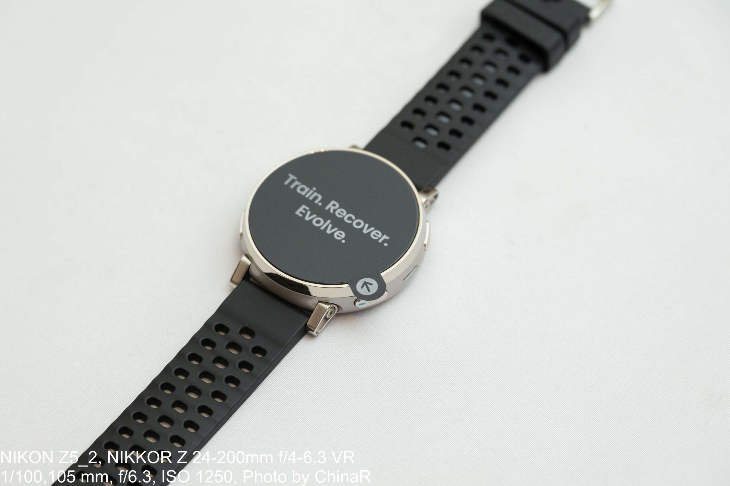 本体サイズは45.0×45.0×11mmで、重量は本体38g、ストラップ込みで54.6gです。ステンレススチールと繊維強化樹脂のハイブリッド構成で、手に取った第一印象は「思ったよりシンプル」という感覚。側面の4ボタンはグローブ越しでもカチッとした確実なフィードバックがあります。ストラップは20mm幅のシリコン素材でクラシックピンバックルを採用しており、ランニング中の汗にも滑りにくく、24時間ほぼ終日装着しても違和感がありませんでした。