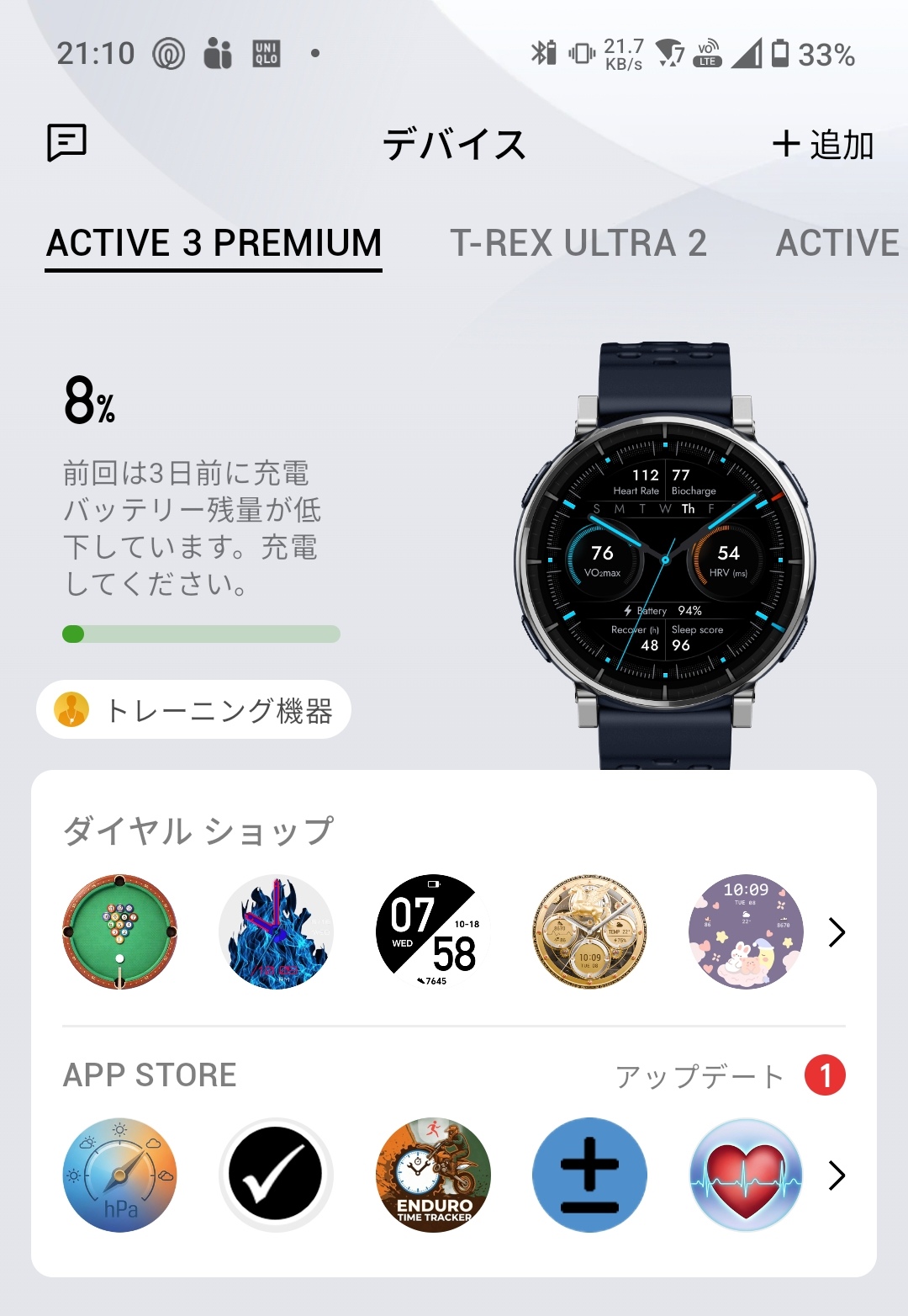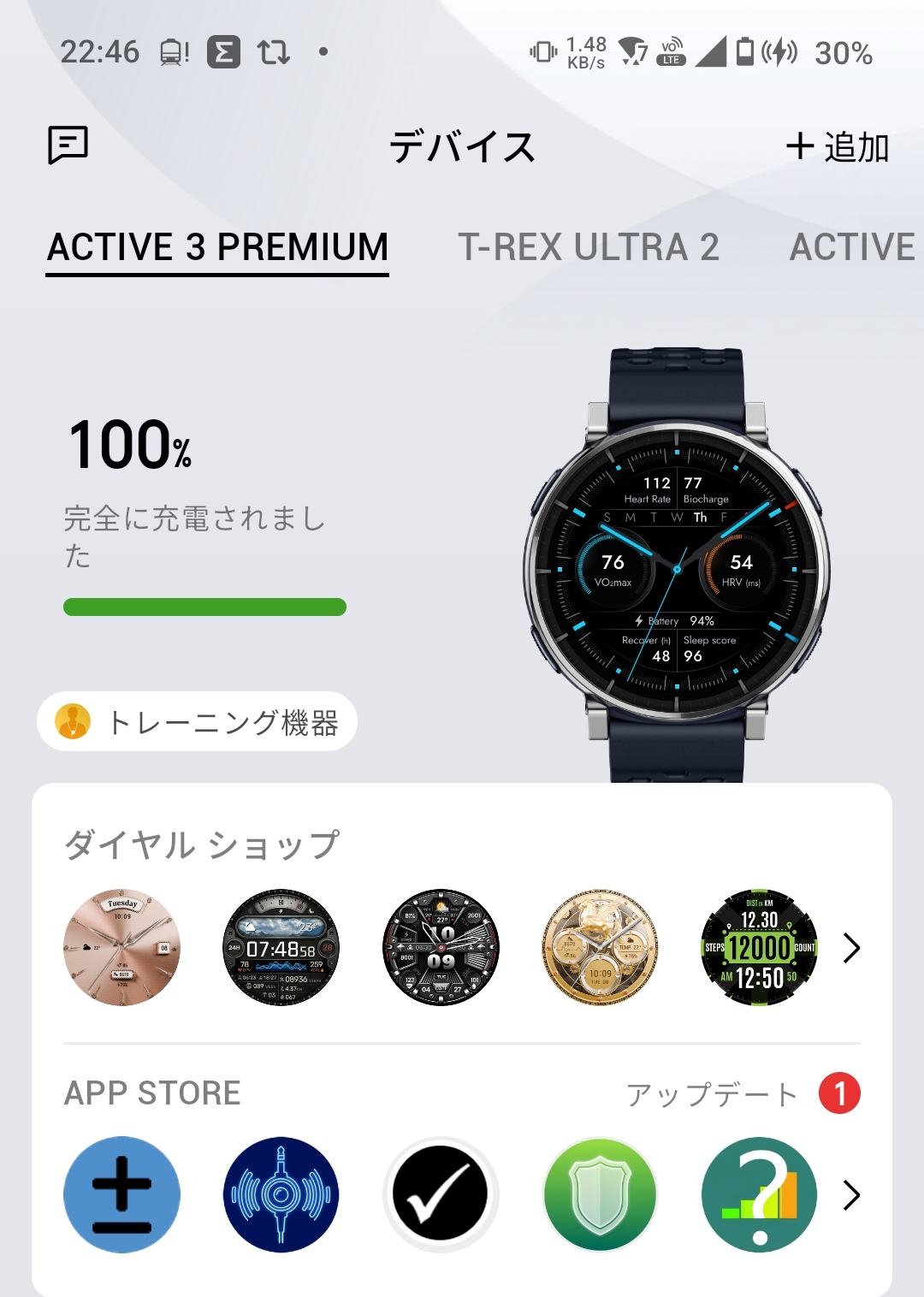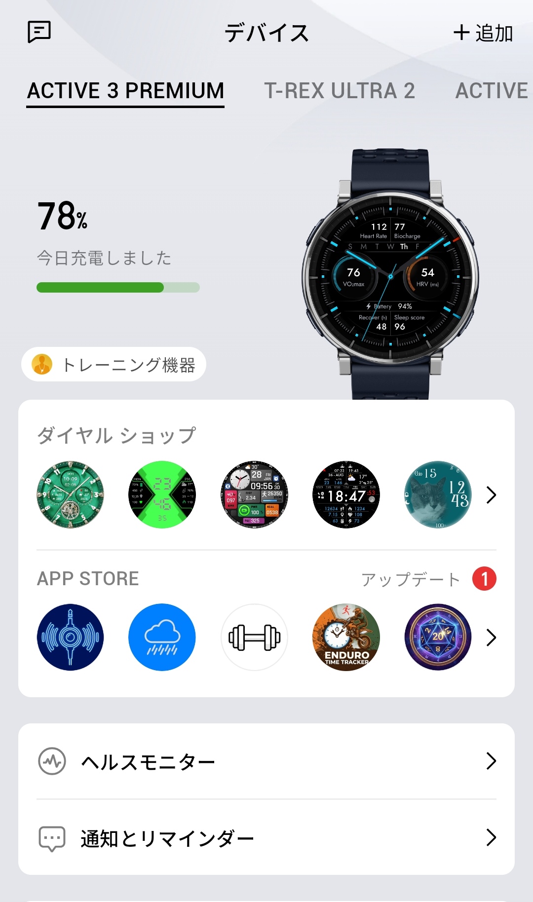 Zeppアプリのデバイスタブにある「ダイヤル ショップ」からは、多彩なウォッチフェイスをダウンロードして切り替えることができます。アナログ調のクラシカルなデザインから、歩数やカロリーなどのデータをびっしり表示するスポーツ系、温度計やカラフルなゲージを配したデザイン性の高いものまでバリエーションは豊富。ビジネスシーンではシンプルなアナログ系、ランニング時にはデータ表示重視のスポーツ系とTPOに応じて使い分けられるのが便利です。