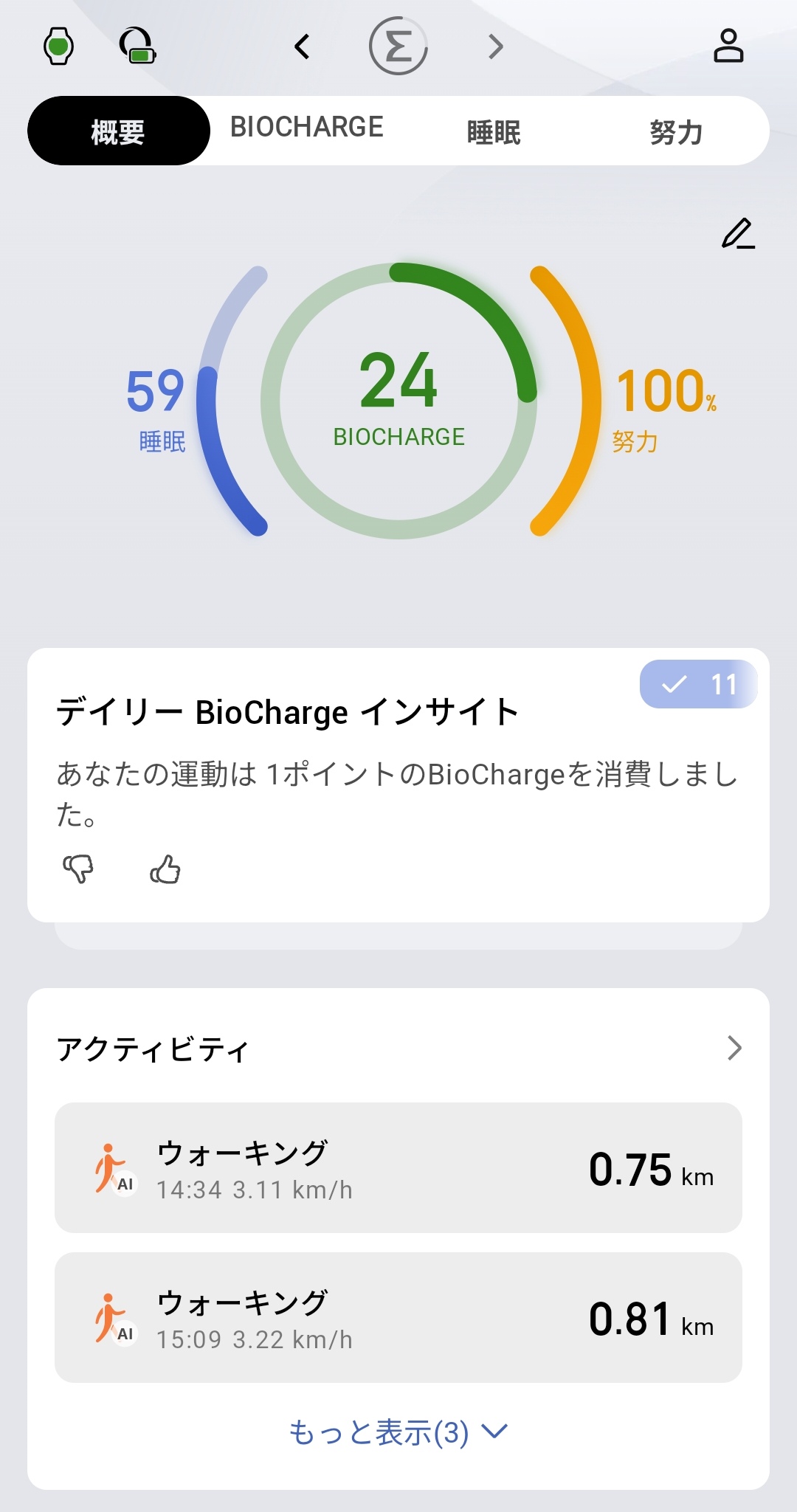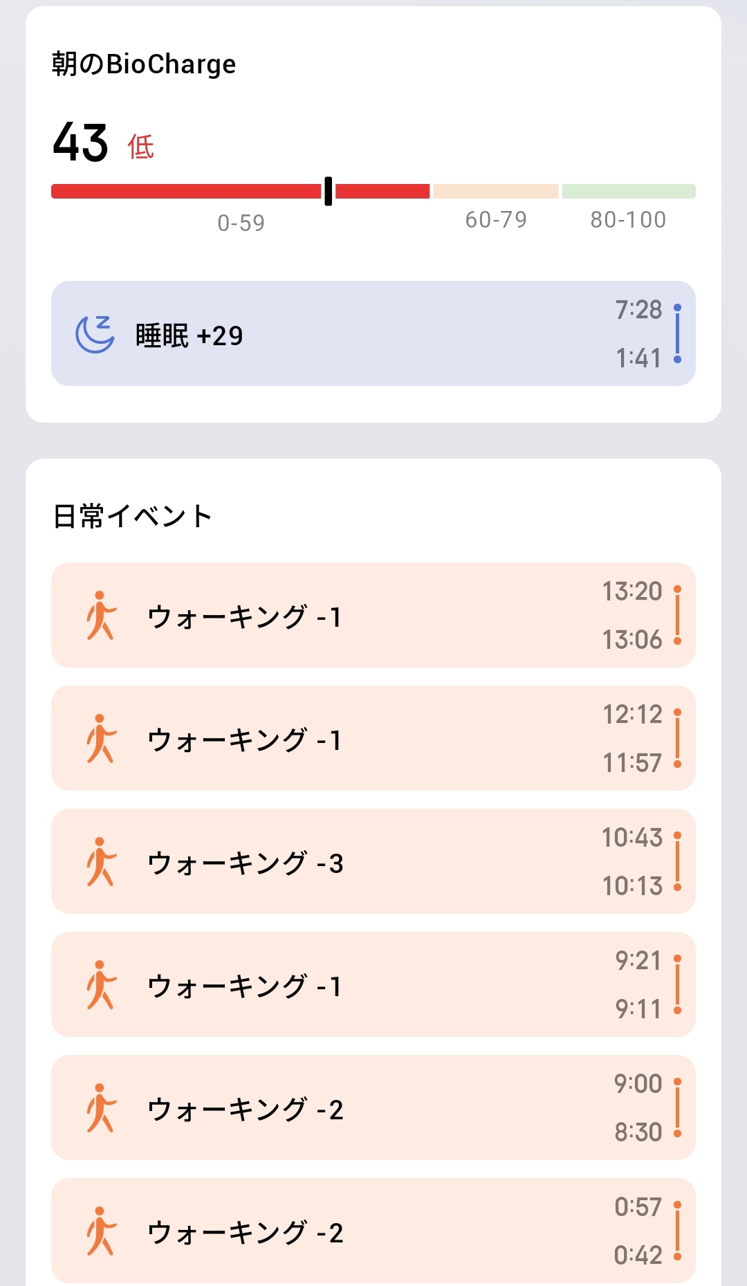 その下には朝のBioCharge 43(低)と、睡眠(1:41〜7:28 +29ポイント)、日常イベントとしてAI自動検出されたウォーキング6回(8:30〜13:20)が時系列で並んでいます。装着しているだけで通勤や買い物の歩行を自動的に検出・記録し、それぞれがBioChargeにどう影響しているかまで可視化してくれるのは非常に便利です。
