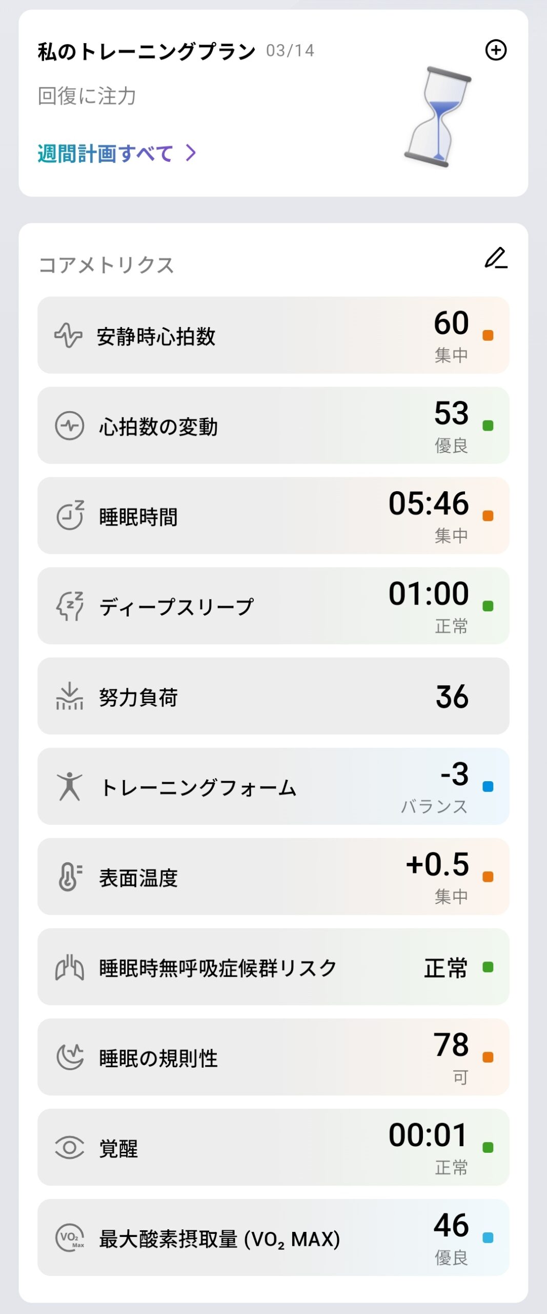 Zeppアプリのホーム画面は「概要」「BIOCHARGE」「睡眠」「努力」の4つのタブで構成されています。概要タブでは、アクティビティの状況や、コアメトリクスとして安静時心拍数60(集中)、心拍数の変動53(優良)、睡眠時間05:46(集中)、ディープスリープ01:00(正常)、努力負荷36、トレーニングフォーム-3(バランス)、表面温度+0.5(集中)、睡眠時無呼吸症候群リスク正常、睡眠の規則性78(可)、覚醒00:01(正常)、VO2 MAX 46(優良)がスコアリング付きで一覧表示されています。
