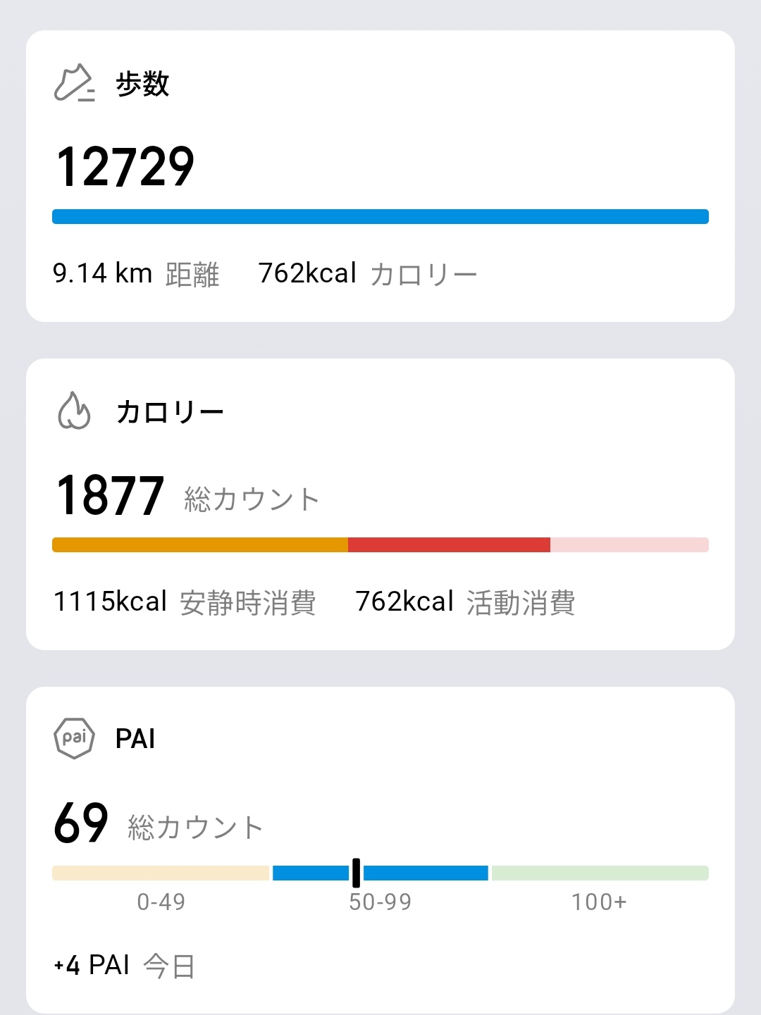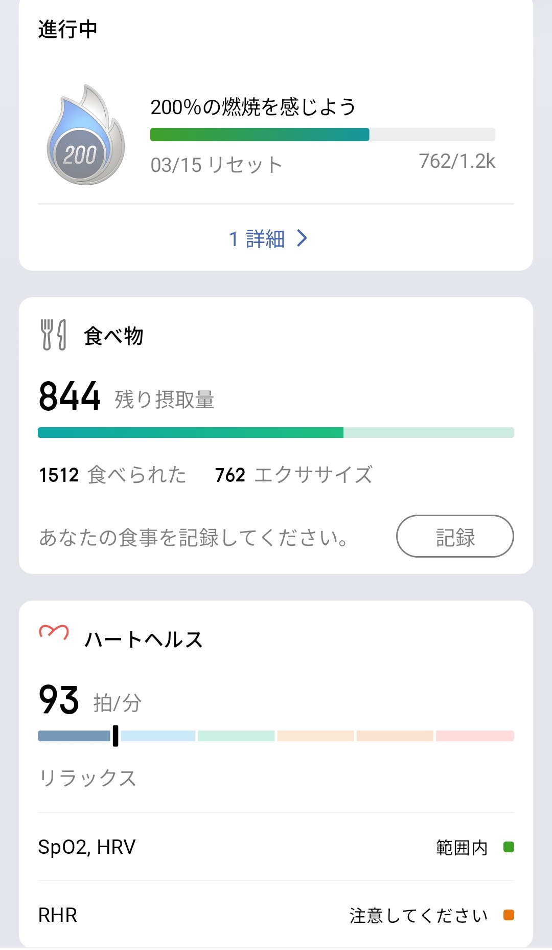 進行中のBioChargeチャレンジ「200%の燃焼を感じよう」(762/1.2k)、食べ物の残り摂取量844kcal(食べられた1512・エクササイズ762)、ハートヘルス93拍/分(リラックス状態)、SpO2/HRVは範囲内、RHRは「注意してください」という評価がカード形式で並んでいます。さらにスクロールすると、歩数12,729歩(9.14km・762kcal)、カロリー1,877(安静時1115kcal+活動762kcal)、PAI 69(+4 今日)が確認可能で、一通りの健康状態を一画面で確認できるようになっています。