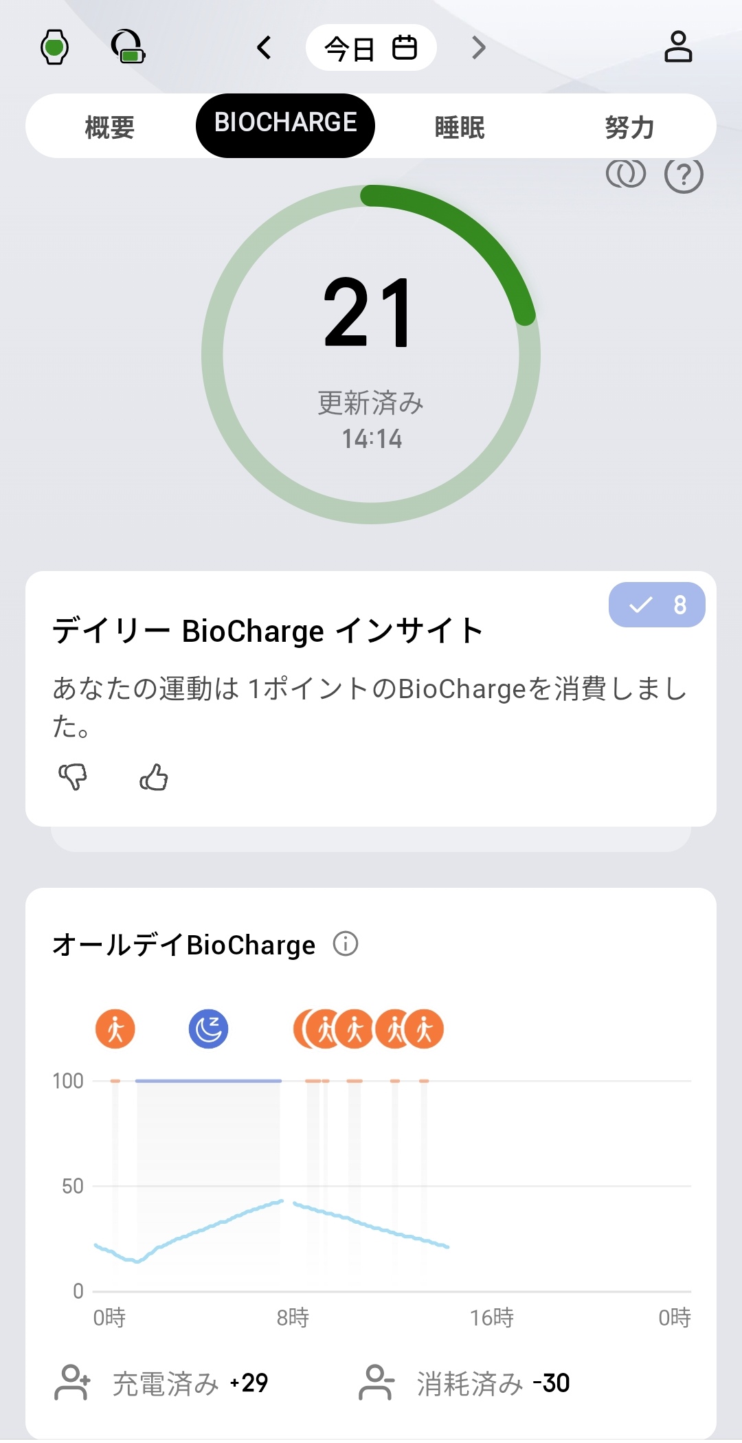 BIOCHARGEタブでは、中央にスコアが大きく表示され、サークルプログレスバーで残量を視覚的に把握できます。「あなたの運動は1ポイントのBioChargeを消費しました」というAIインサイトに加え、オールデイBioChargeグラフでは充電済み+29(睡眠)と消耗済み-30(運動・日常活動)の内訳が時間軸で表示されています。