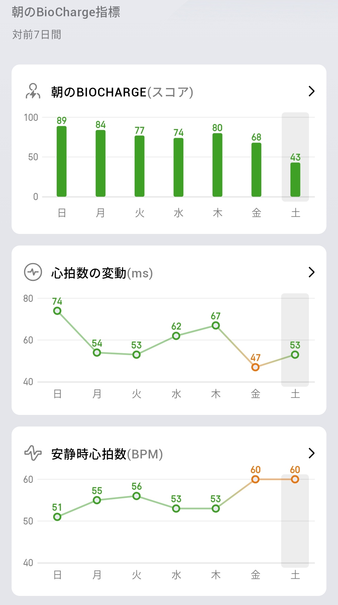 朝のBioCharge指標を過去7日間で比較することも可能。私の場合、週末は朝のBioChargeが良い状態でしたが週半ばにはどんどん低下。そして土曜日には生活習慣の乱れなどもあってかかなり低い結果に。これと同じようにHRV(心拍変動)や安静時心拍数も土曜日にかけて黄色の要注意ゾーンに入っていっているのが見て取れました。疲労の蓄積や体の状態を確認できることで、生活習慣を見直せるようになるのがBioCharge機能のポイントと言えます。