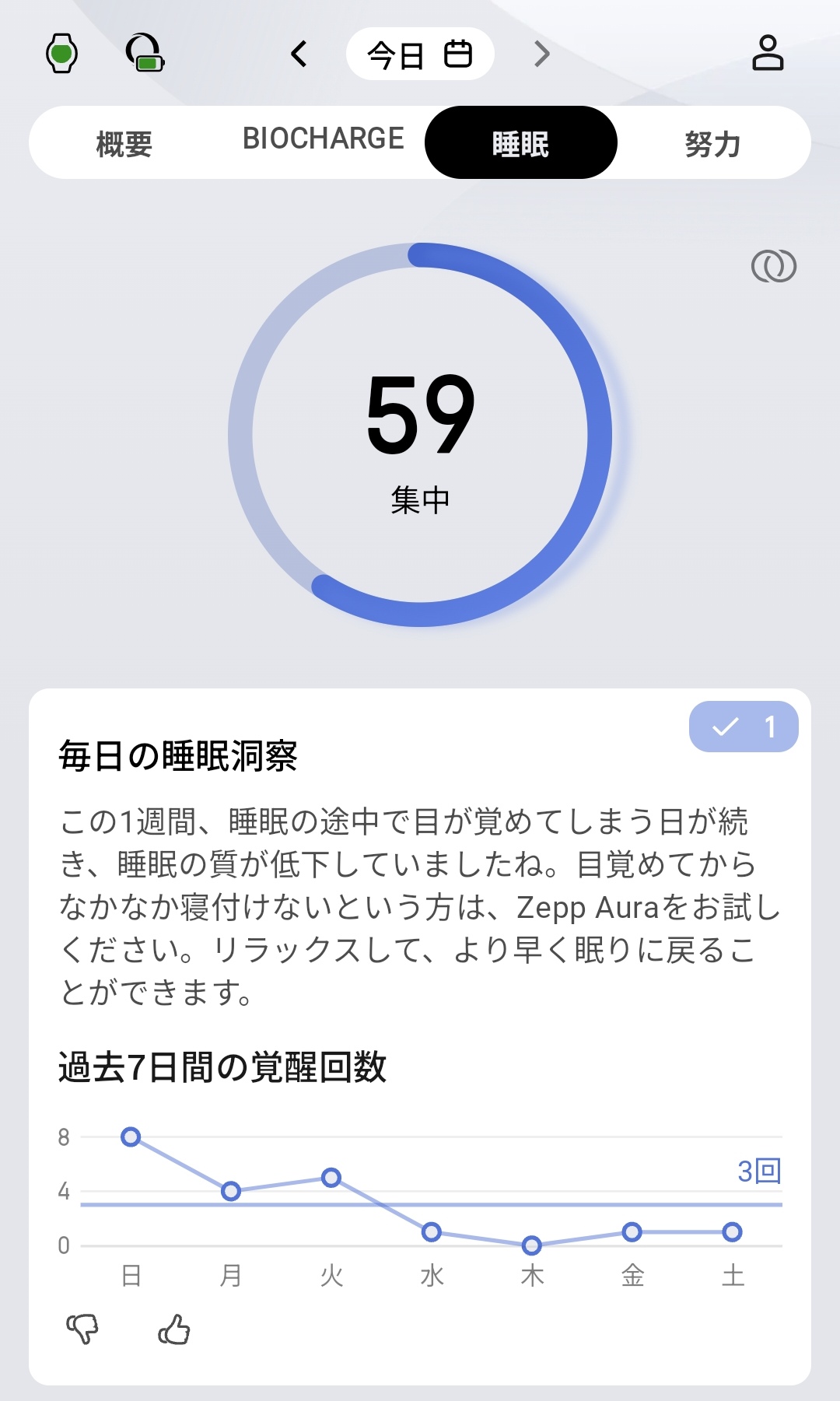 睡眠タブでは、中央にスコア59(集中)がリングで表示されます。毎日の睡眠洞察として「この1週間、睡眠の途中で目が覚めてしまう日が続き、睡眠の質が低下していましたね。目覚めてからなかなか寝付けないという方は、Zepp Auraをお試しください」というAIフィードバックと過去7日間の覚醒回数グラフ(日曜8回→土曜1回と改善傾向)が表示。これもBioChargeと同じように1週間の中でその質の推移をひと目で確認ができるようになっています。