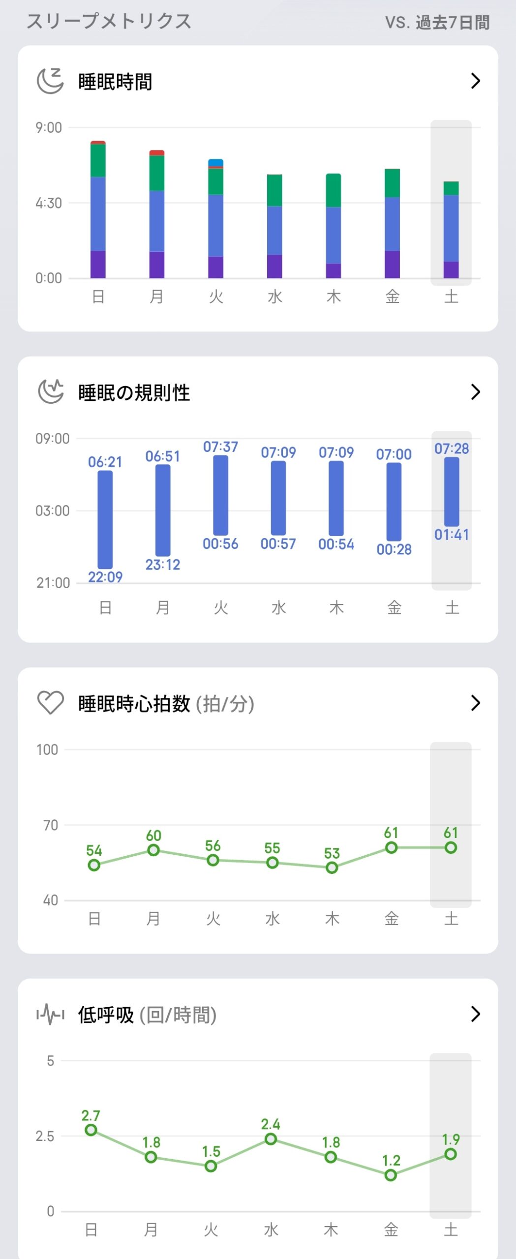 スリープメトリクスをスクロールすると、過去7日間の睡眠時間の推移が深い眠り(紫)、浅い眠り(青)、REM(緑)、覚醒(赤)で色分けされた積み上げグラフで表示されます。睡眠の規則性グラフでは入眠時刻(日曜22:09→土曜01:41)と起床時刻(日曜06:21→土曜07:28)の推移も確認可能。睡眠時心拍数は54→60→56→55→53→61→61拍/分で安定しており、低呼吸(無呼吸リスク)は2.7→1.8→1.5→2.4→1.8→1.2→1.9回/時間で推移していた様子も確認できました。