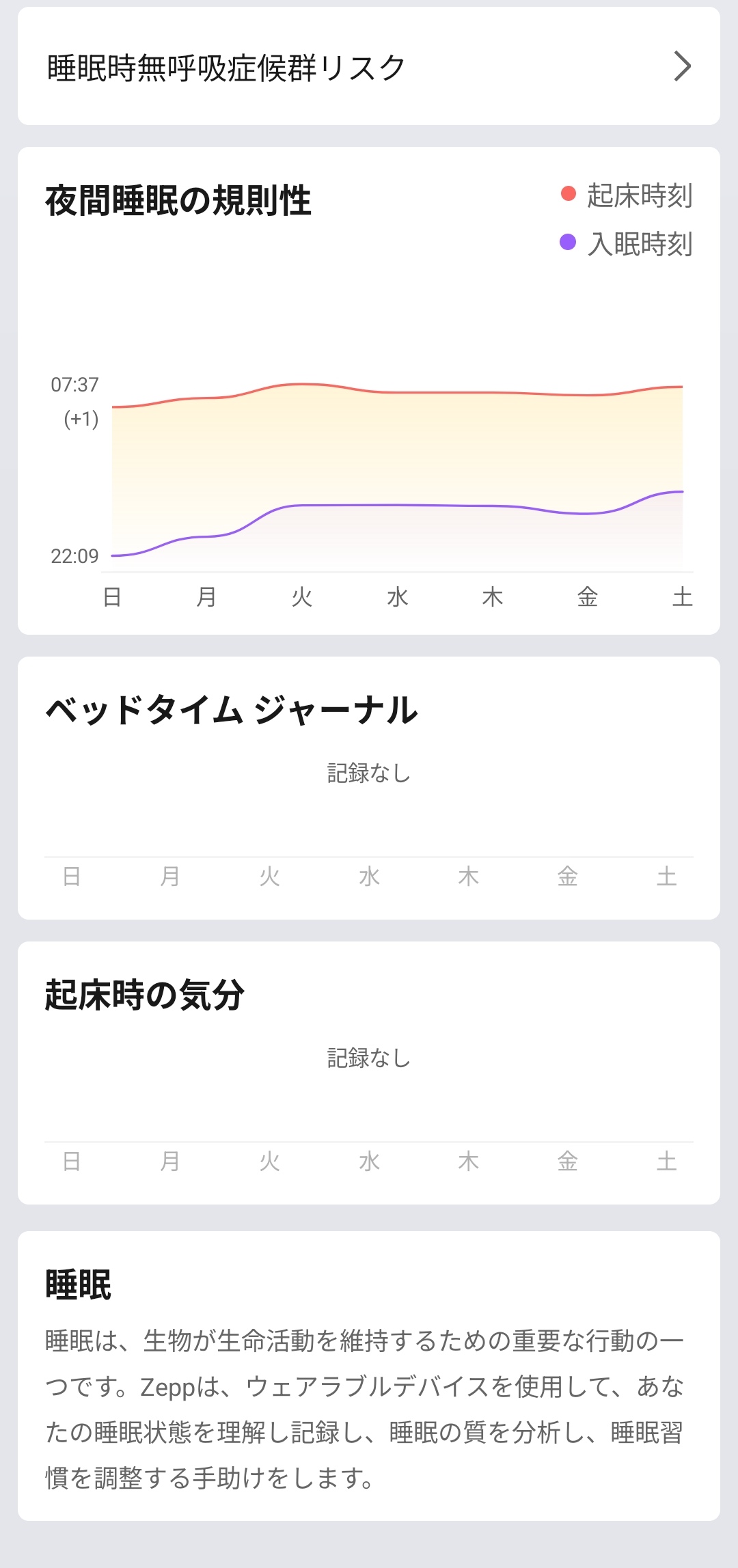 睡眠時間のグラフや、各注意すべき指標もスリープメトリクスとしてまとめてくれています。睡眠時間だけでなく、睡眠の規則性、ディープスリープの時間と割合やレム睡眠の状態、覚醒の回数、時間もまとめてくれます。