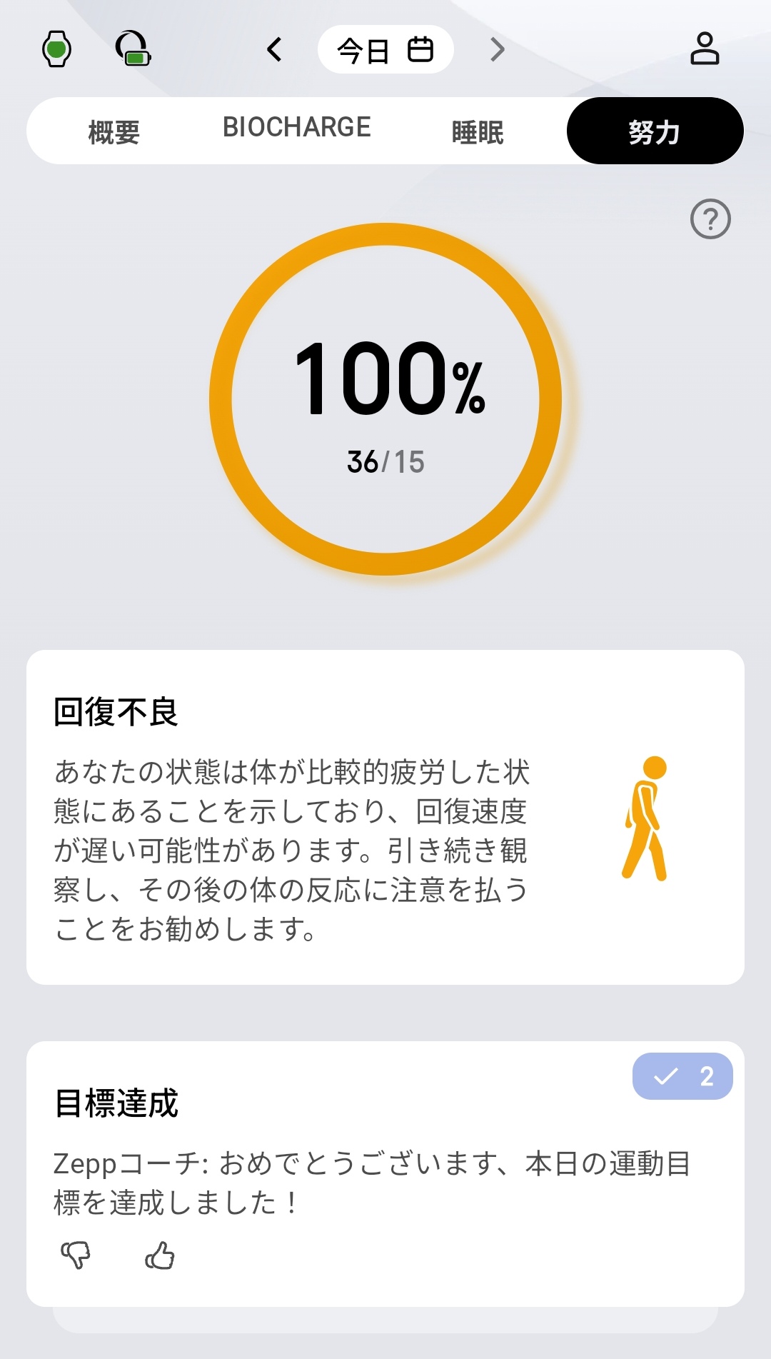 努力タブでは、その日の運動目標に対する達成度がリングで表示されます。この日は100%(36/15)を達成。「回復不良」として「体が比較的疲労した状態にあることを示しており、回復速度が遅い可能性があります」というAIフィードバックと、「目標達成 Zeppコーチ: おめでとうございます、本日の運動目標を達成しました!」というメッセージが表示されています。