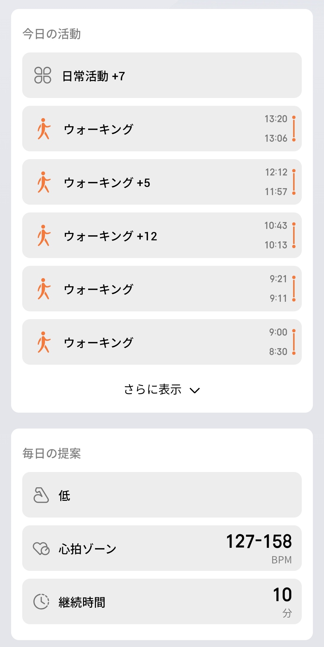 今日の活動として日常活動+7ポイント、ウォーキング5回(8:30〜13:20の間に自動検出)が一覧表示されており、「毎日の提案」として心拍ゾーン127-158BPM、継続時間10分という具体的な運動アドバイスも提示されています。ウォッチを装着しているだけで通勤や買い物の歩行を自動認識してくれるのは非常に便利でした。